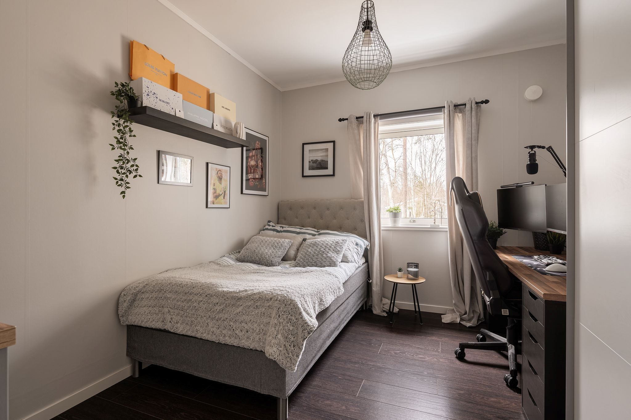 Planlösningen är dessutom smart utformad med möjlighet att enkelt sätta upp en vägg och skapa ytterligare ett sovrum vid behov. Ett hem som anpassar sig efter livet, helt enkelt.
