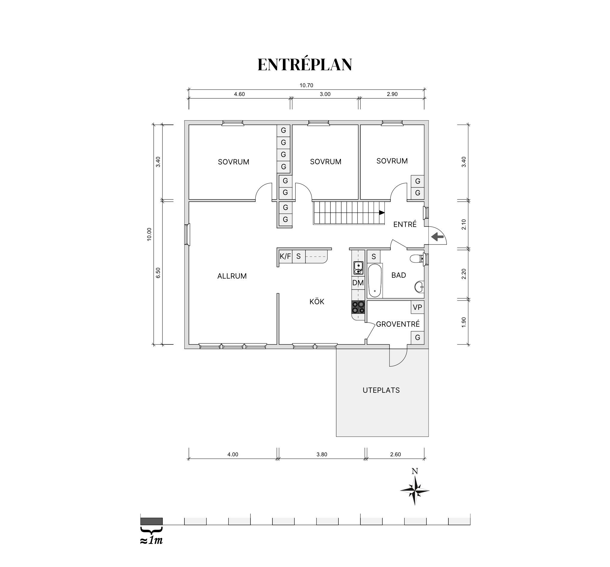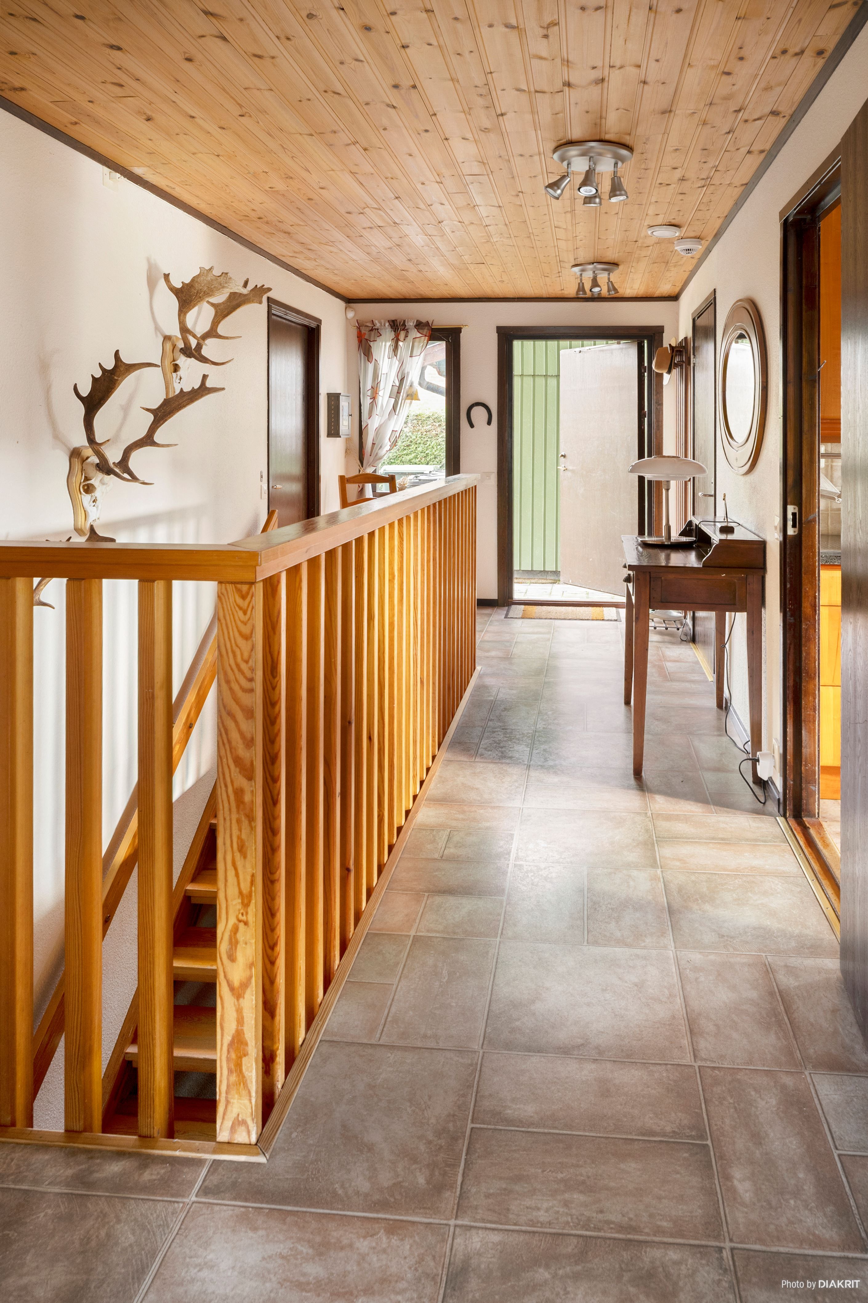 På entréplanet möts du av en inbjudande hall som leder vidare till ett stort och ljust vardagsrum med klassiskt parkettgolv. Här finns gott om plats både för middagsbord och soffgrupp, och rummets generösa fönster skapar en behaglig atmosfär. Köket är rymligt och funktionellt med luckor i körsbärsträ, bänkskiva i sten och en nyare diskmaskin från 2024. Tre sovrum, varav två med inbyggda garderober, ger plats åt hela familjen, och ett badrum med badkar kompletterar detta våningsplan. Från groventrén nås den stenlagda uteplatsen i soligt söderläge – perfekt för sommarens måltider och avkoppling.