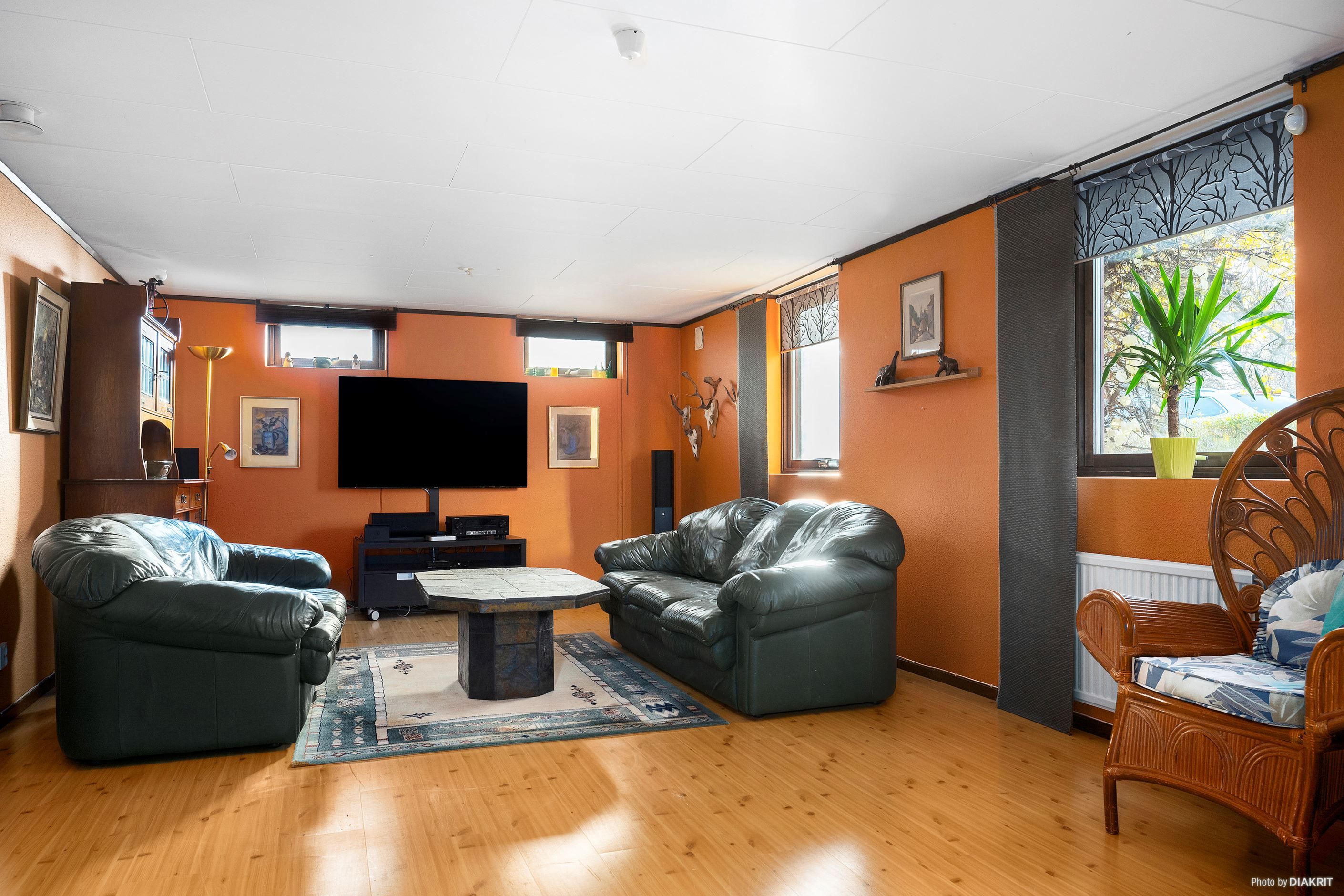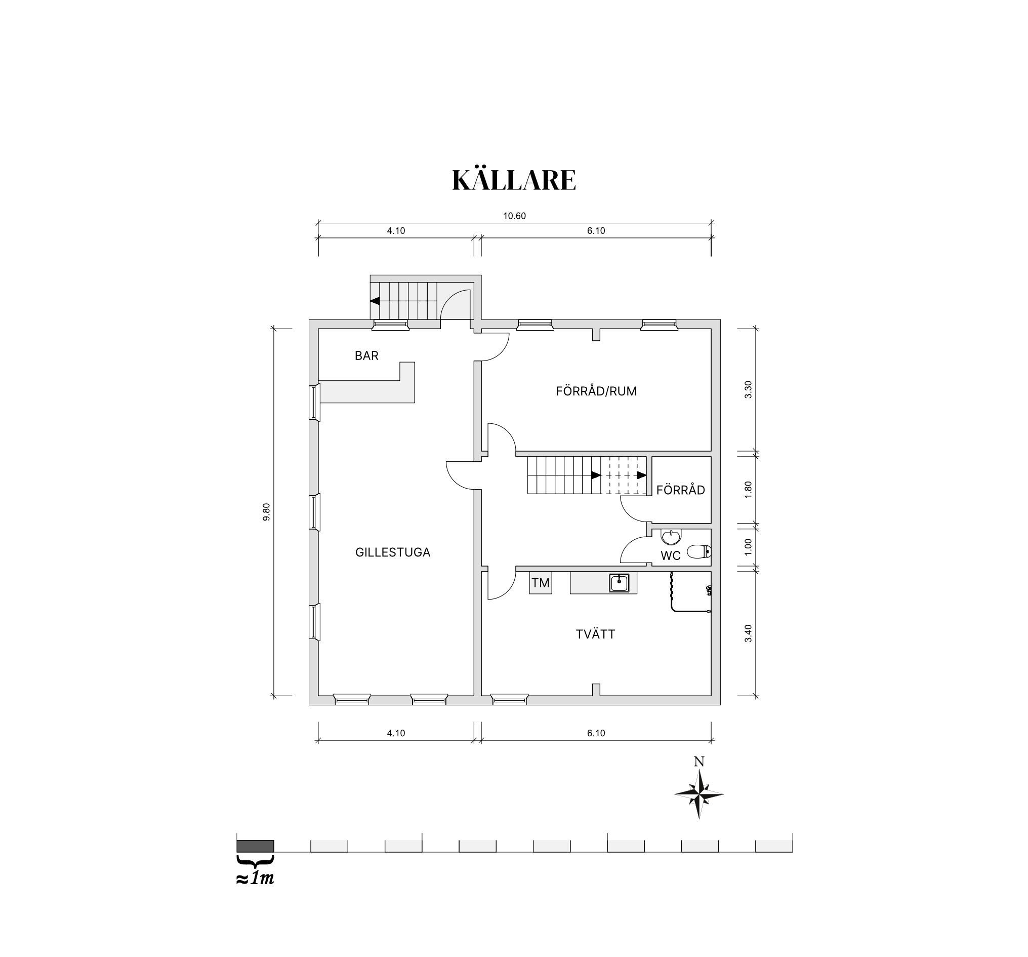Husets sutterängvåning erbjuder stora och flexibla ytor som kan anpassas efter behov och livssituation. Här finns en rejäl gillestuga, ett hobbyrum, tvättstuga med dusch, gästtoalett och matkällare.
