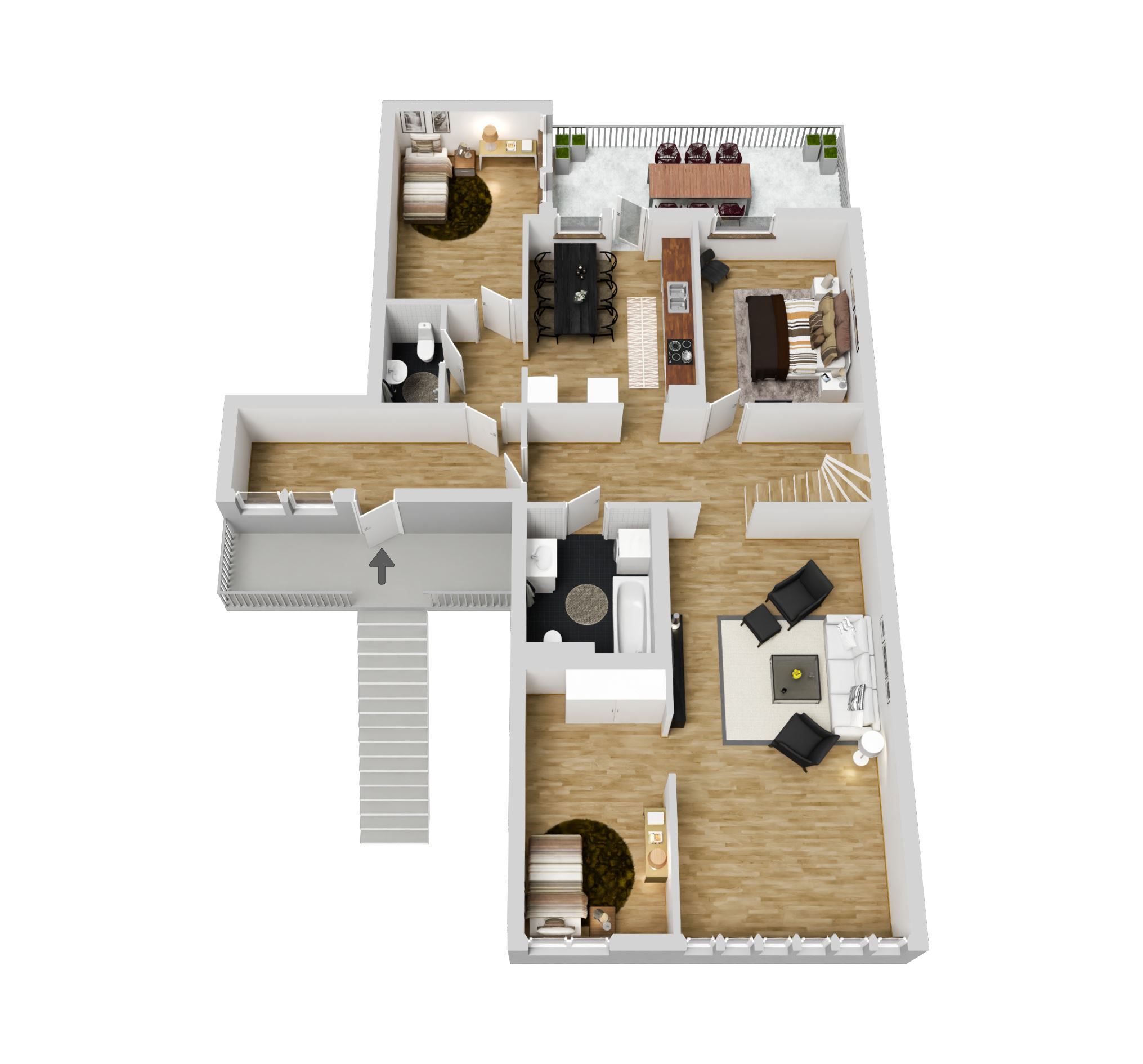Entréplanet rymmer kök, vardagsrum, tre sovrum, två badrum samt goda förvaringsmöjligheter vilket ger ett mycket praktiskt boende för både familj och den som vill ha utrymme för hemmakontor eller gäster. Köket är en naturlig samlingspunkt med sin stilrena utformning och goda arbetsytor, och härifrån nås balkongen som ligger skyddat i ett trivsamt solläge. Markisen ger skönt skydd mot solen och gör balkongen användbar under större del av dagen, oavsett om du vill äta middag ute eller bara koppla av.