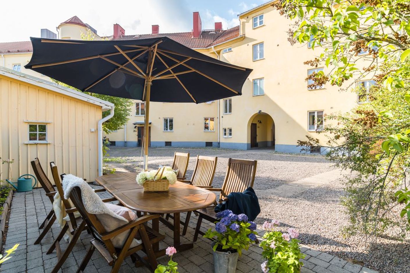 Ett smakfullt kök med ljuvlig interiör och eget skafferi och extra förvaring! Här finns gott om yta för stort matbord att bjuda gästerna på en förstaklassig måltid vid och blicka ut mot de vackra fasaderna och takåsarna. Innergården nedanför är ett extra plus med grillmöjligheter och plats att njuta på. Lägg där till ett rejält tilltaget vardagsrum som rymmer en större soffa och matplats vid fönstret, detta rum ligger i fil med sovrummet. I sovrummet finns en naturlig plats för dubbelsängen och supersmart förvaringslösning i form av fyra garderober. Här finns även en naturlig del för arbetshörna om man inte väljer att lägga denna i vardagsrummet som även det bjuder en naturlig plats för skrivbordsdel och hemmakontor. Extra bekvämt med dubbla lägenhetsförråd, ett på vinden och ett i källarplan.