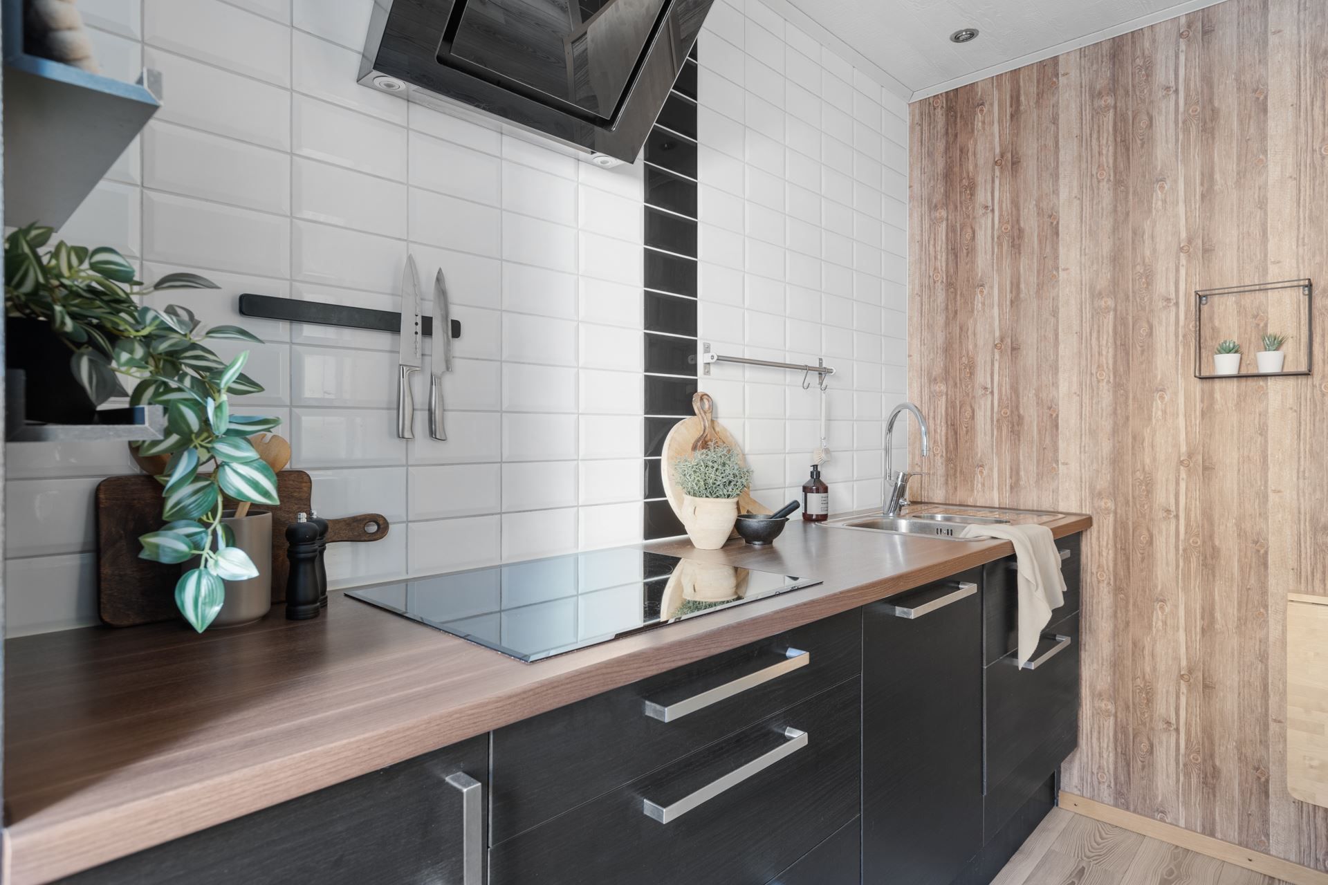Interiört moderna val och material. Disponeringen av rummen är utmärkta med sovrum och kök i öst och vardagsrum som förlängs med balkong i väst. Badrummet är helkaklat. Dessutom följer dubbla lägenhetsförråd med bostaden för sådant du önskar tillgång till mindre ofta, ett på vinden och ett i källarplan.