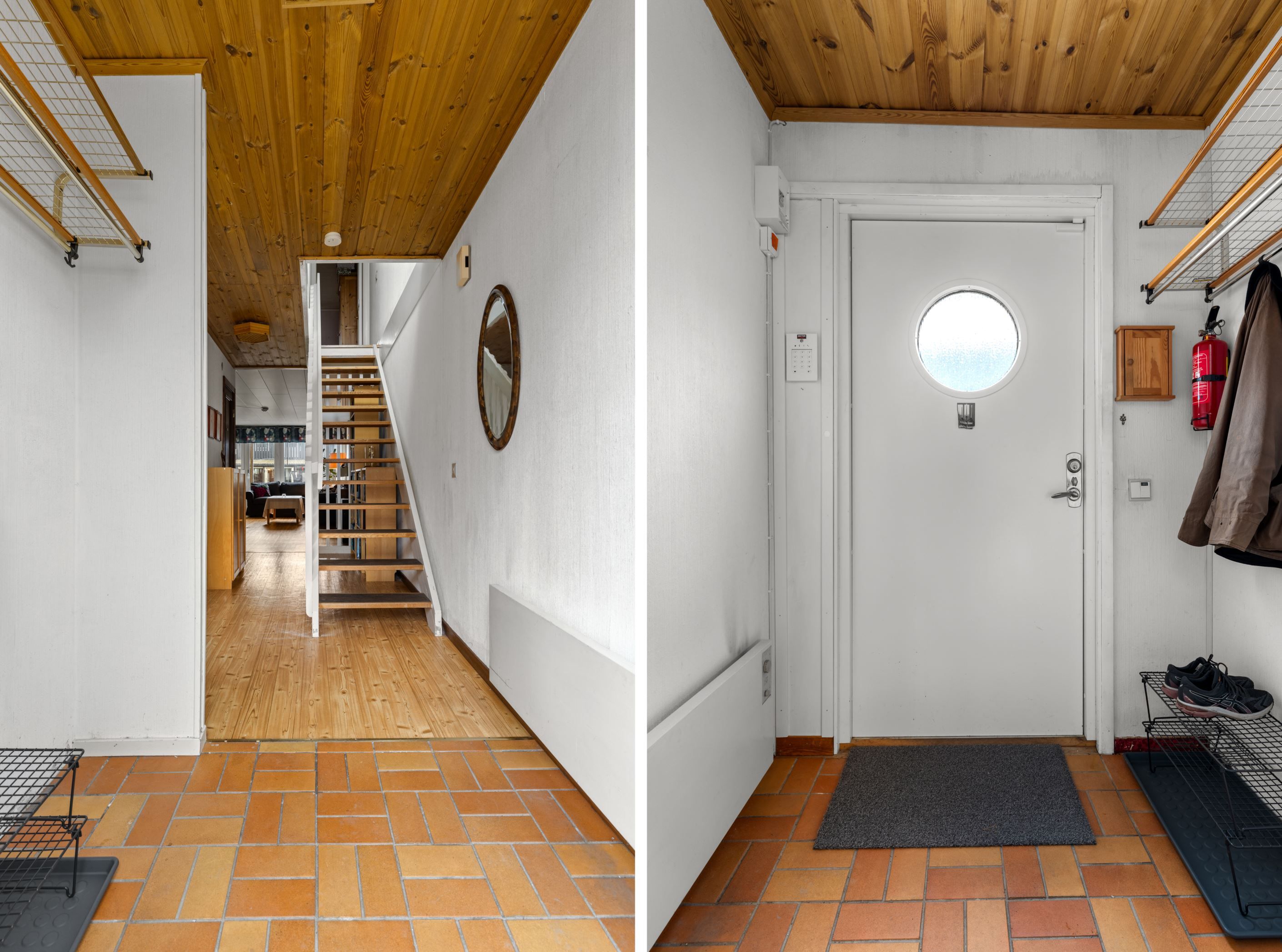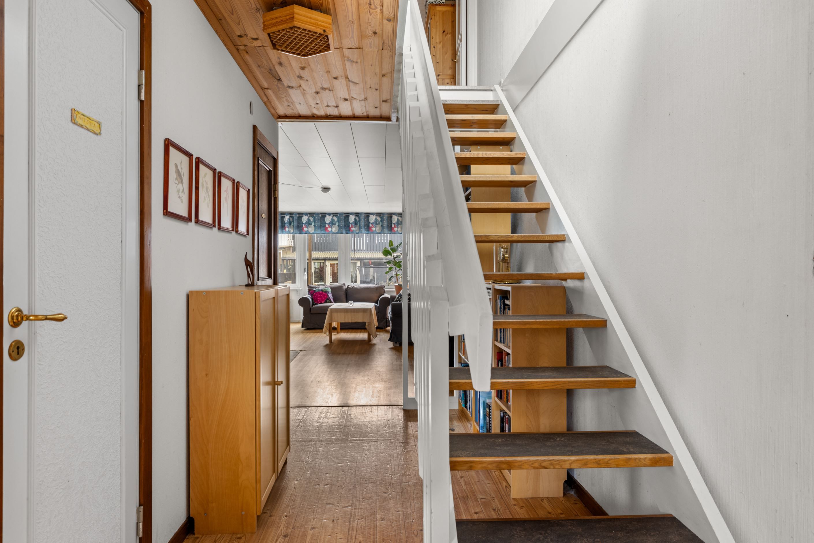 Entréplanet välkomnar med hall och ett kök med matplats där det är lätt att samla familj och vänner. Innanför köket finns ett praktiskt förråd och vidare i huset finns tvättstuga och WC, smidigt placerade för en fungerande vardag. Vardagsrummet är generöst och blir den naturliga samlingspunkten, med utgång till altan och trädgård i soligt sydvästläge – en härlig plats för långa sommarkvällar, lek i det gröna och avkoppling i solen. På entréplanet finns också ett sovrum, perfekt som föräldrasovrum, gästrum eller arbetsrum.