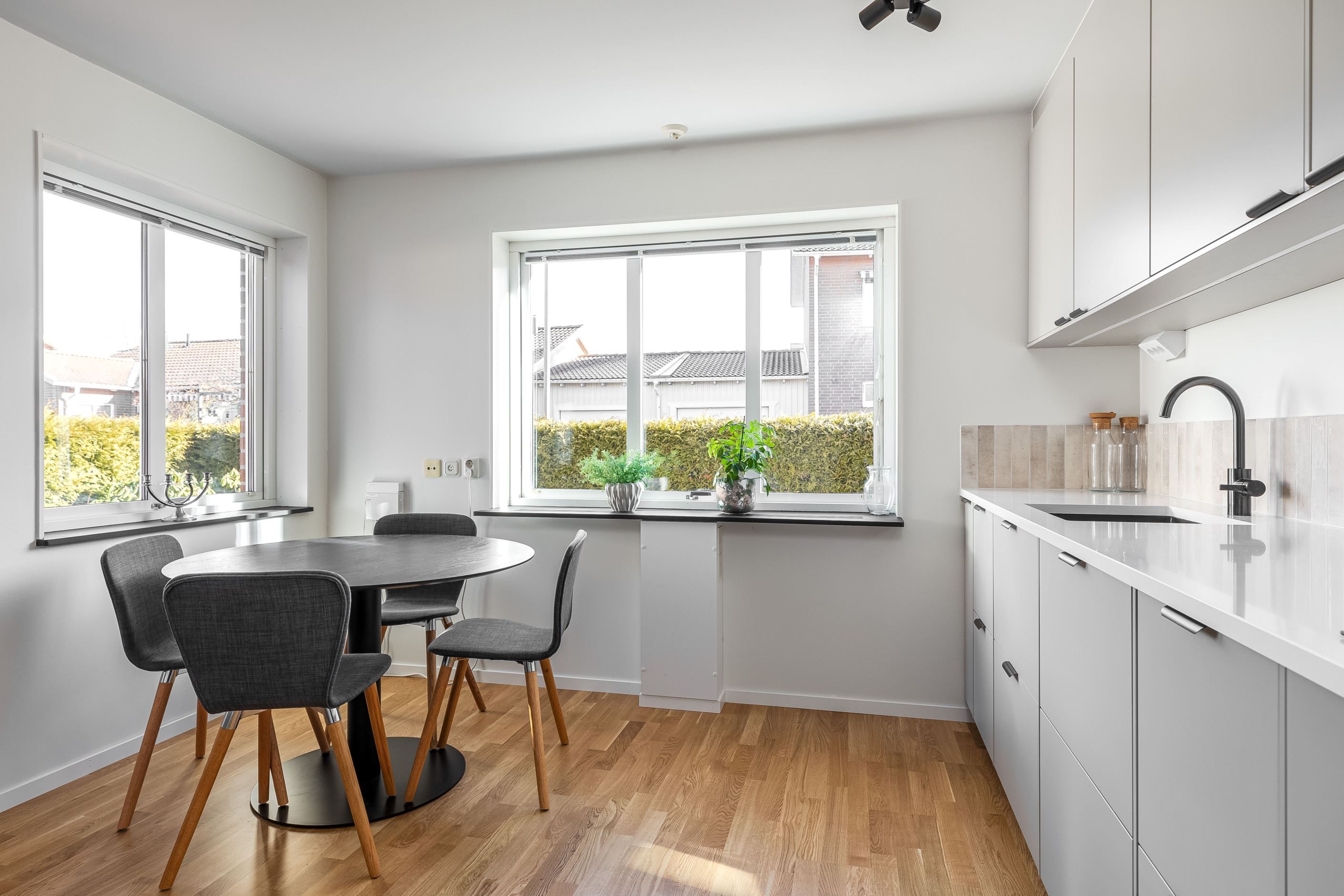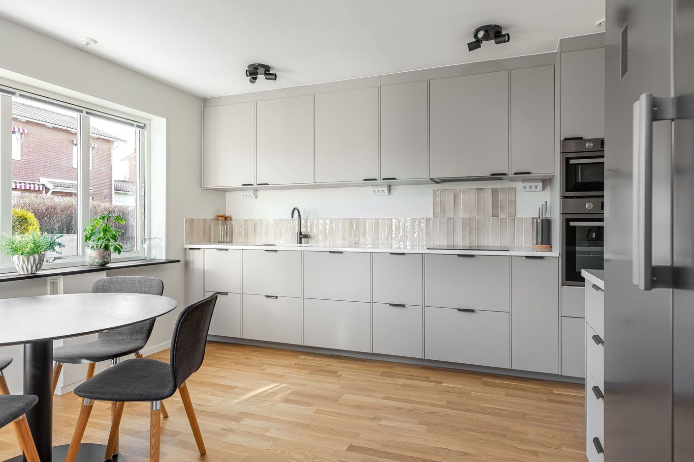 Interiört har huset fått fin omtanke senaste åren där vägg- och golvytskikten renoverats med varsam hand. Här möts du av mycket smakfulla färg- och materialval där de målade väggarna i lugna toner harmoniserar med det fina parkettgolvet. Köket är rymligt och har gott om förvaringsutrymmen och fin stenbänksskiva - hela köket ger en modern och inbjudande känsla. Intill köket ligger tvättstugan som inrymmer både tvättmaskin, torktumlare, skåp för förvaring samt tvättho.
