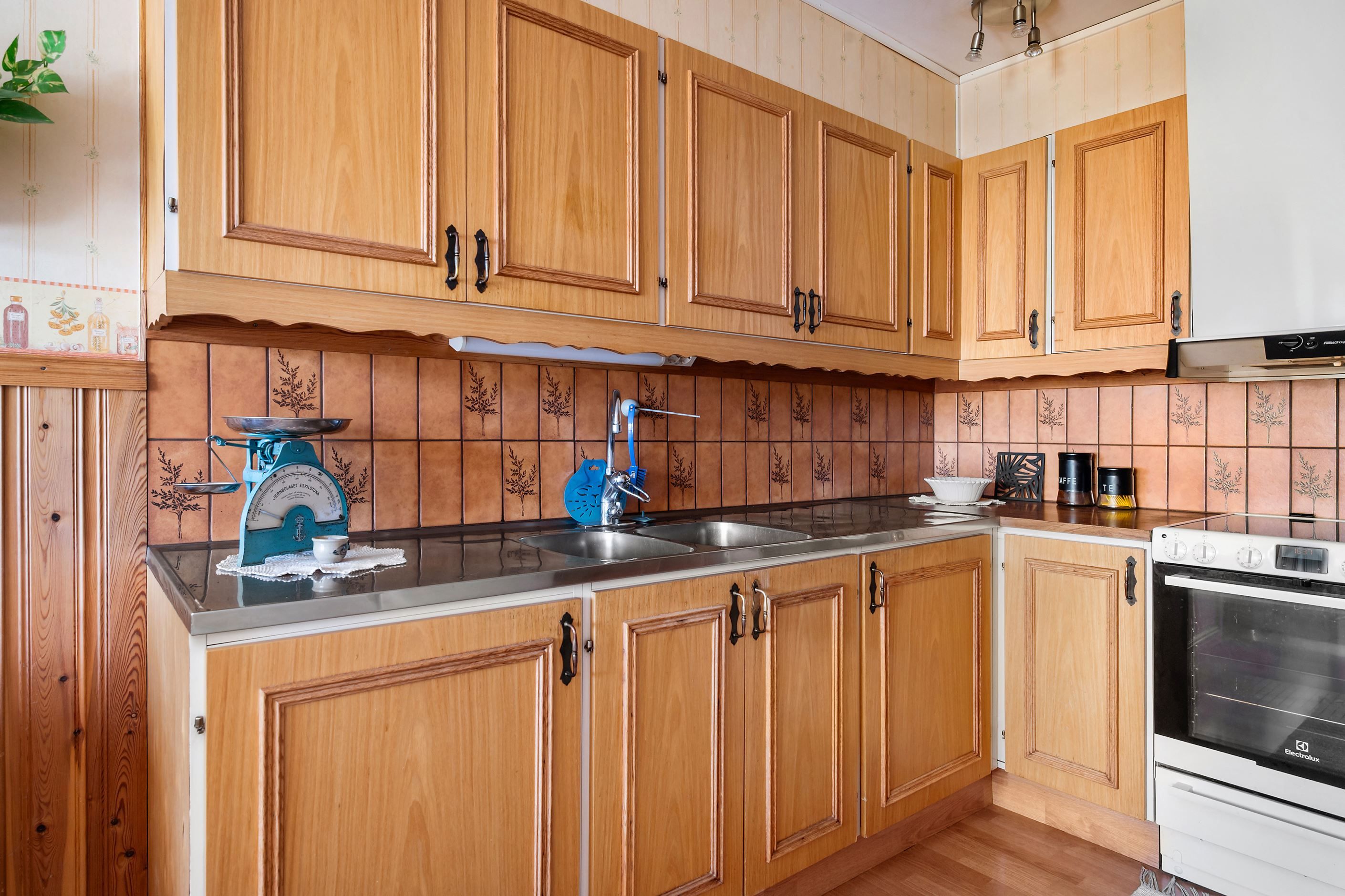 Du välkomnas in i en hemtrevlig hall med plats för avhängning av ytterkläder och skor. Vidare in i bostaden möts du av ett praktiskt kök med luckor i ljus träfärg, laminatbänkskiva och kakel ovan arbetsytorna. Här finns spis, fläkt, dubbel diskho samt fullstor kyl och frys. Intill fönsterpartiet finns en naturlig plats för matgrupp där du kan njuta av vardagens måltider i ett fint ljusinsläpp.