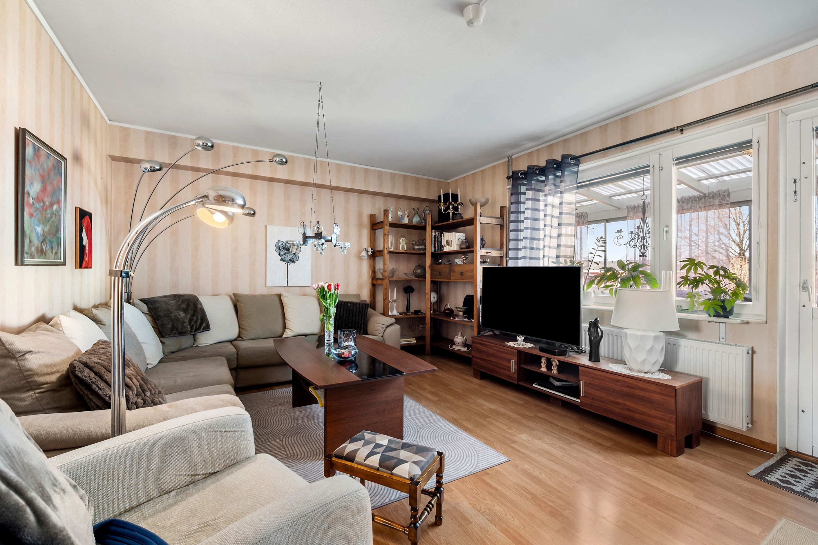 Vardagsrummet är generöst tilltaget och erbjuder gott om plats för både soffgrupp, TV-möbel och bokhyllor. De stora fönsterpartierna tillsammans med den halvglasade altandörren ger ett härligt ljusinsläpp och skapar en trivsam atmosfär. Intill vardagsrummet finns en inglasning utrustad med infravärme, vilket förlänger säsongen och skapar en perfekt plats för avkoppling stora delar av året. Härifrån nås även den inglasade altanen med plats för loungemöbler att njuta av under årets varmare månader.