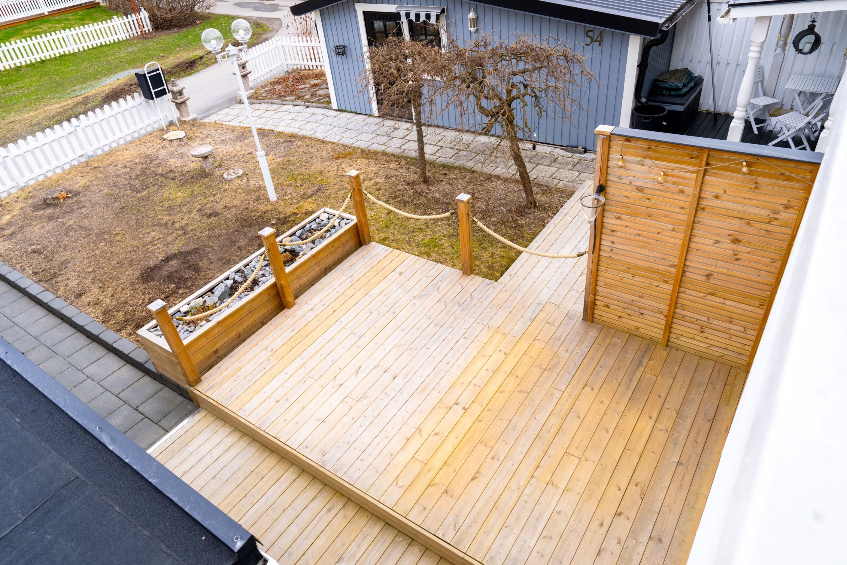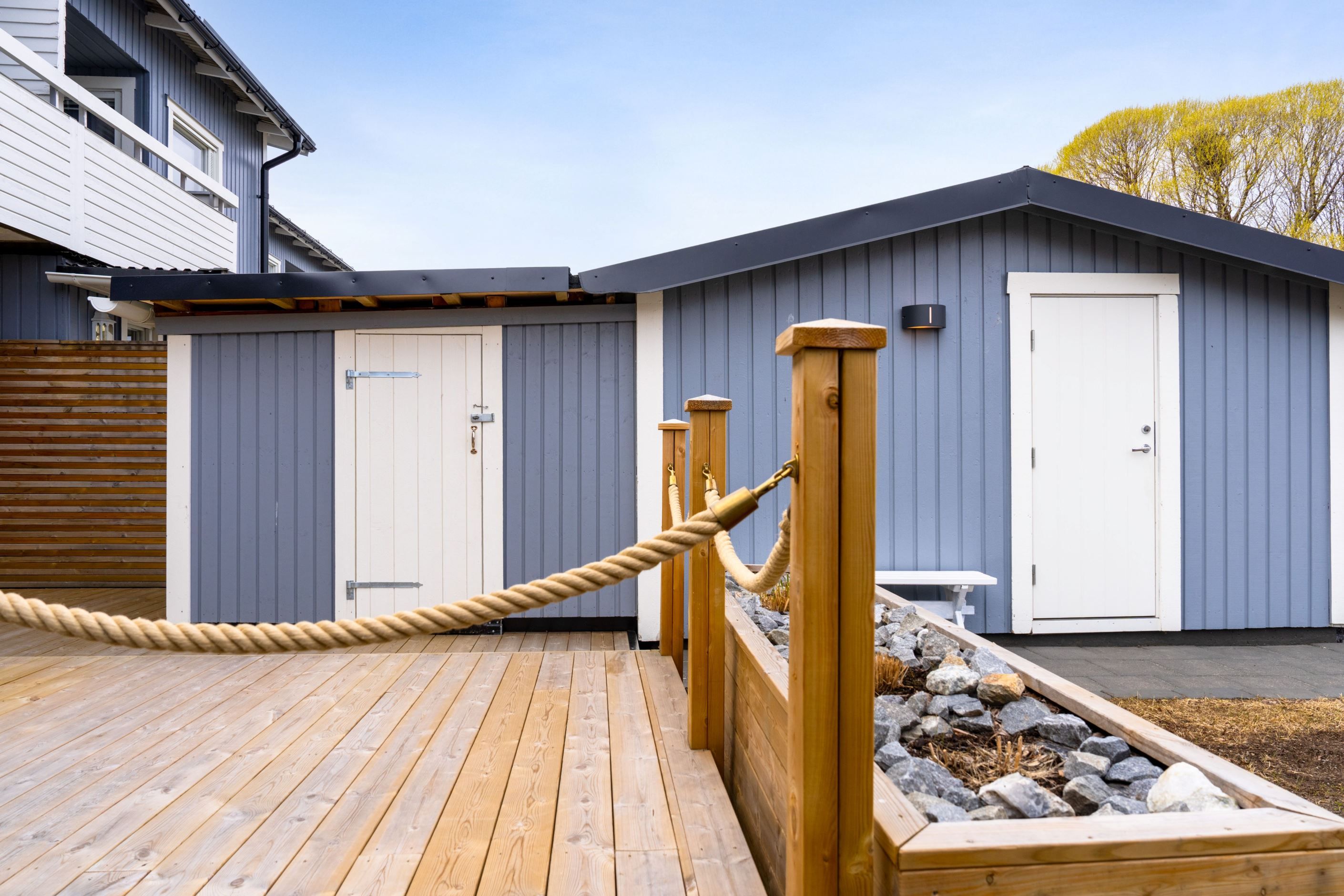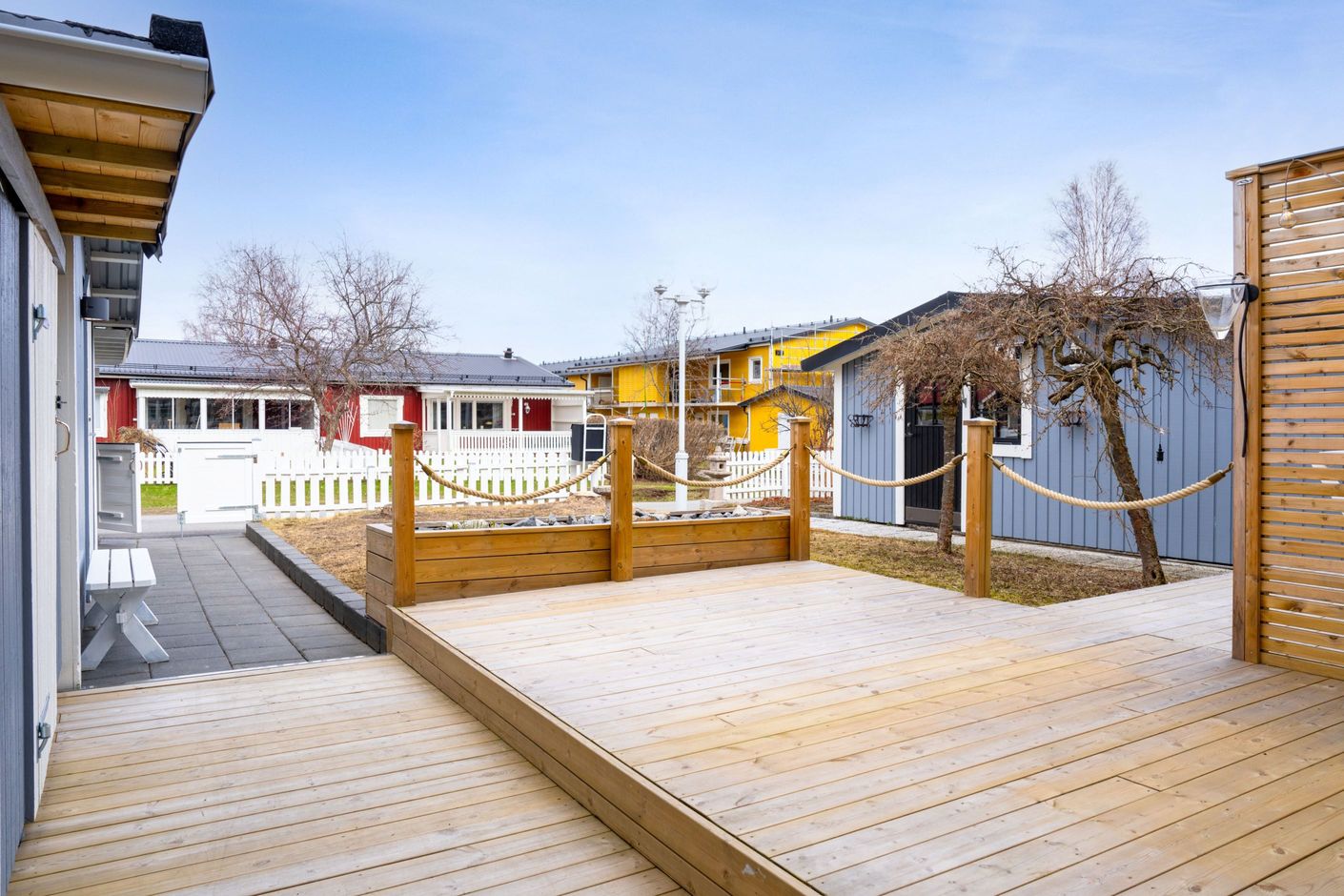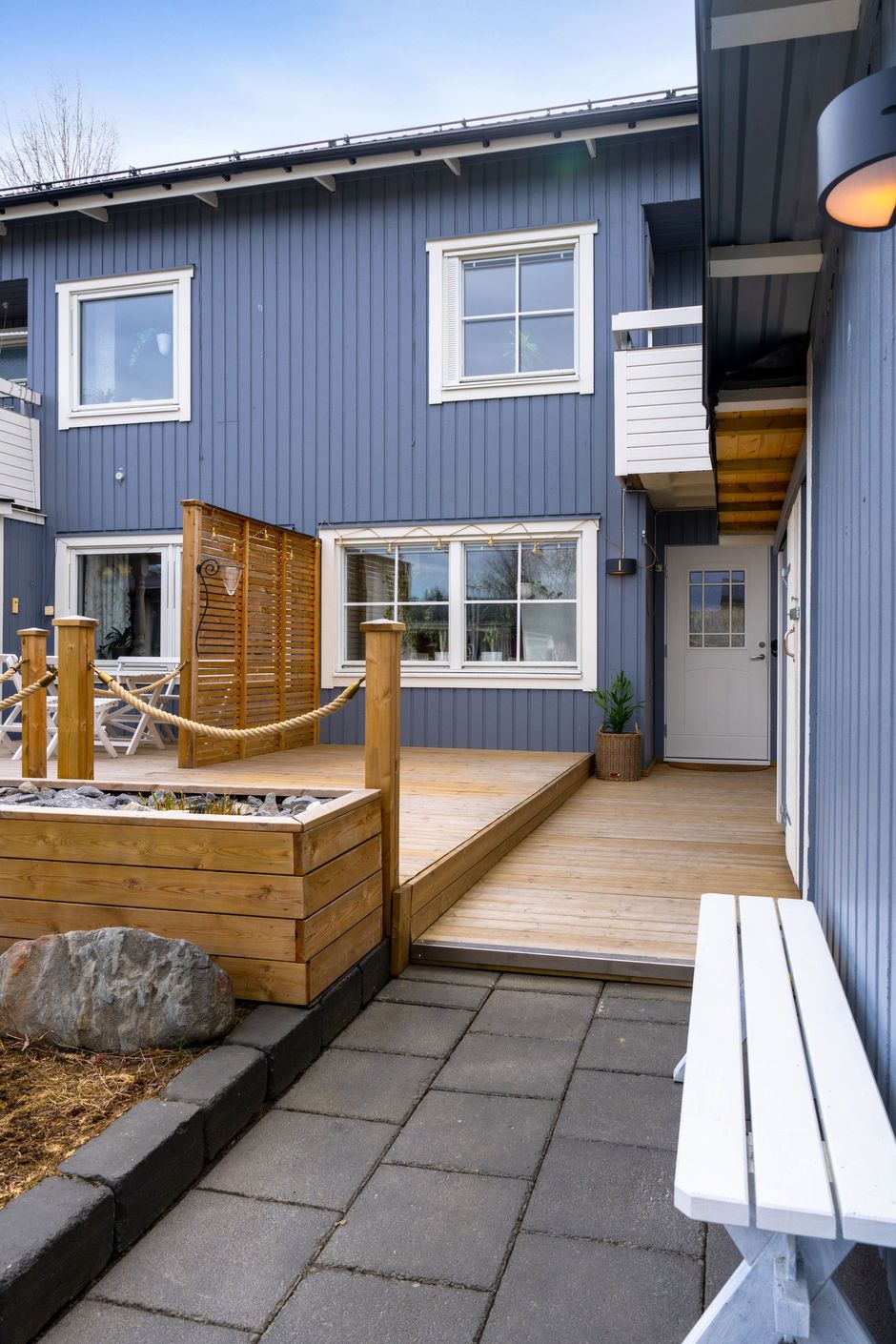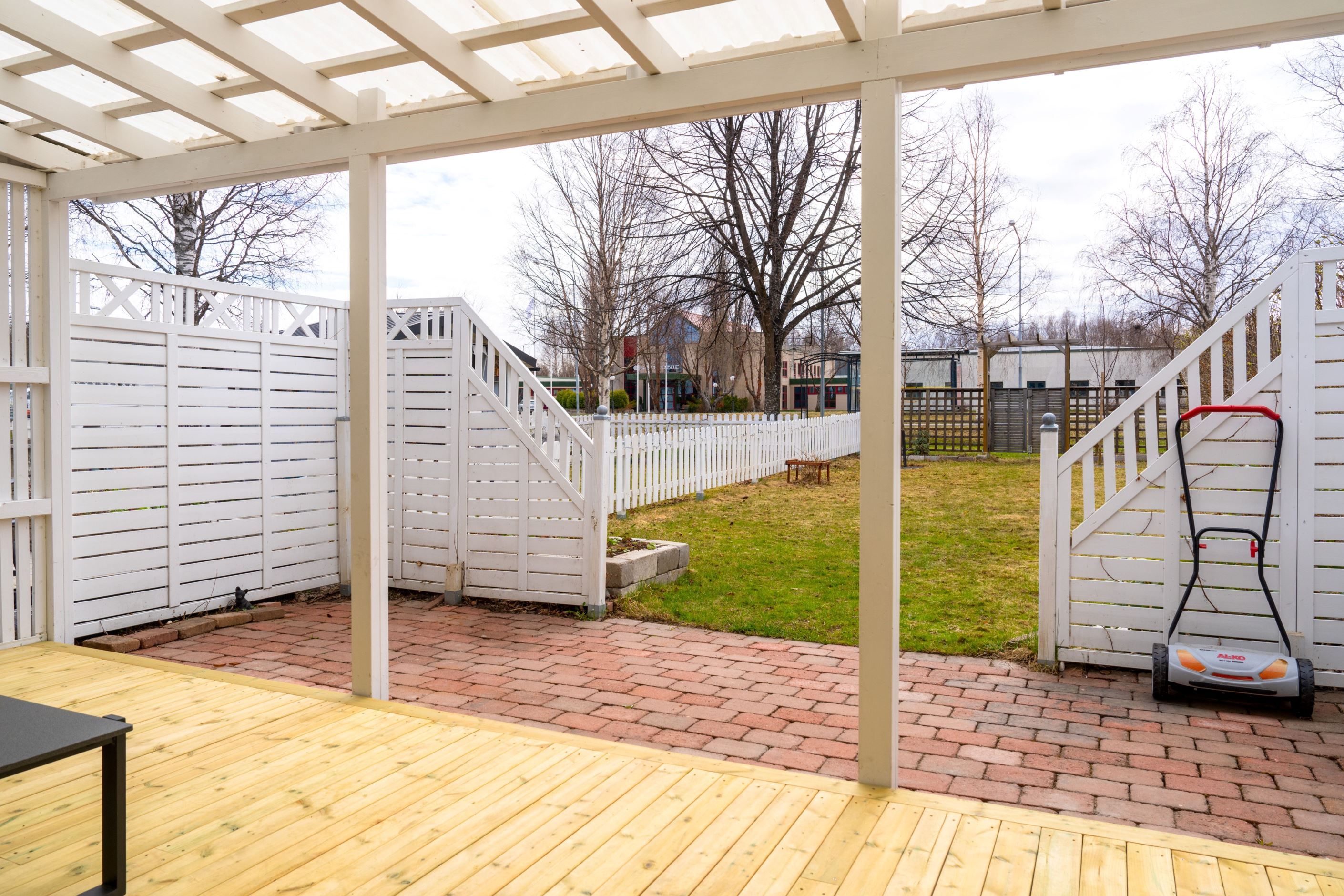 På framsidan finner du en välbyggd altan. Perfekt för att njuta av morgonkoppen eller se barnen leka i kvällssolen.