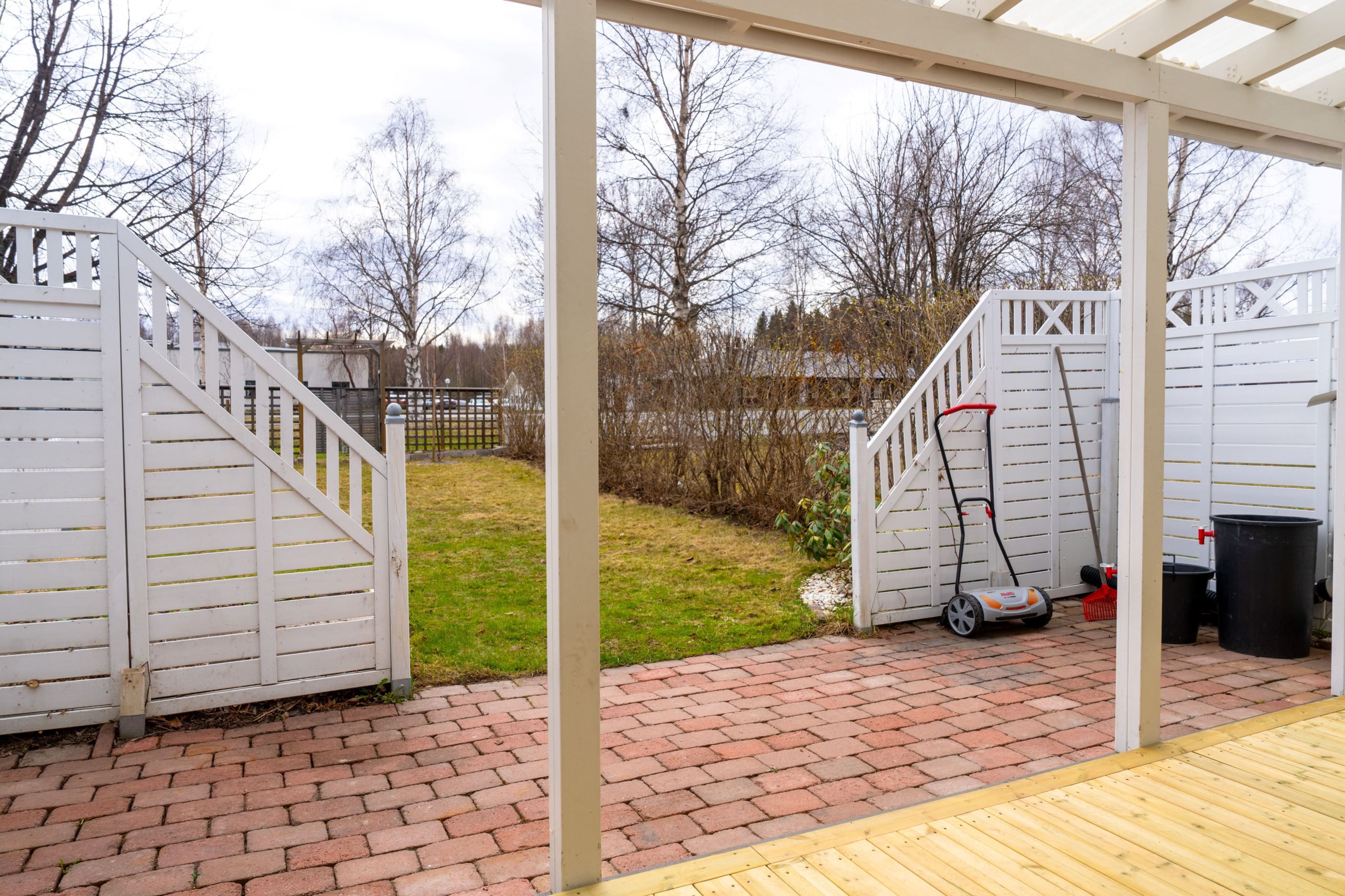 Här har du ett välplanerat bostadsrättradhus med uteplatser i två väderstreck vilket ger dig möjlighet att njuta av utemiljön och dessutom kunna vistas i solen större delen av dagen. På södersidan finner du en väl tilltagen altan under tak med gräsytor framför som är inringade av en ordentlig häck. Perfekt för dig som har mindre barn.