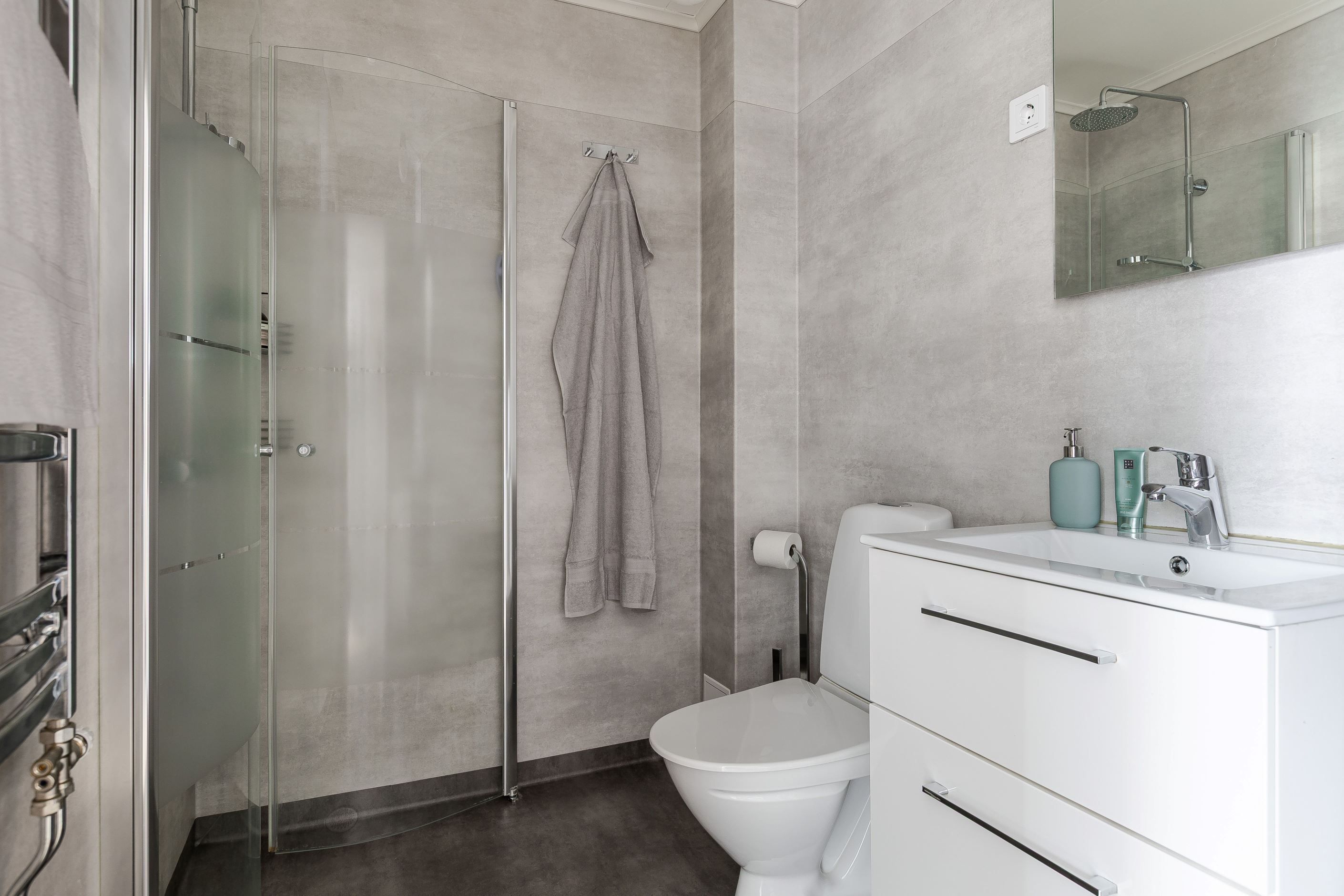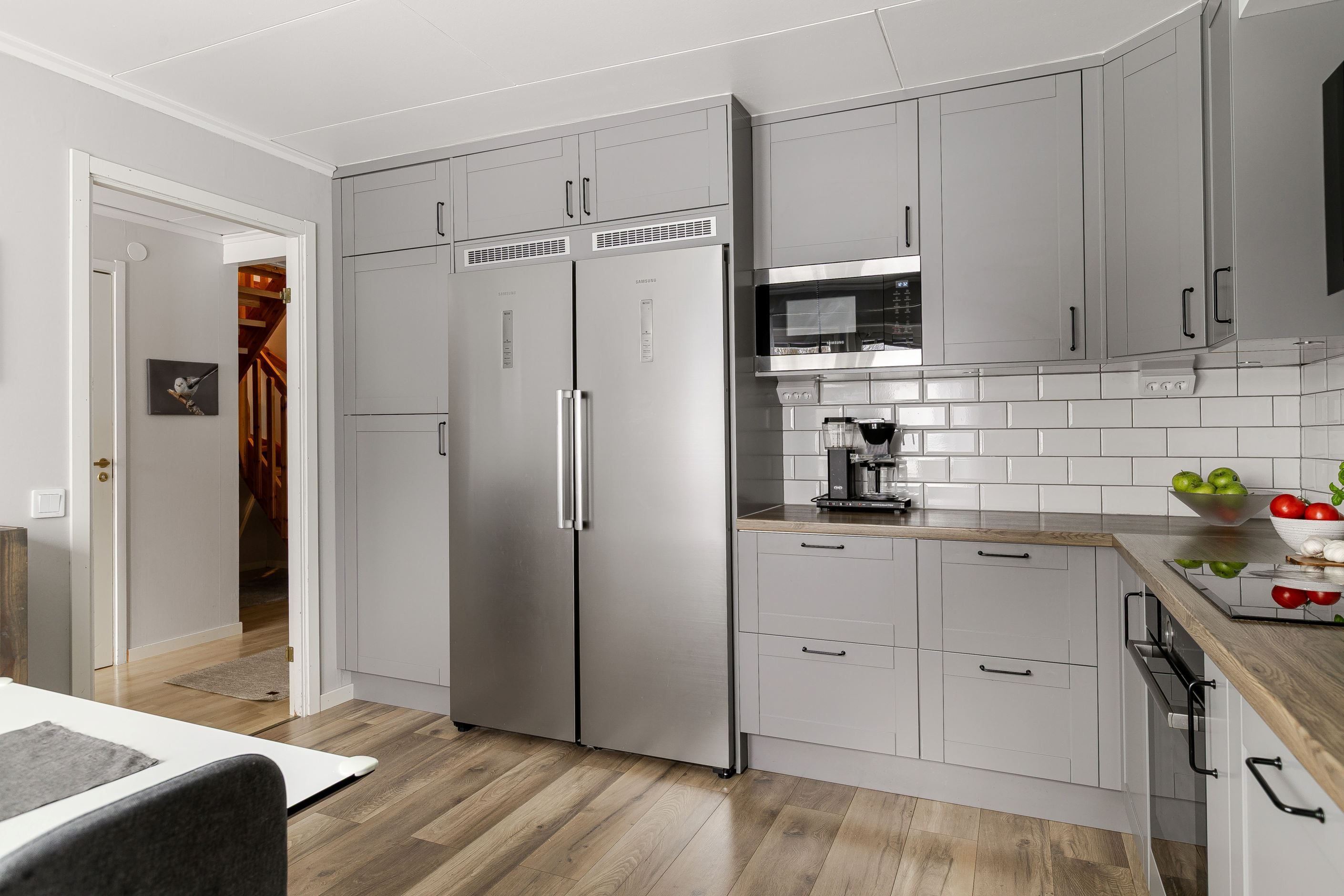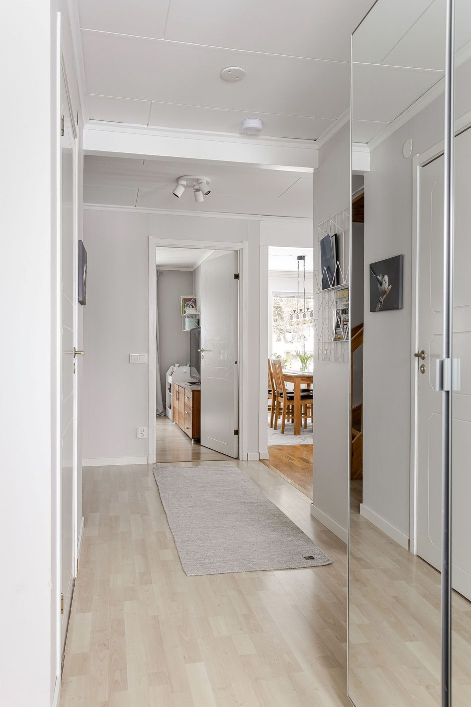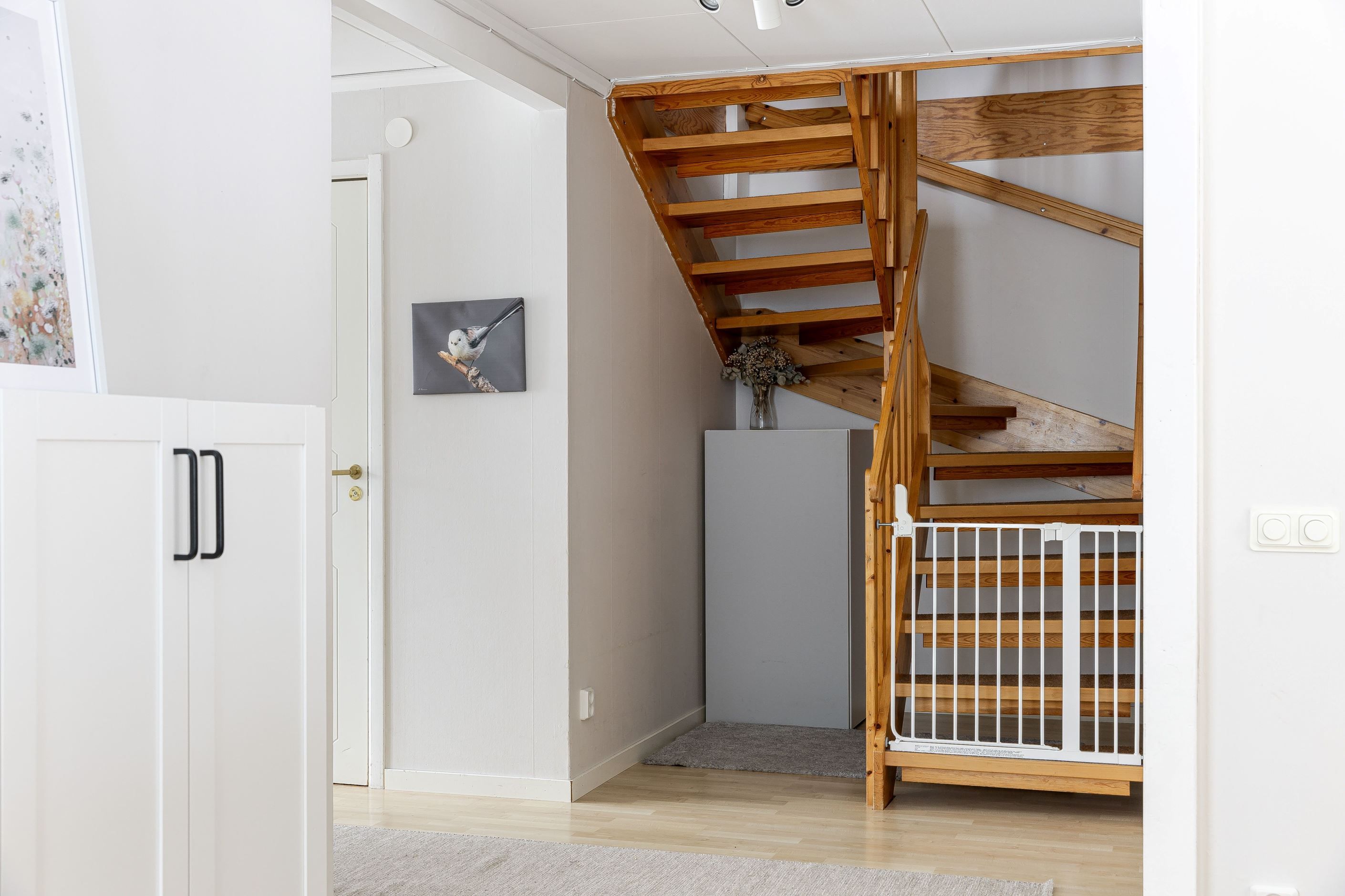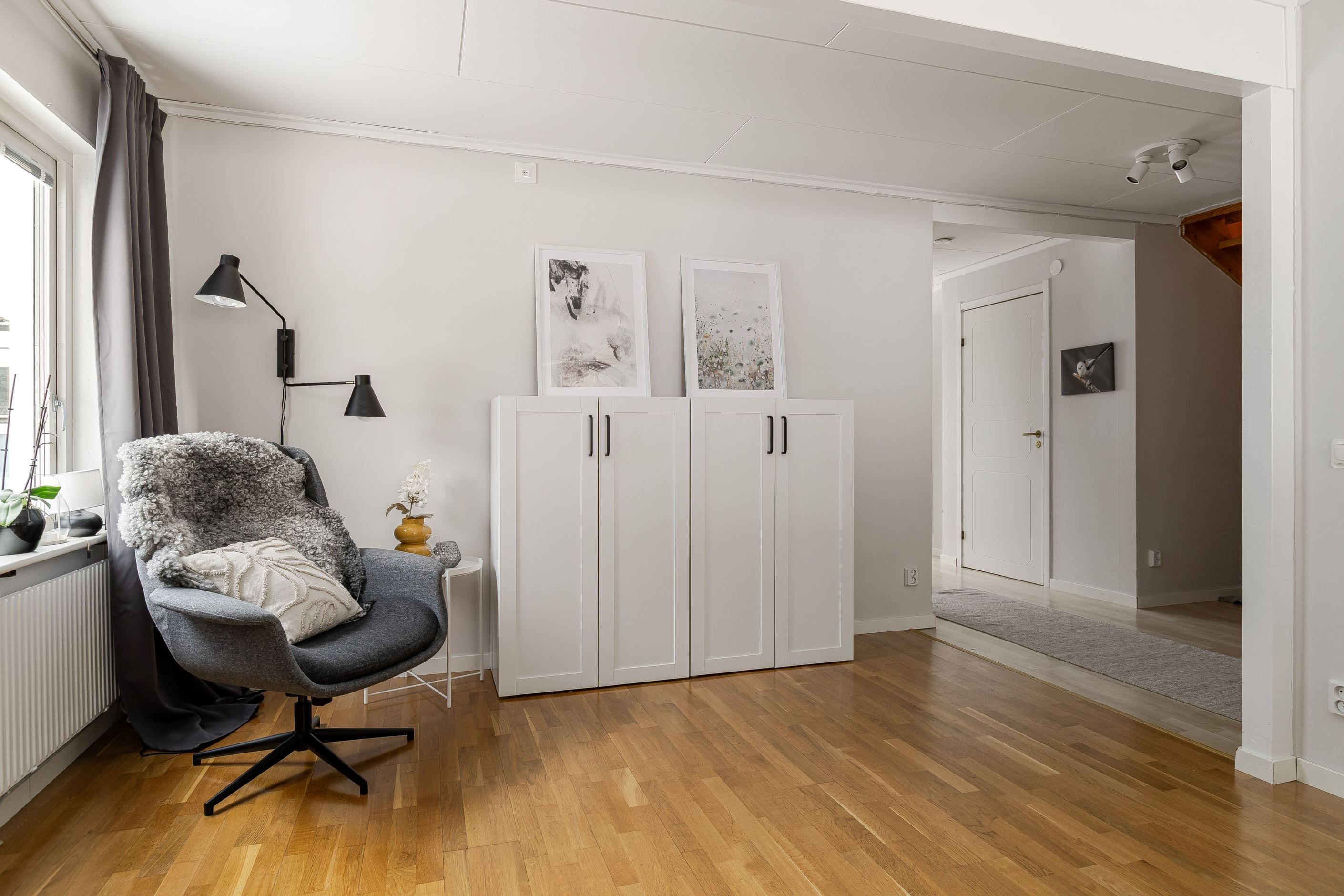 Entréplanet erbjuder ett smakfullt renoverat kök i stilren grå ton med moderna vitvaror och plats för matbord. Vidare finns ett ljust vardagsrum med utgång till uteplatsen – en perfekt plats för sommarens måltider och umgänge. Trätrall med gott om plats för utemöbler och grill. På entréplanet finns även ett extra rum som med fördel kan användas som kontor, vardagsrum eller sovrum, samt ett fräscht nyrenoverat duschrum.