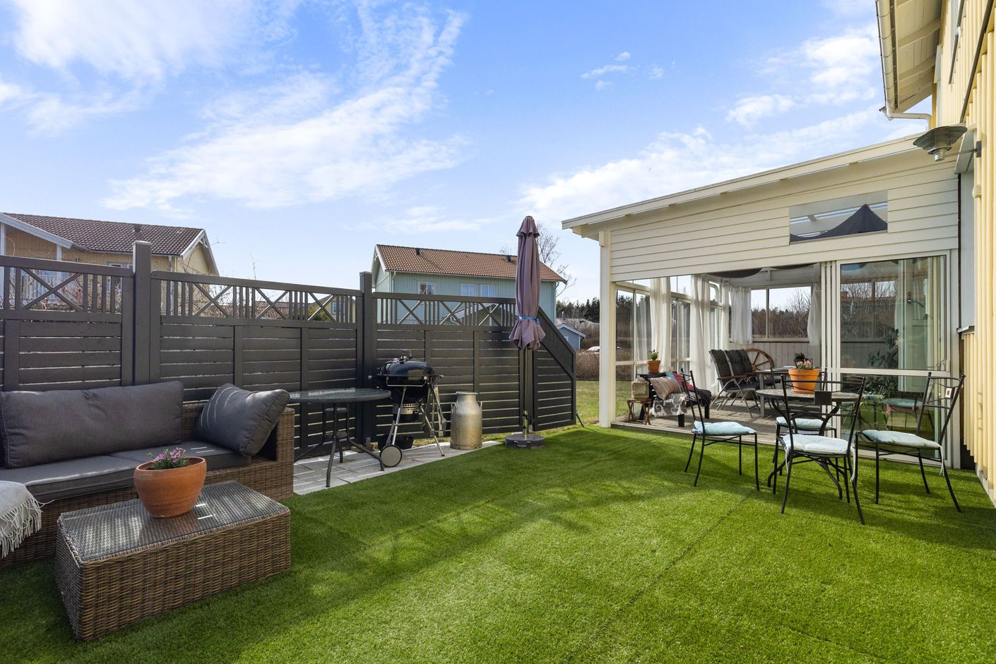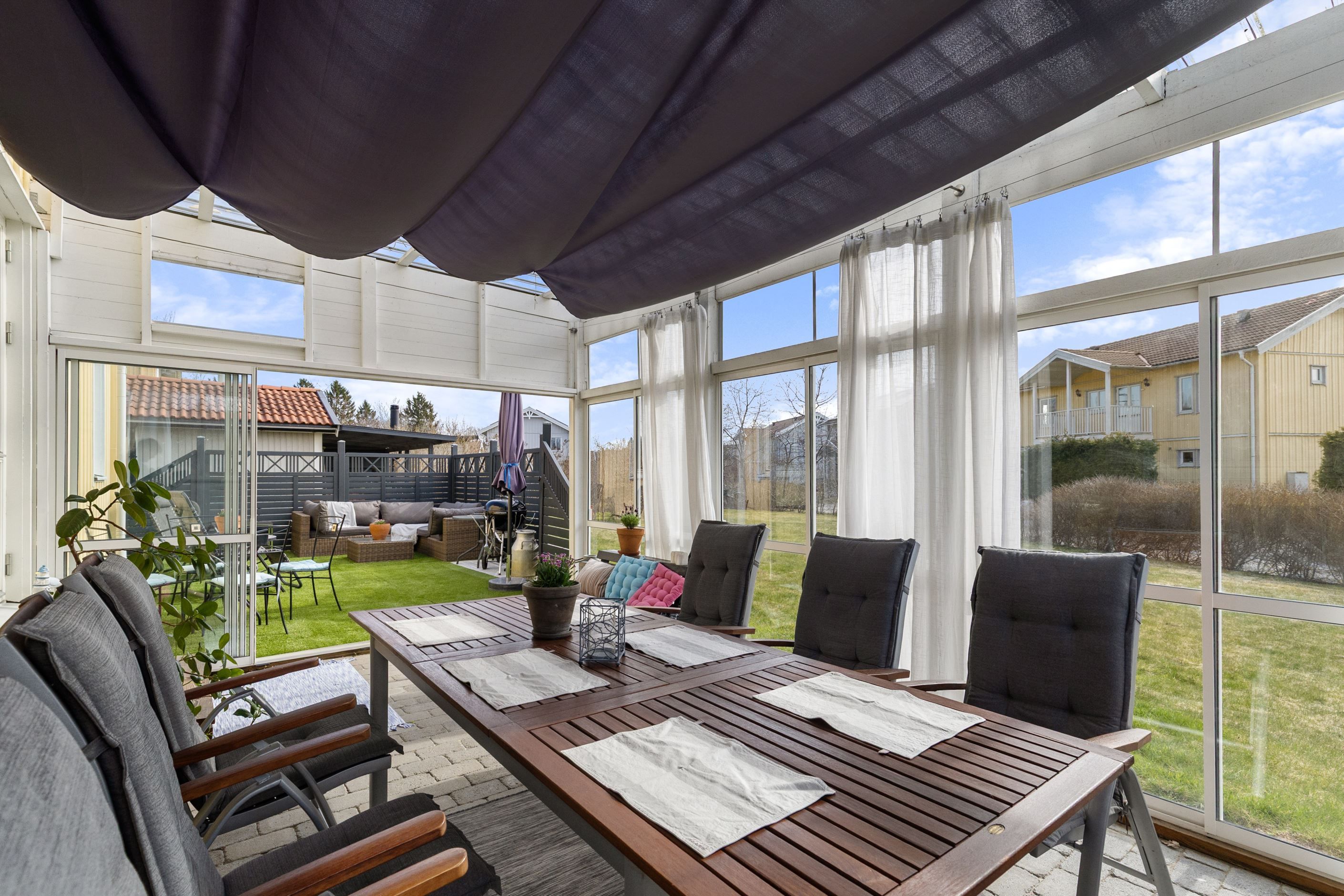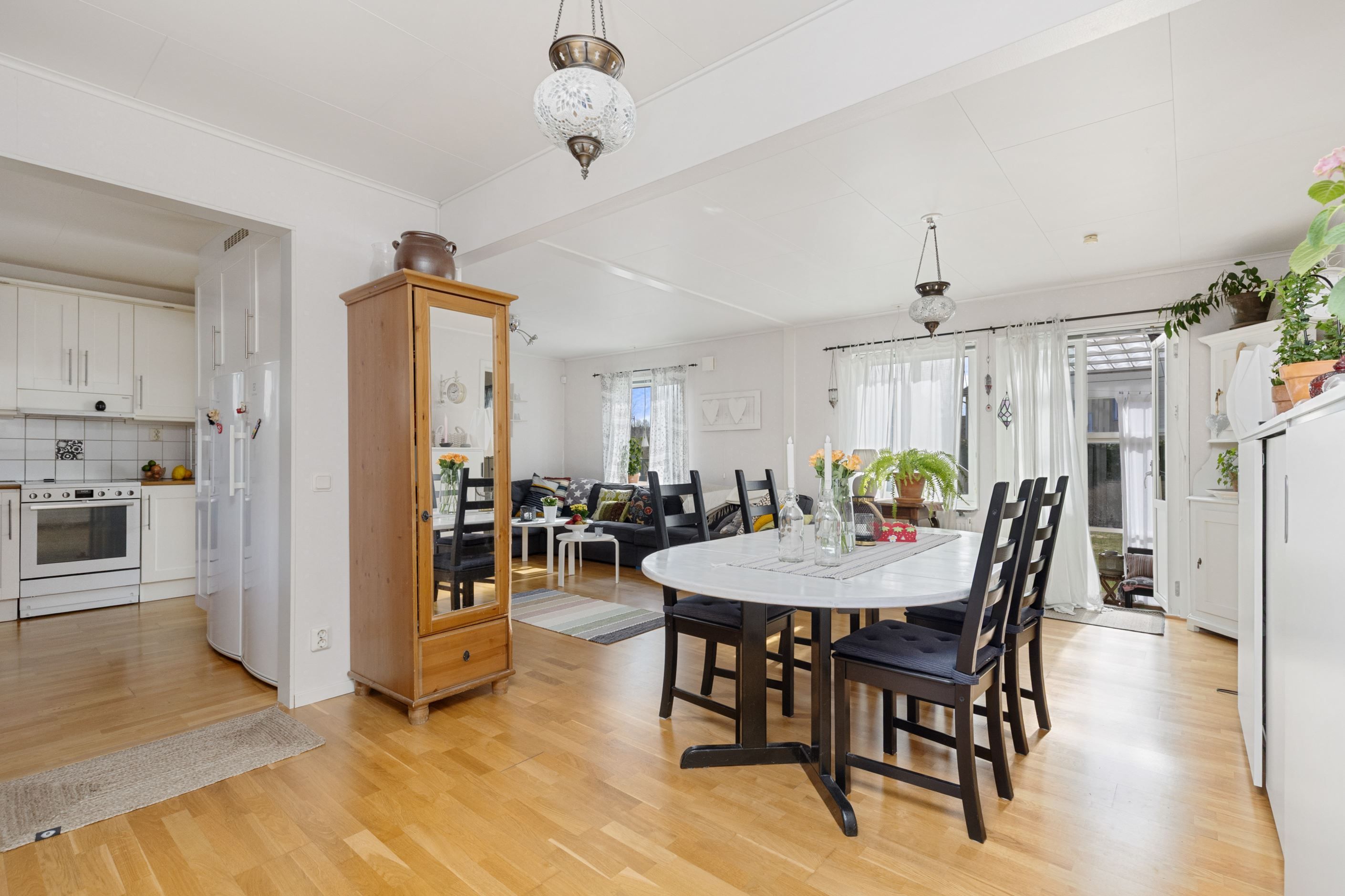 Bostaden präglas av en genomtänkt planlösning med generösa sällskapsytor som bjuder in till umgänge och sociala tillställningar. De stora fönsterpartierna släpper in ett rikligt ljusflöde och skapar en luftig och välkomnande känsla i hela hemmet. Utgång från vardagsrummet nåt ett stort uterum med glasskjutdörrar. Här finns gott om plats för både familjeliv och avkoppling, oavsett om det handlar om lugna vardagskvällar eller festliga middagar med vänner.