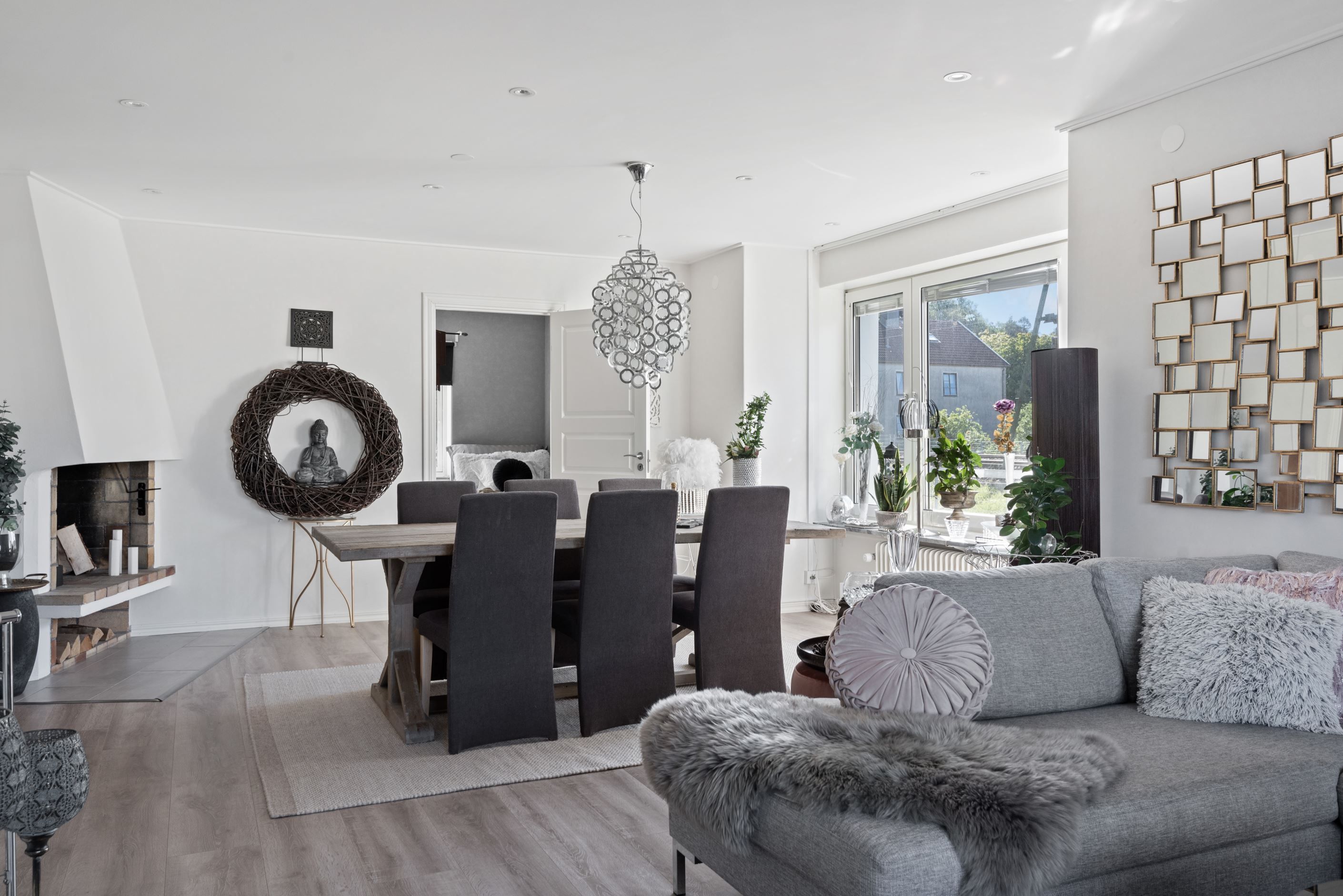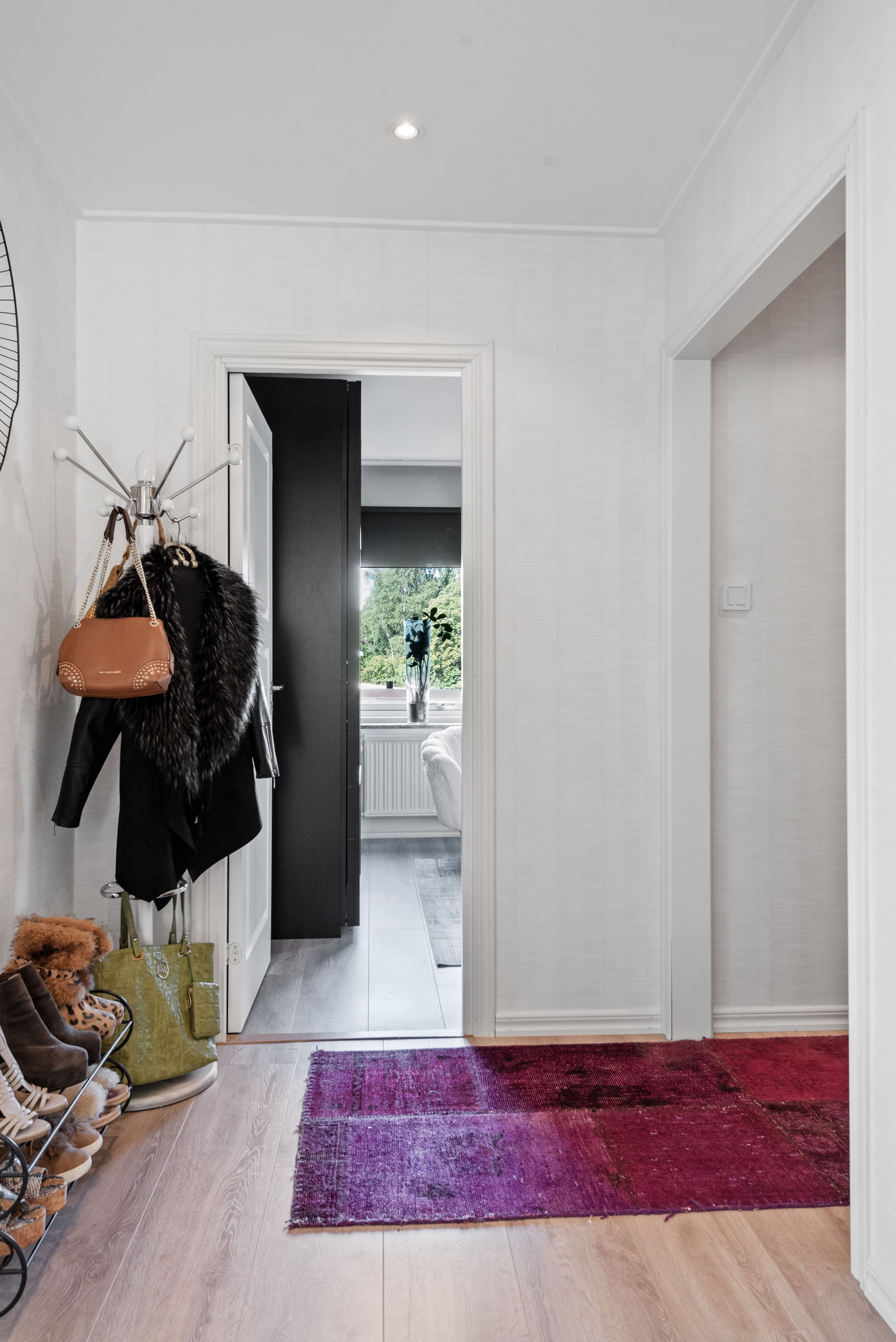 Här har ni förutom inglasad balkong även en egen uteplats. När ni kliver in möts ni av en rymlig hall med anslutning till köket. Köket är vitt och ljust och erbjuder generösa arbetsytor med plats för hela sällskapet. Därefter kommer ni till det kaklade badrummet med egen tvättmaskin. Bostaden har även en klädkammare och extra hall som fungerar lika bra som walk-in-closet som det gör som kontor. Vidare kommer ni till bostadens master bedroom med bra förvaringsmöjligheter i form av skjutgarderober. I vardagsrummet finner ni den öppna spisen där mysiga kvällar kan avnjutas. Här har ni även utgången till balkongen vidare till uteplatsen. I anslutning till vardagsrummet kommer ni till bostadens andra sovrum som även det erbjuder gott om förvaring.
