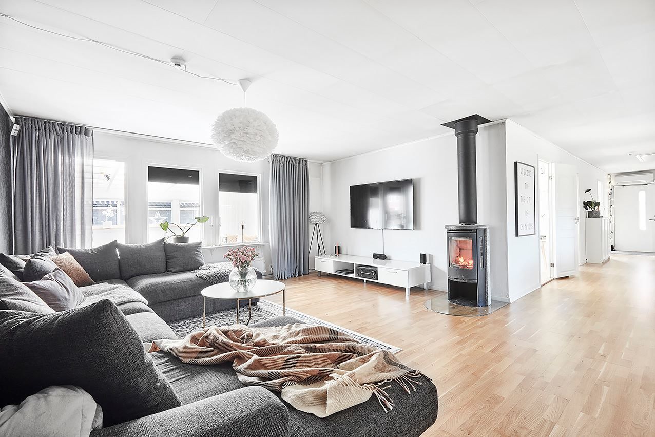 Modern enplansvilla med braskamin, stort utedäck, garage och härlig hörntomt.