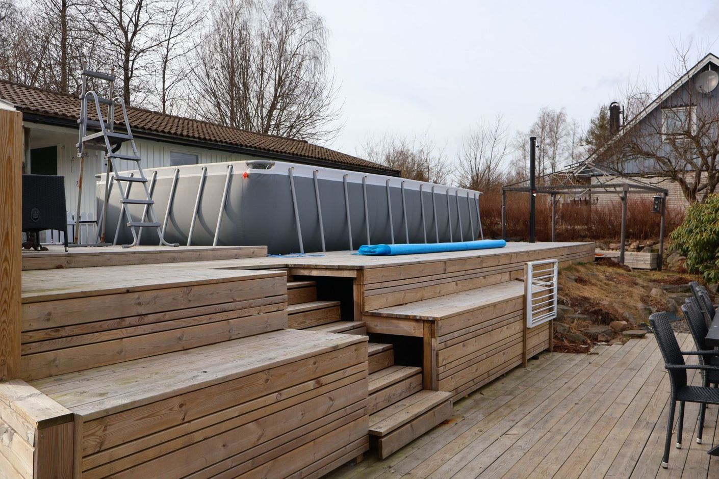 På trädgårdssidan väntar en skyddad och trivsam innergård – tack vare husets vinkel och det inglasade uterummet skapas en härlig oas med både insyns- och vindskydd. Här kan sommarens middagar avnjutas på det fina trädäcket.