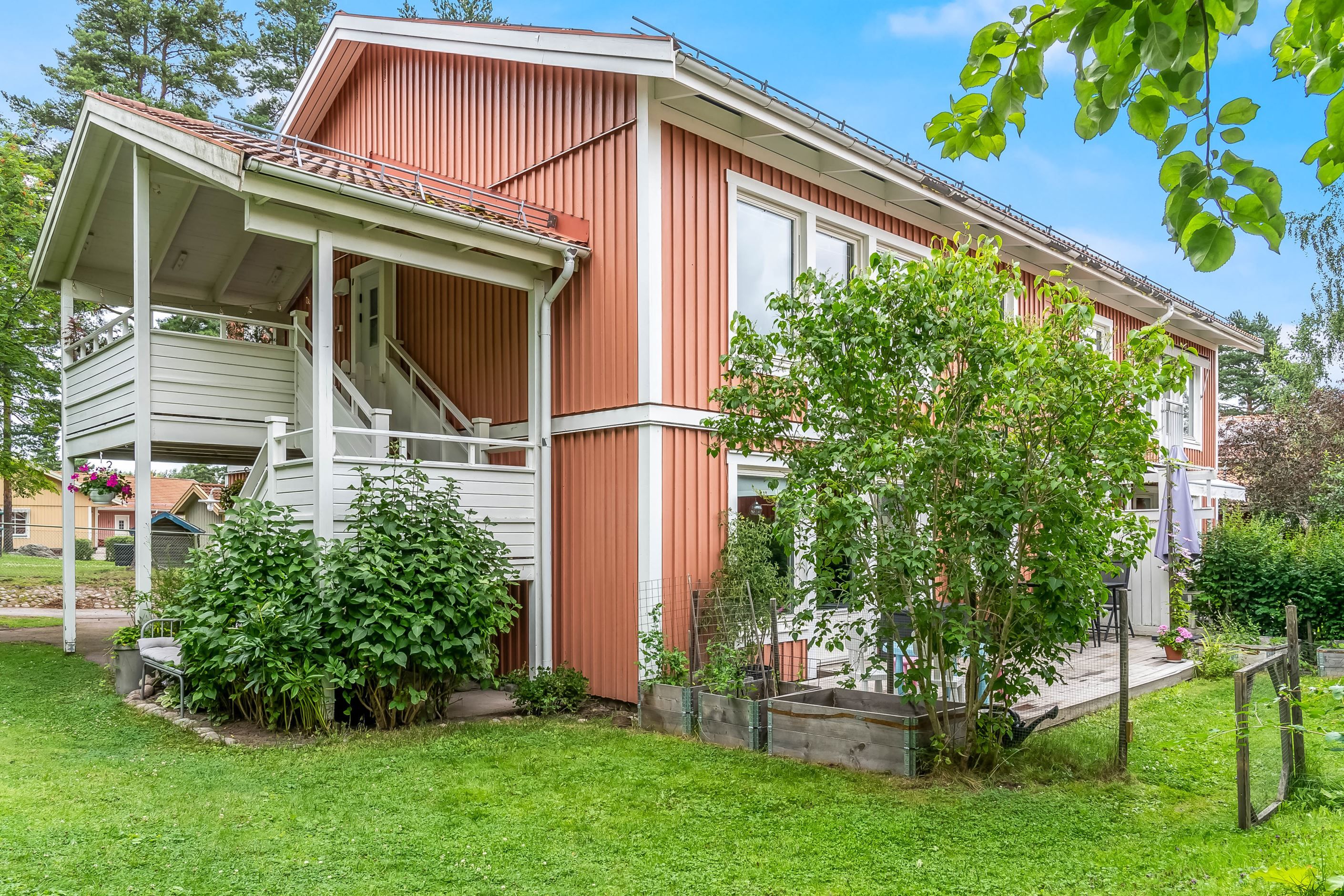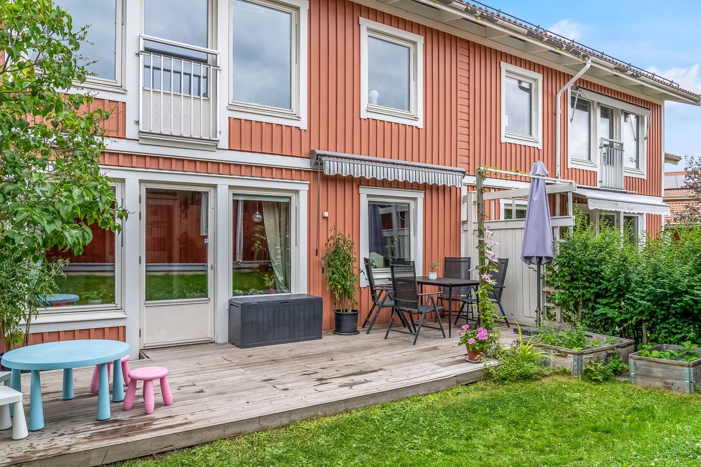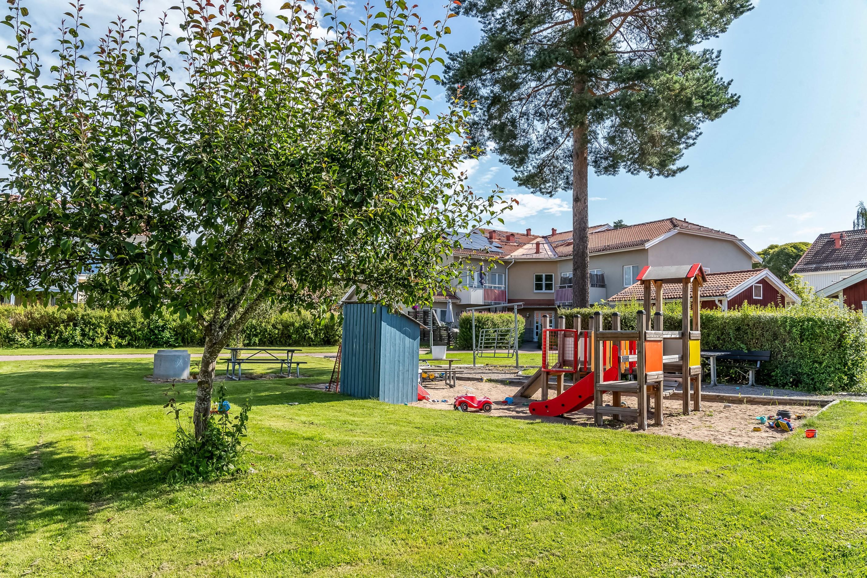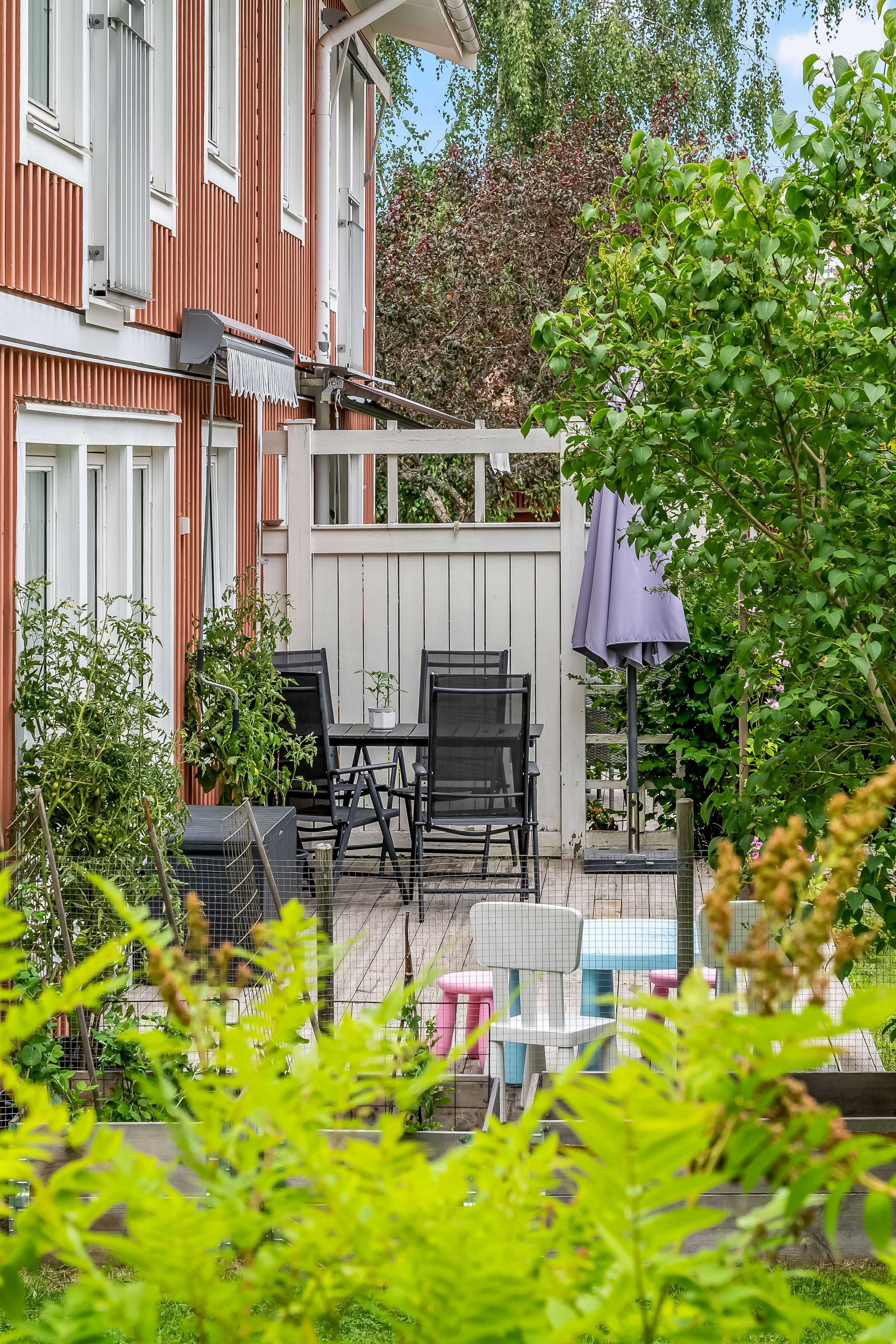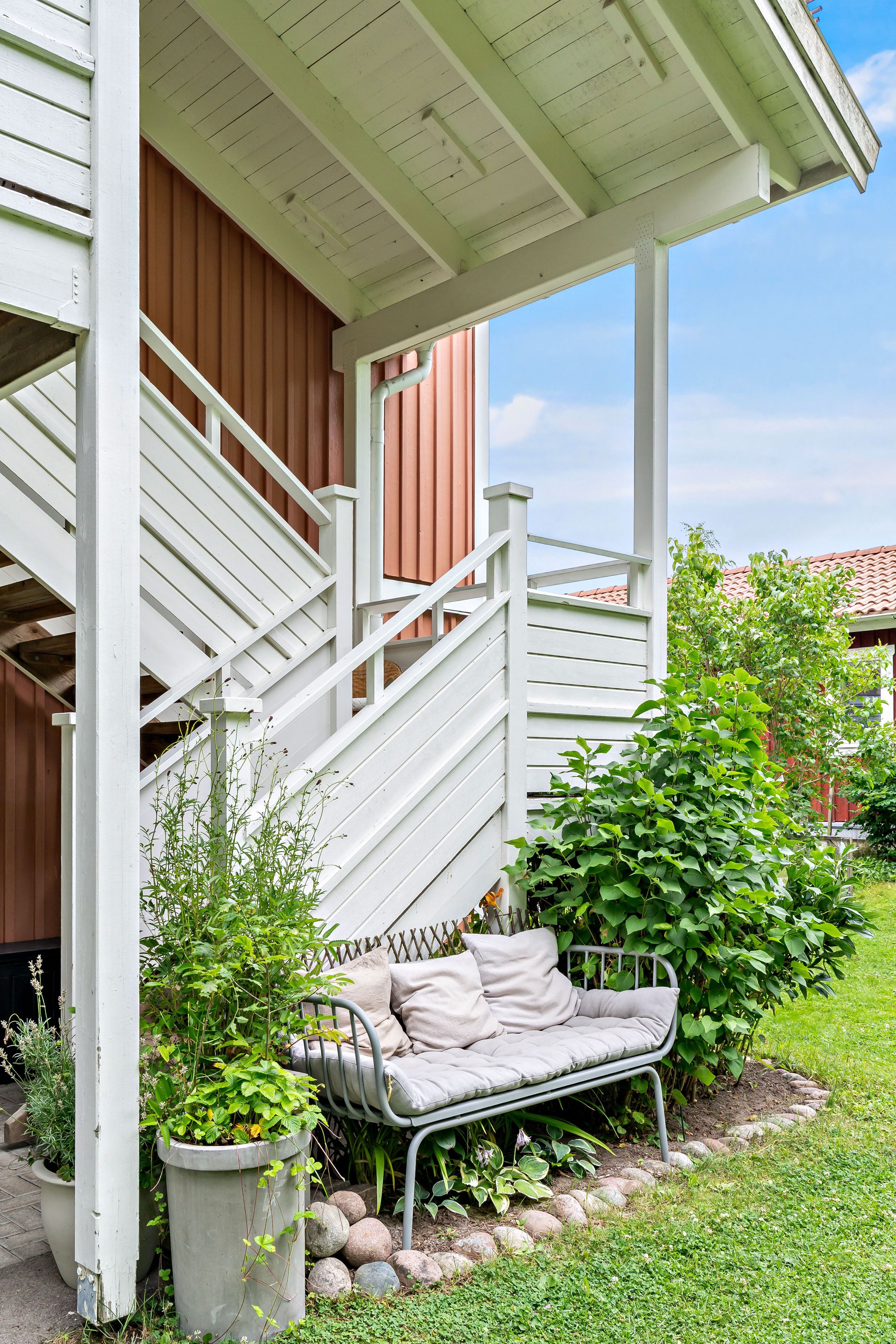 Lägenheten har en inbjudande hall som binder samman bostadens olika delar. Köket är funktionellt och utrustat med gott om förvaringsutrymmen och arbetsytor – en naturlig samlingsplats för både vardag och fest. Lägenheten har två sovrum, båda med garderober för bra förvaring. Badrummet är fräscht och utrustat med både dusch och tvättmaskin. Vardagsrummet är luftigt och ljust tack vare generösa fönsterpartier och har utgång till den egna uteplatsen. Här kan du duka upp för middagar, odla egna kryddor eller bara luta dig tillbaka och njuta av grönskan och barnspring på gräsmattan.