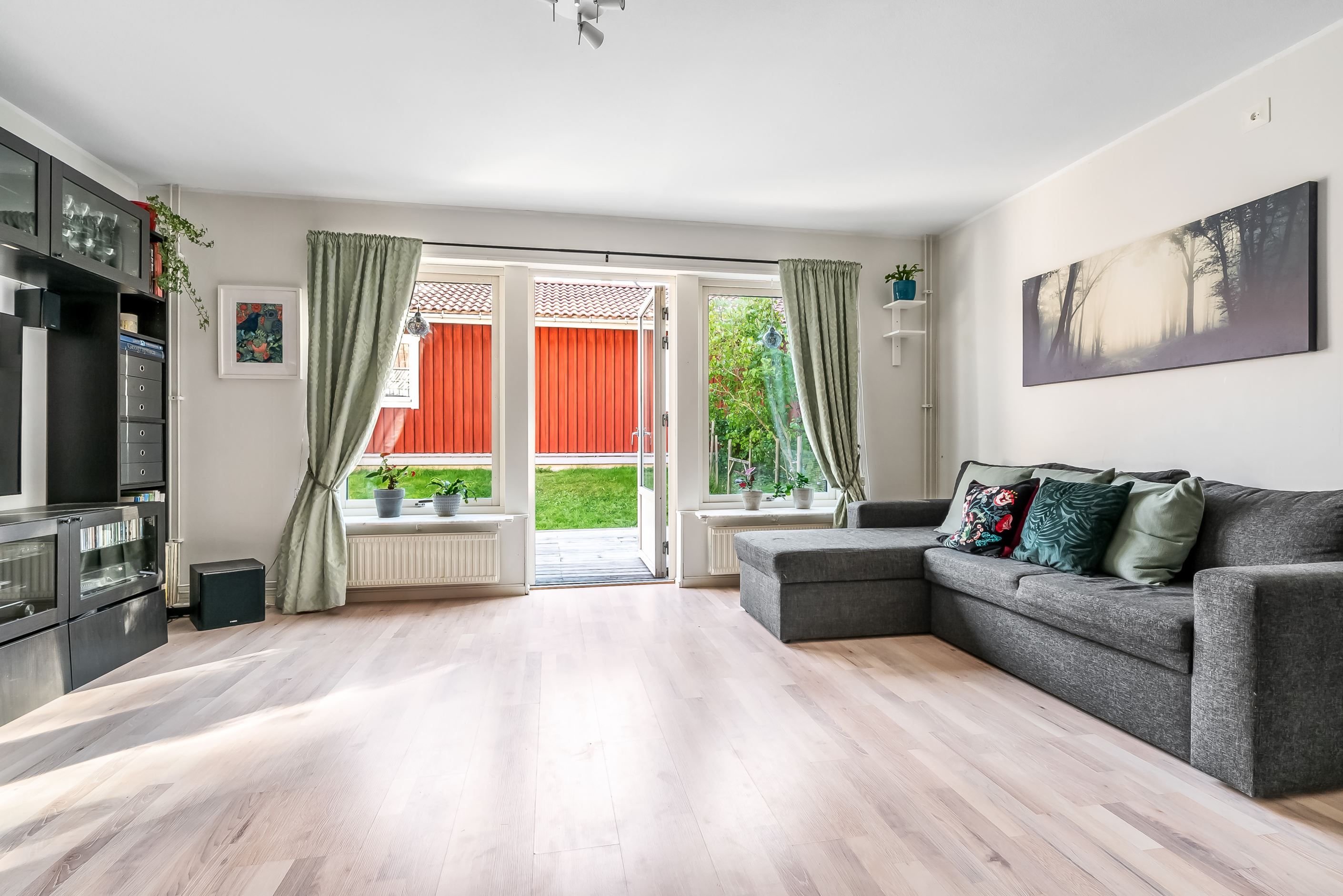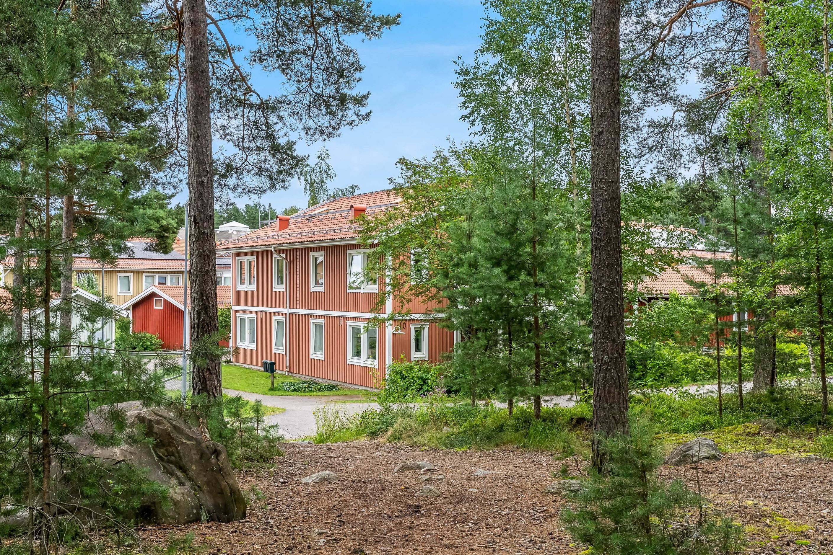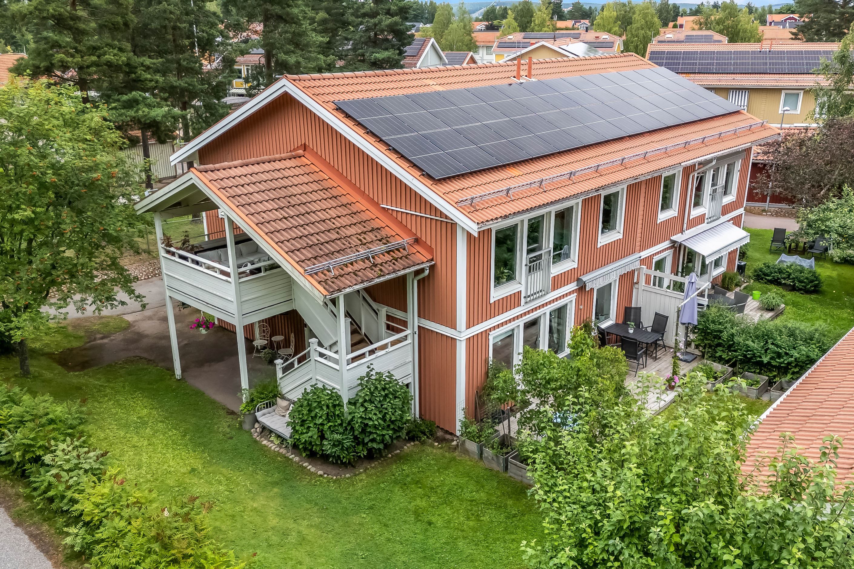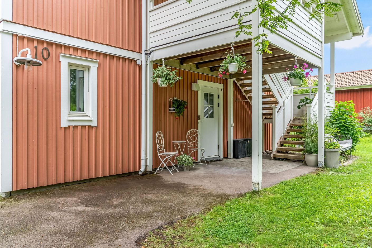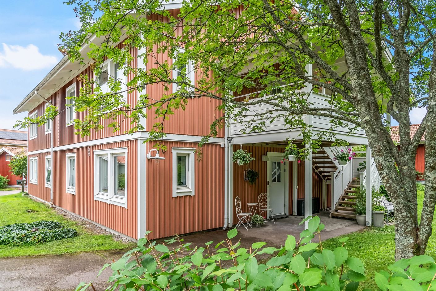 Lägenheten har en inbjudande hall som binder samman bostadens olika delar. Köket är funktionellt och utrustat med gott om förvaringsutrymmen och arbetsytor – en naturlig samlingsplats för både vardag och fest. Lägenheten har två sovrum, båda med garderober för bra förvaring. Badrummet är fräscht och utrustat med både dusch och tvättmaskin. Vardagsrummet är luftigt och ljust tack vare generösa fönsterpartier och har utgång till den egna uteplatsen. Här kan du duka upp för middagar, odla egna kryddor eller bara luta dig tillbaka och njuta av grönskan och barnspring på gräsmattan.