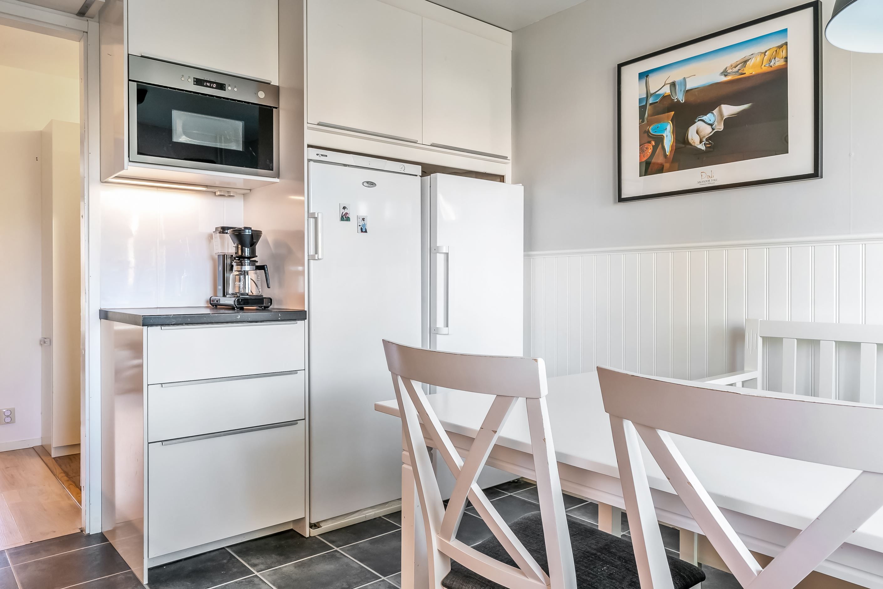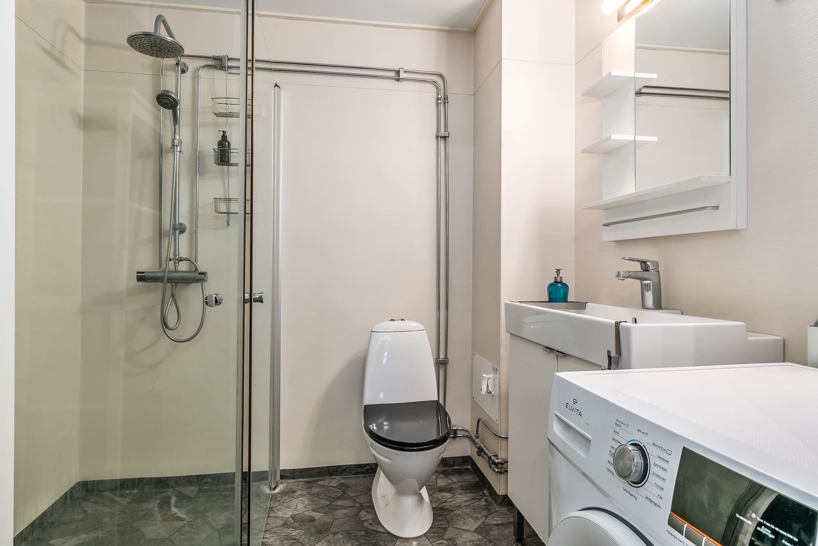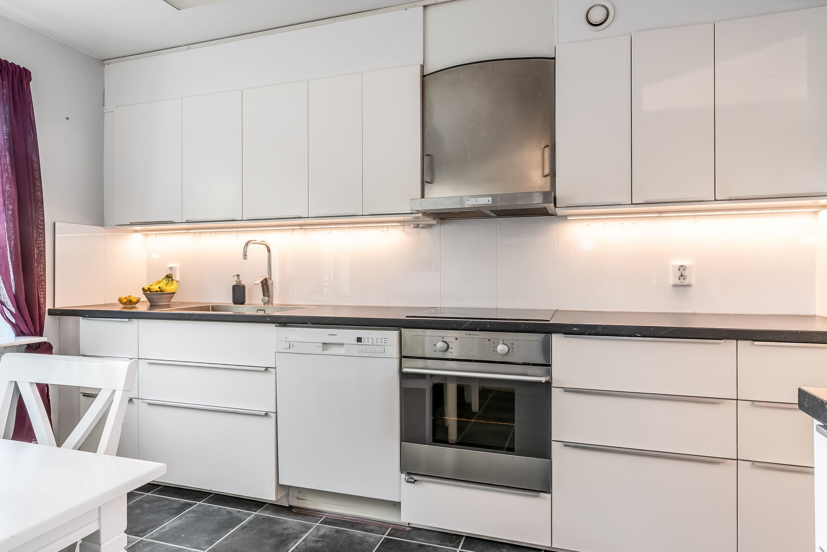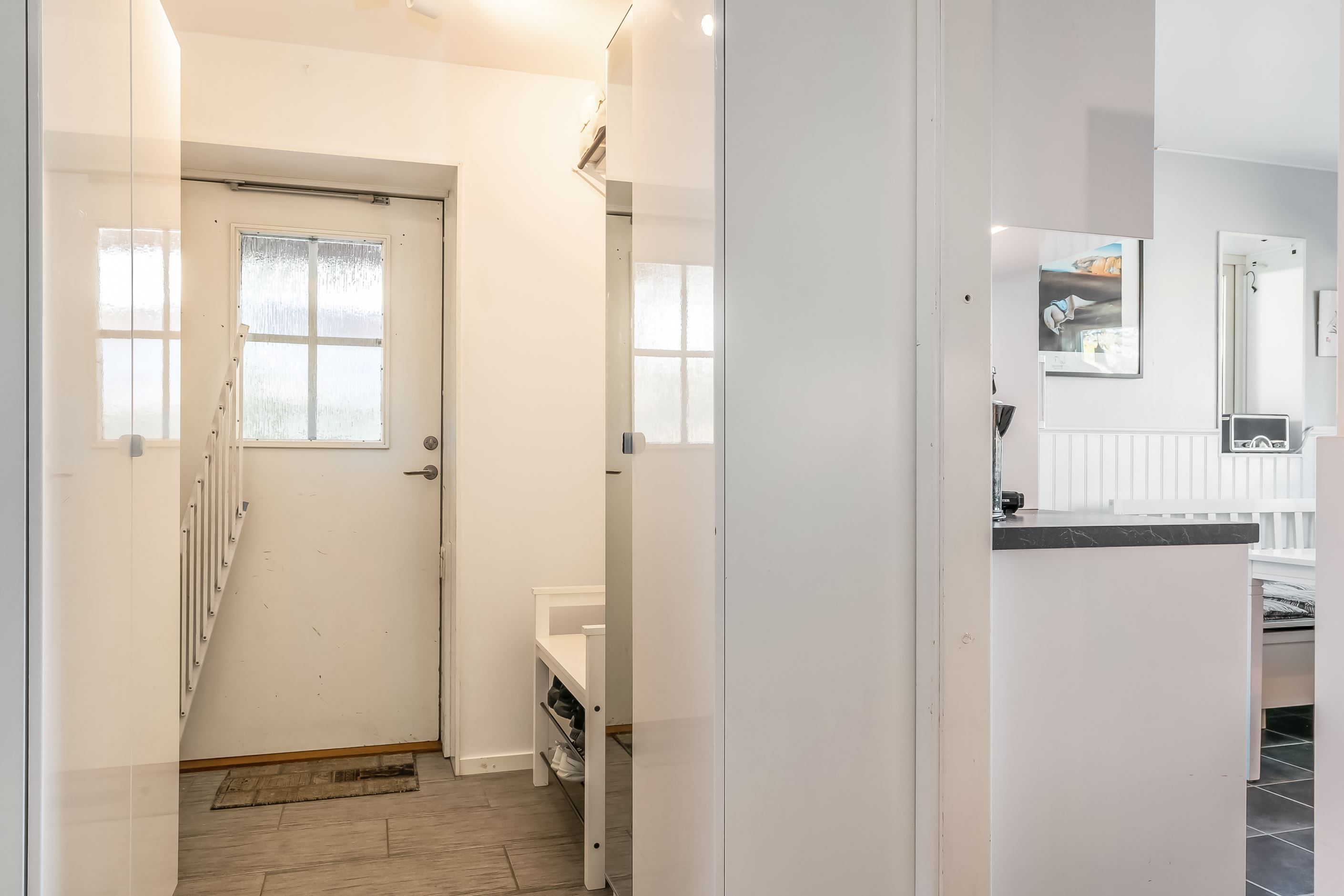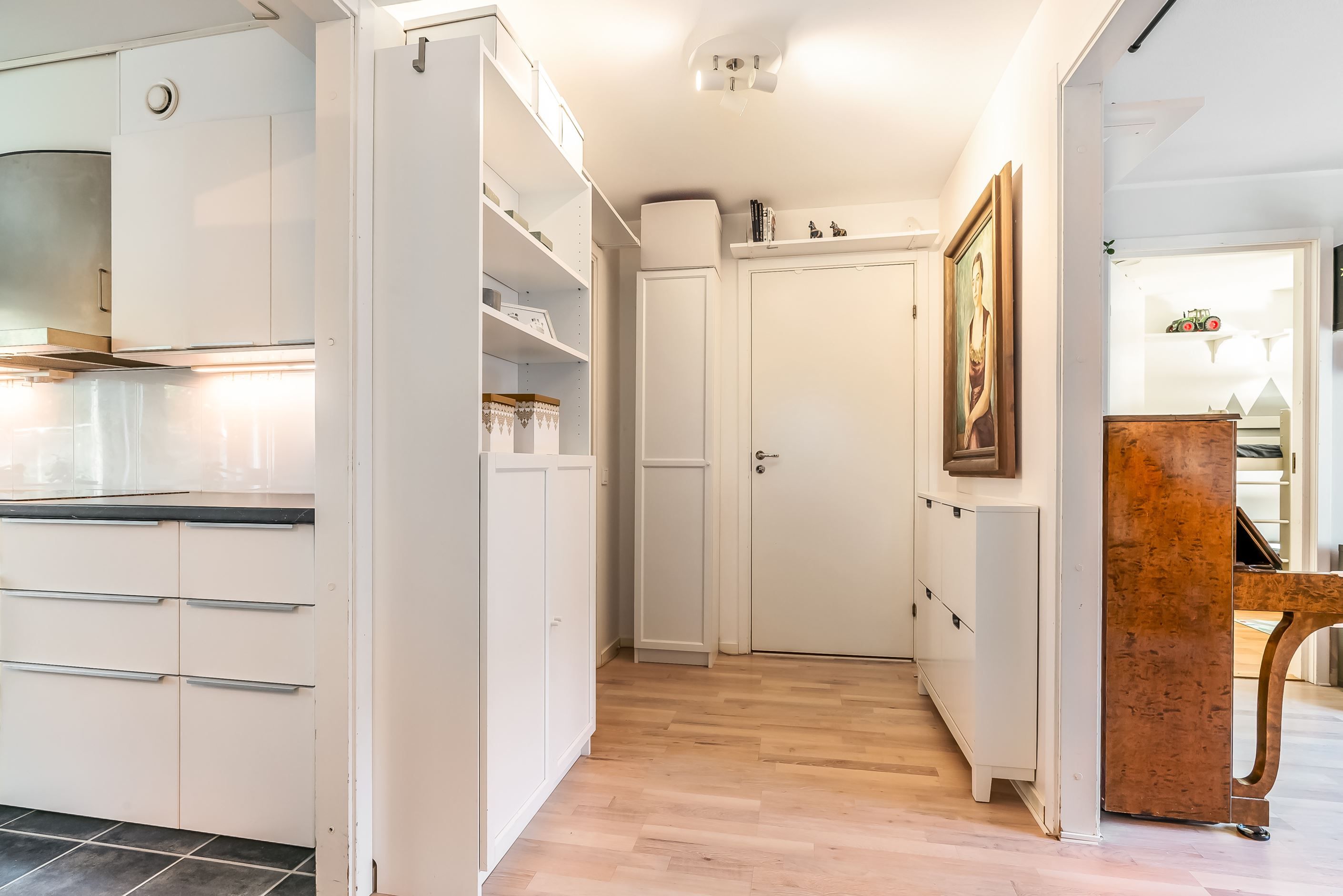 Lägenheten har en inbjudande hall som binder samman bostadens olika delar. Köket är funktionellt och utrustat med gott om förvaringsutrymmen och arbetsytor – en naturlig samlingsplats för både vardag och fest. Lägenheten har två sovrum, båda med garderober för bra förvaring. Badrummet är fräscht och utrustat med både dusch och tvättmaskin. Vardagsrummet är luftigt och ljust tack vare generösa fönsterpartier och har utgång till den egna uteplatsen. Här kan du duka upp för middagar, odla egna kryddor eller bara luta dig tillbaka och njuta av grönskan och barnspring på gräsmattan.