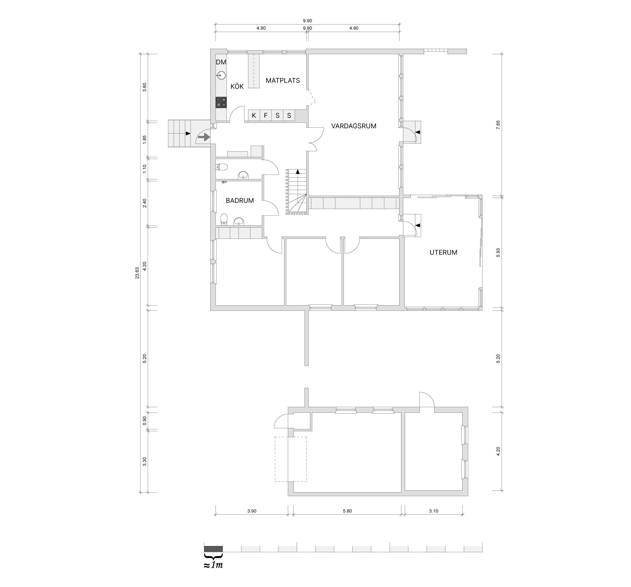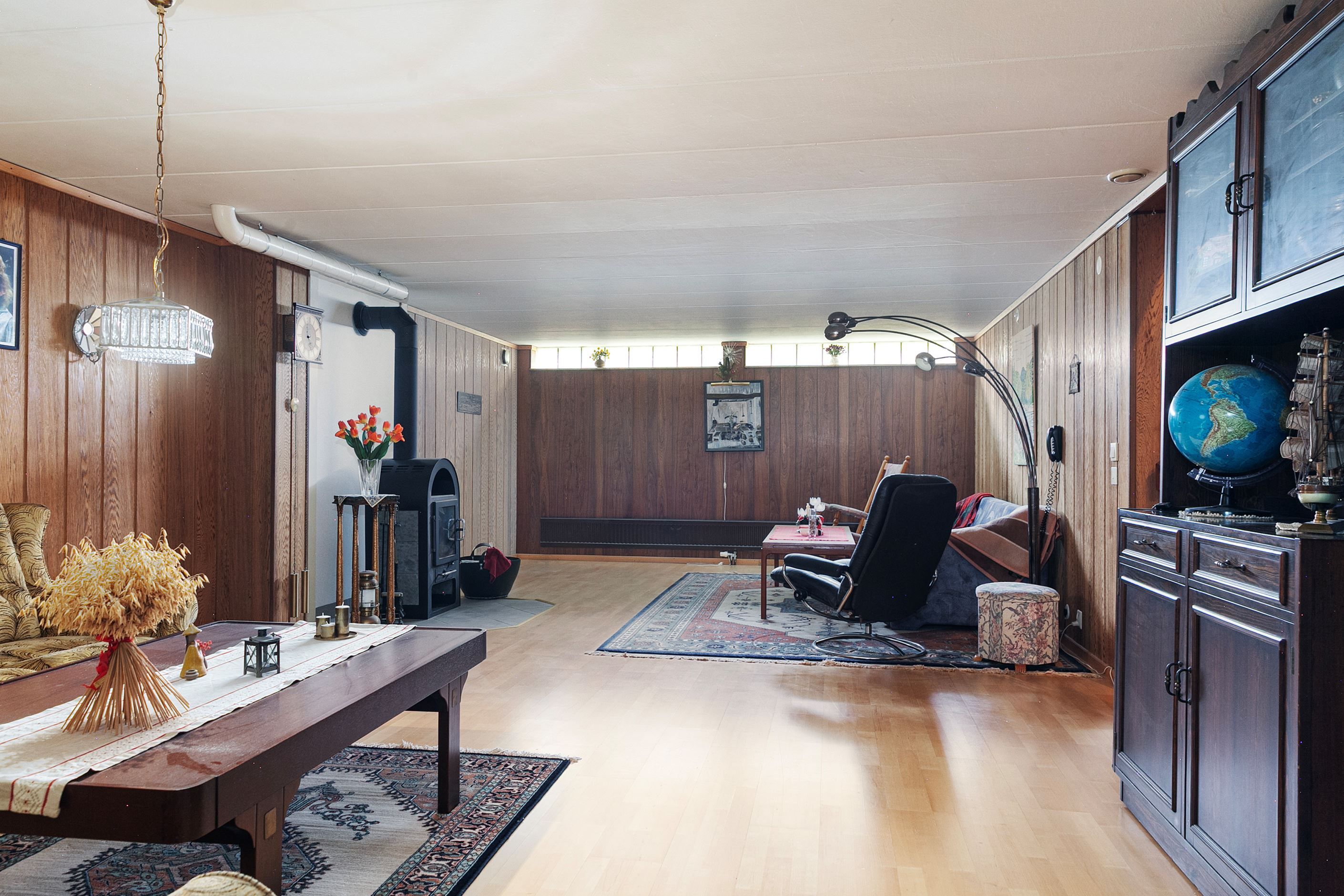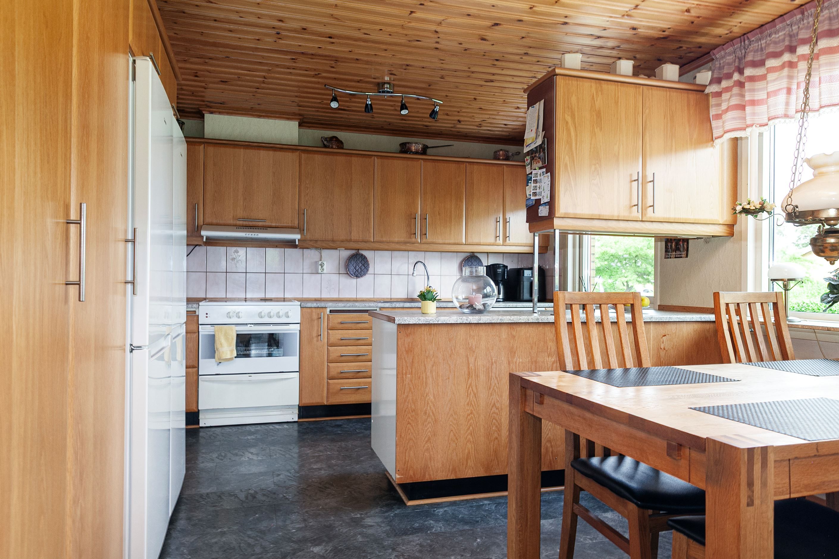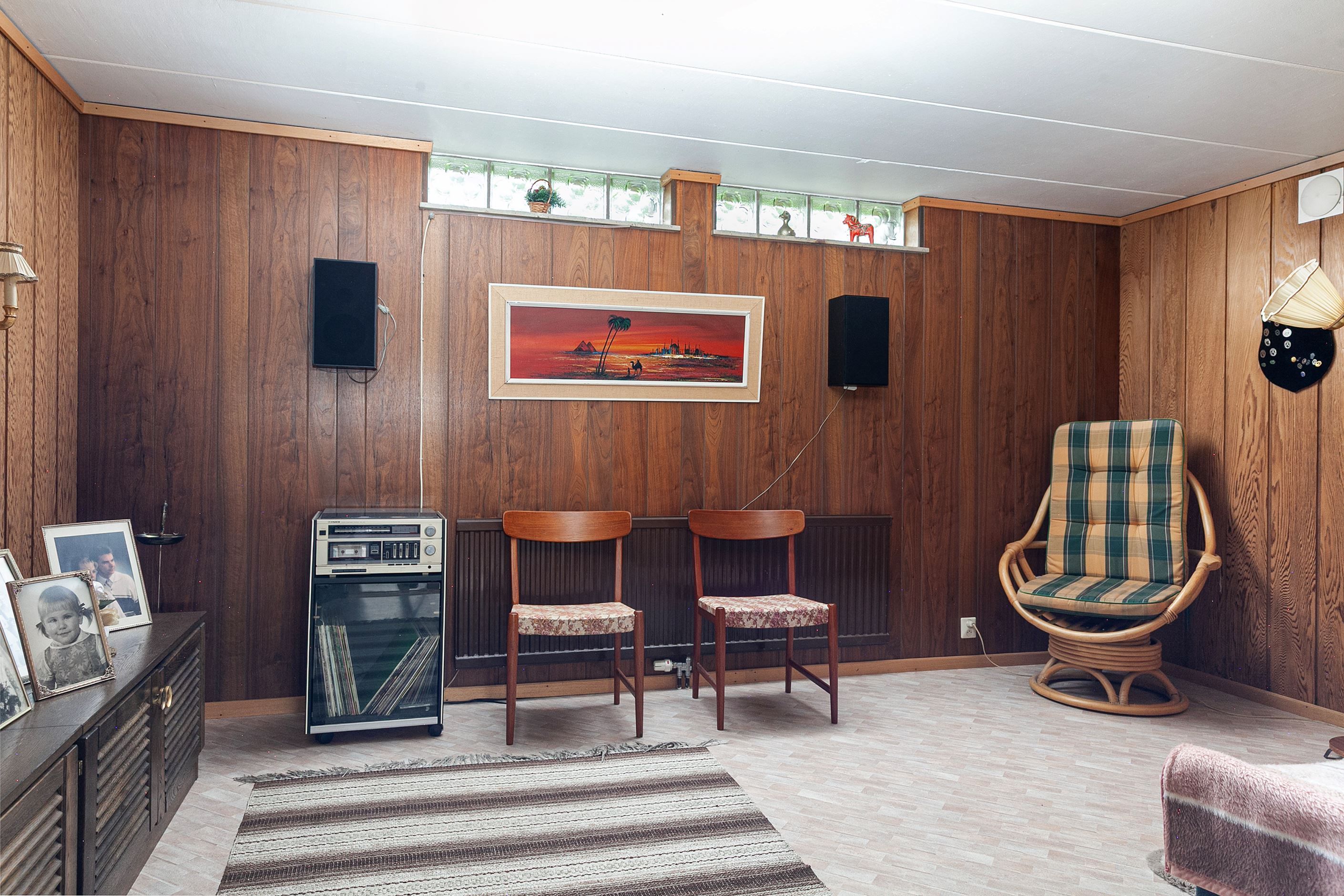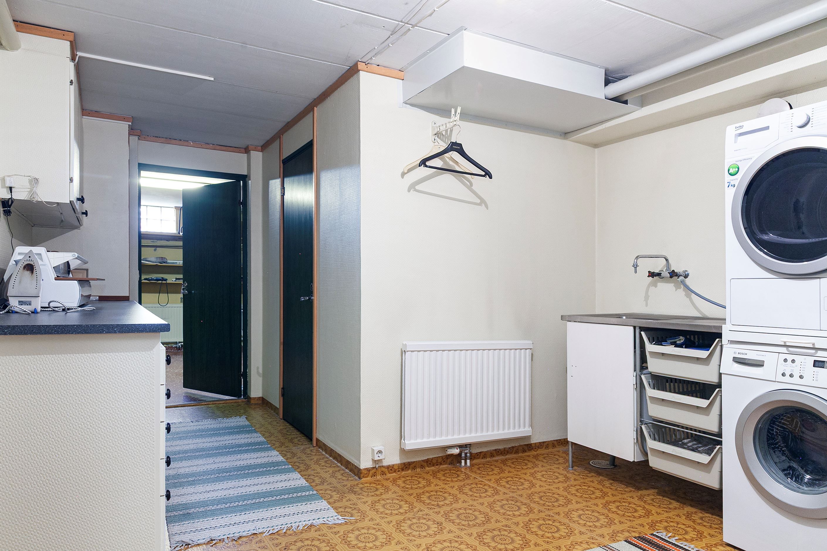 På entréplanet finns tre sovrum, ett vardagsrum med utgång till en stenlagd uteplats samt ett kök med matplats. Köket är utrustat med bland annat två nya kyl/frysar från 2024. Här finns även badrum med golvvärme samt en gästtoalett. I källaren finns flera användbara ytor som gillestuga med kamin, gästrum, tvättstuga, verkstad och gott om förråd.