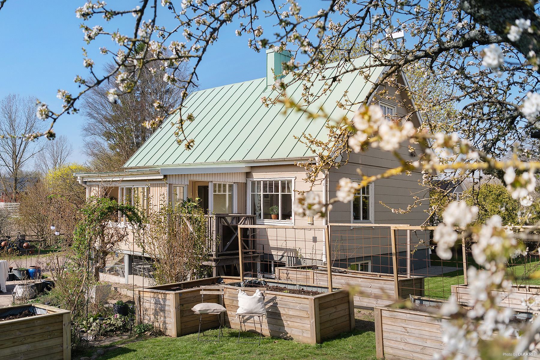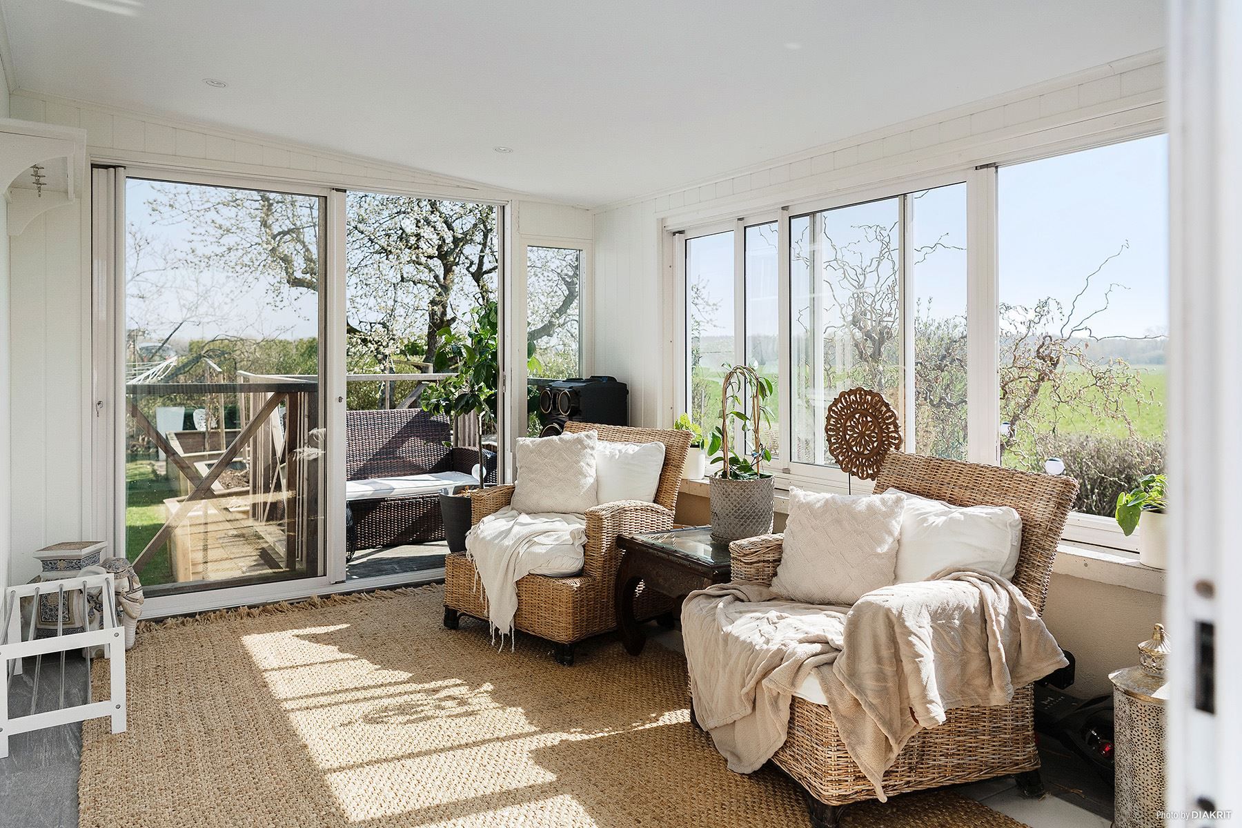 Det inglasade uterummet med golvvärme vetter mot trädgården och naturen – en perfekt plats för morgonkaffet. Den stora trädgården bjuder på fruktträd, bärbuskar, odlingslådor och ett charmigt växthus från 2020 med handslaget tegelgolv.