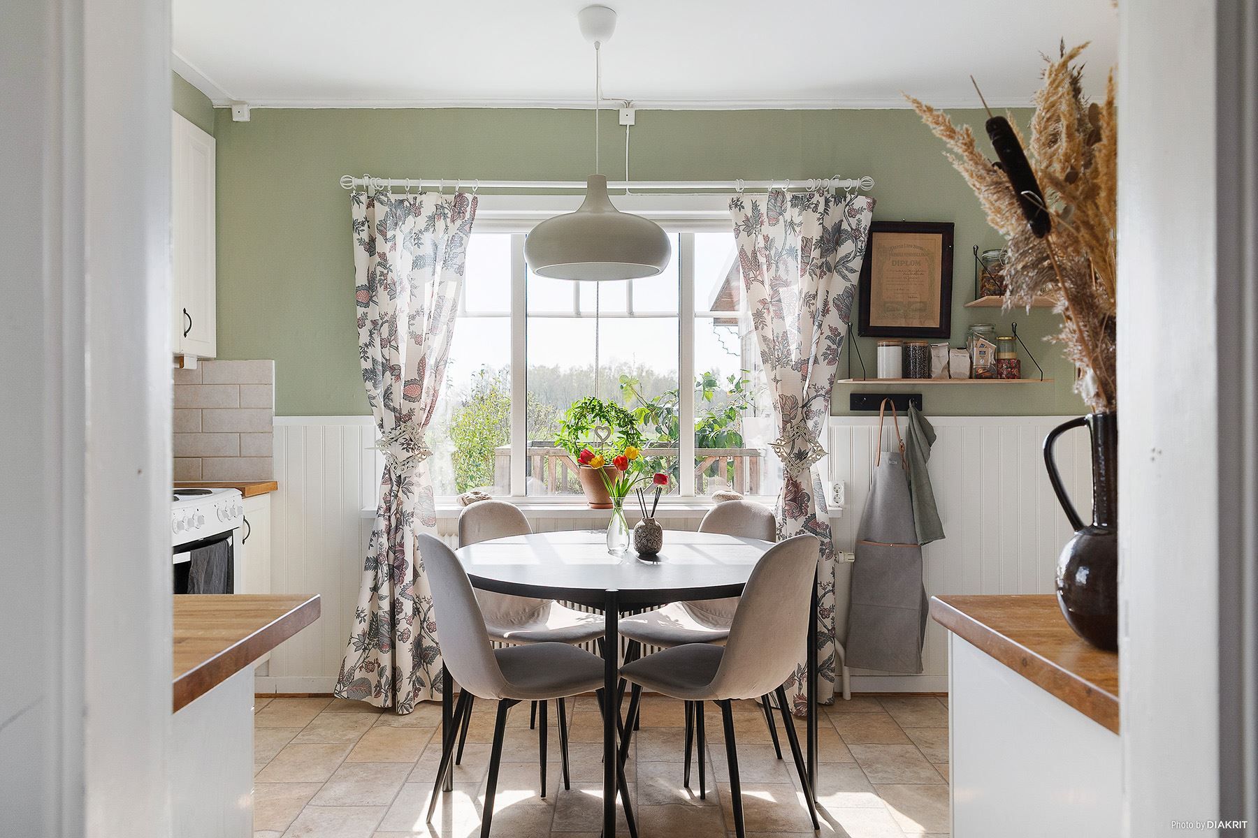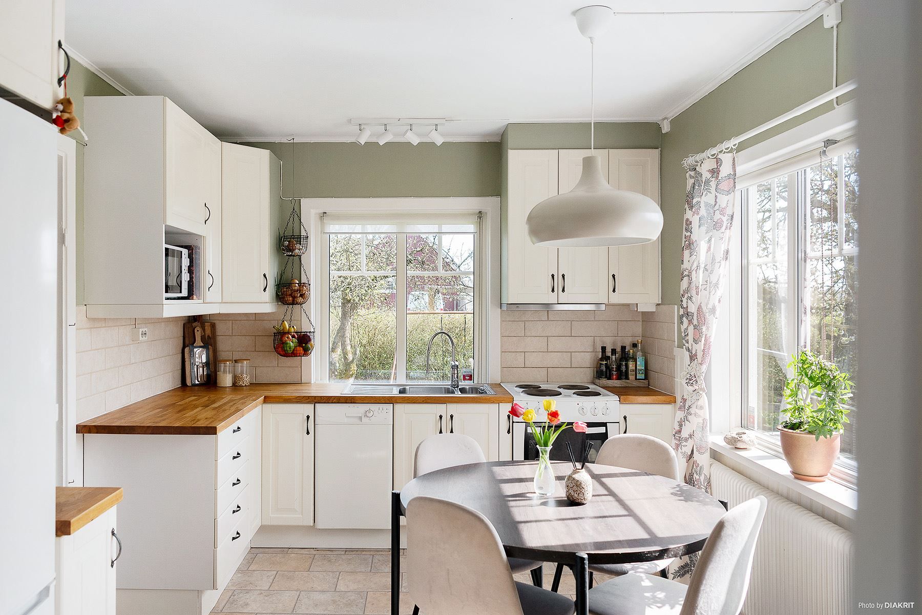 Invändigt finns ett ljust kök från 2009, helkaklat badrum från 2020 samt ett luftigt vardagsrum med vackert trägolv och matrum i fil. På övervåningen finns två sovrum och ett mindre allrum.