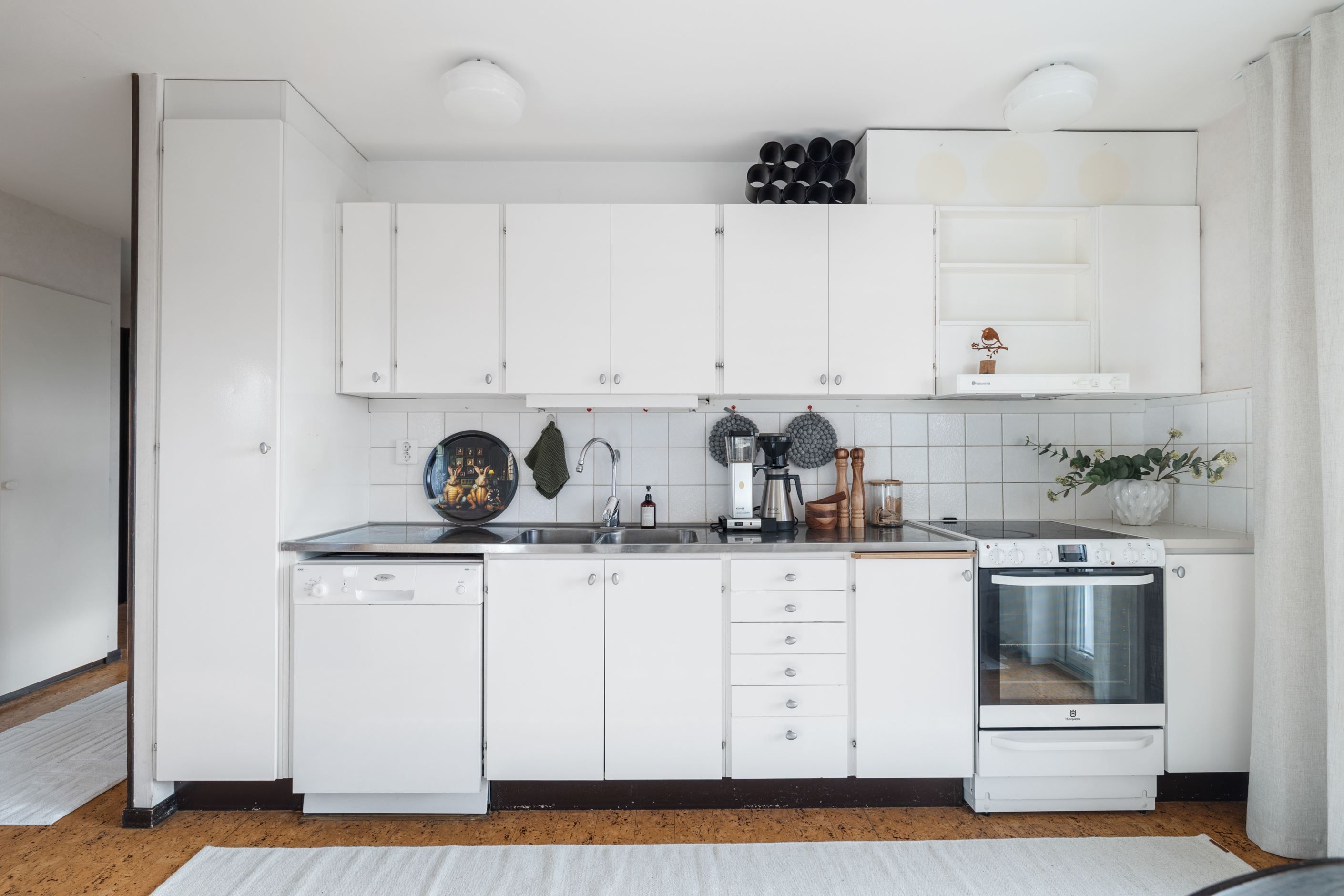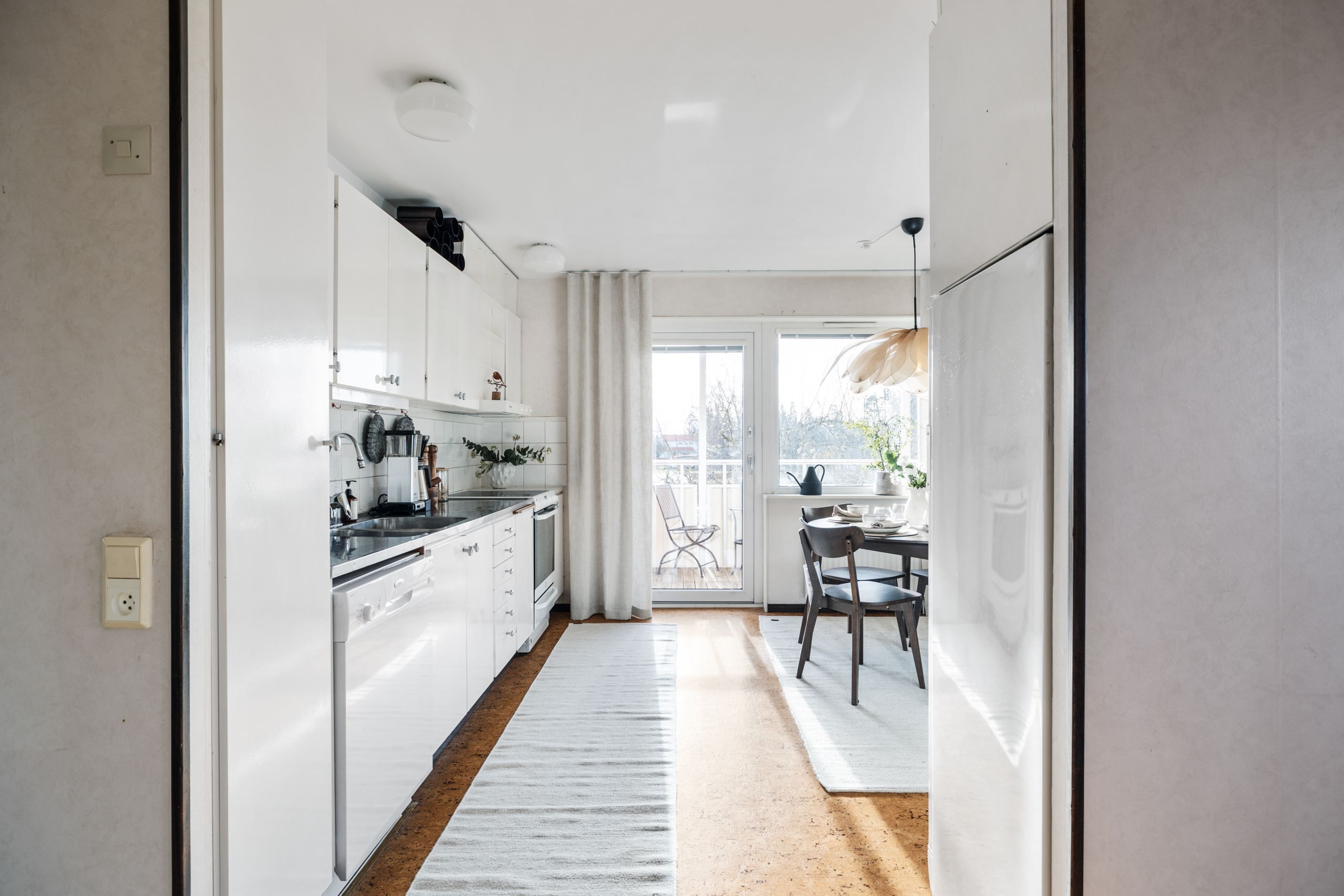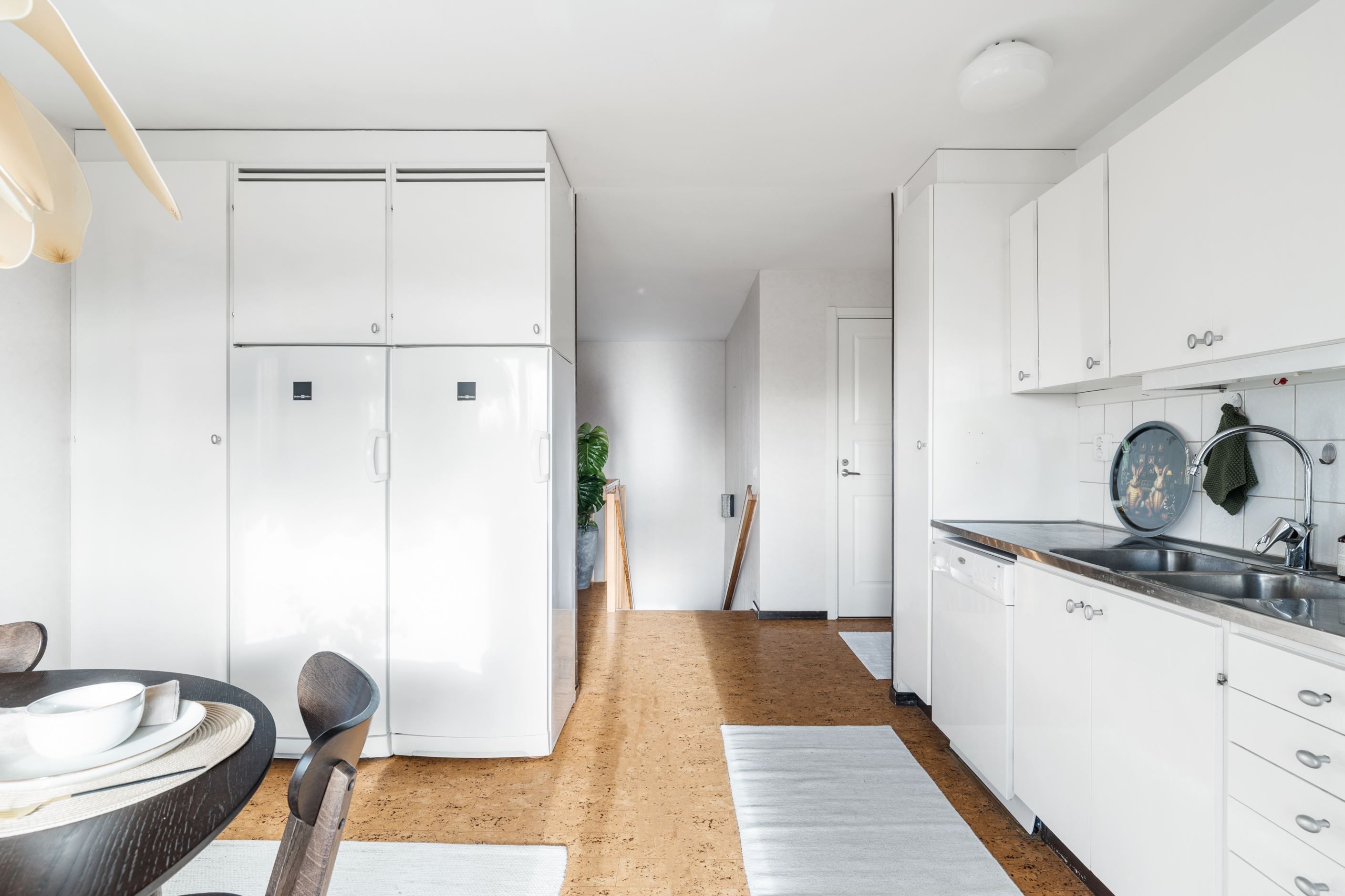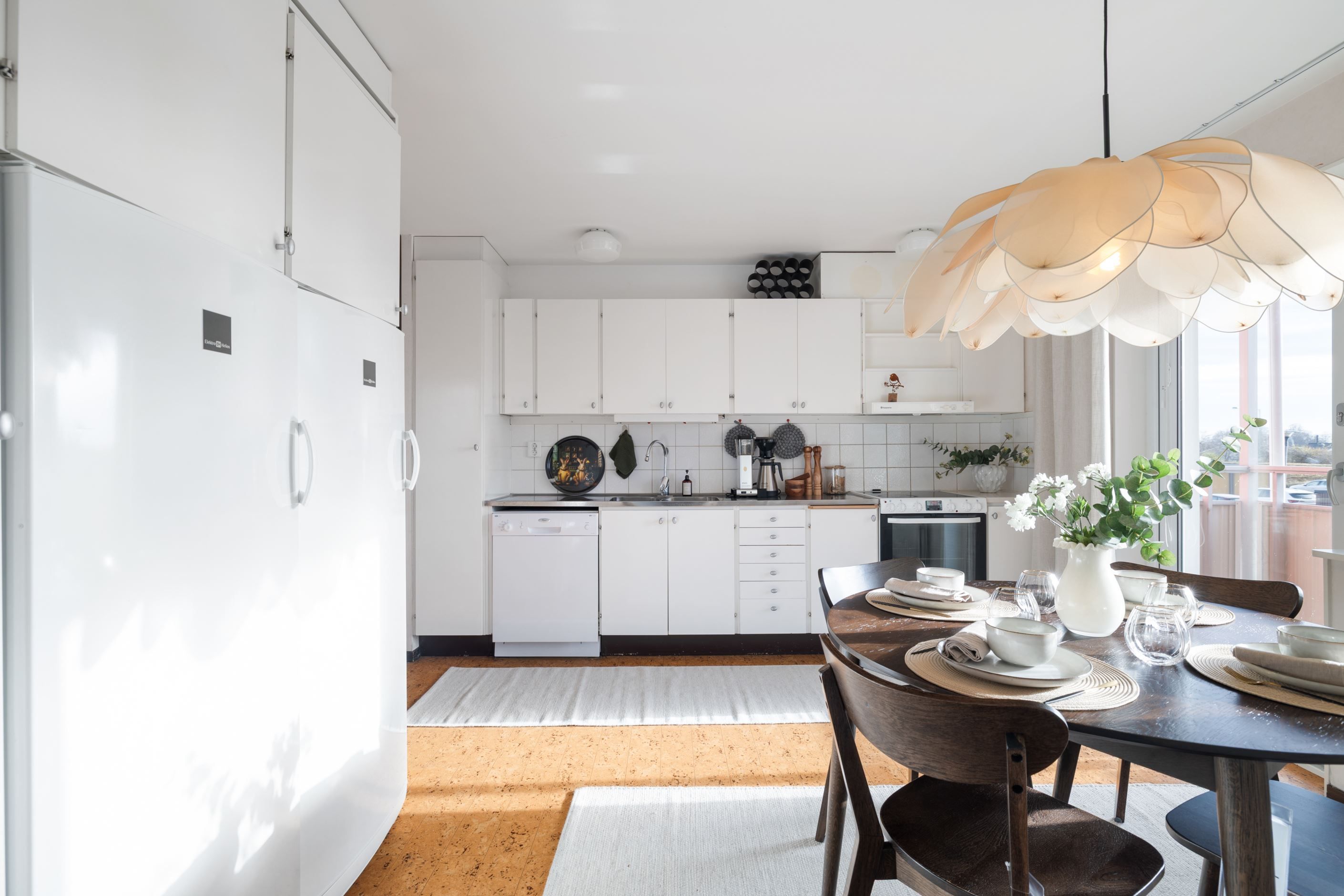 Köket har en tidlös och hemtrevlig känsla med vita skåpluckor, fullstor kyl och frys, diskmaskin samt spis. Här finns gott om plats för ett matbord – perfekt för både vardagsmiddagar och fikastunder med familj och vänner.
