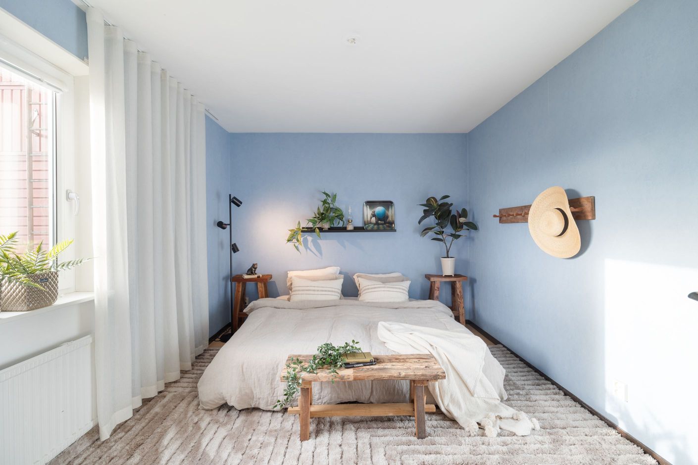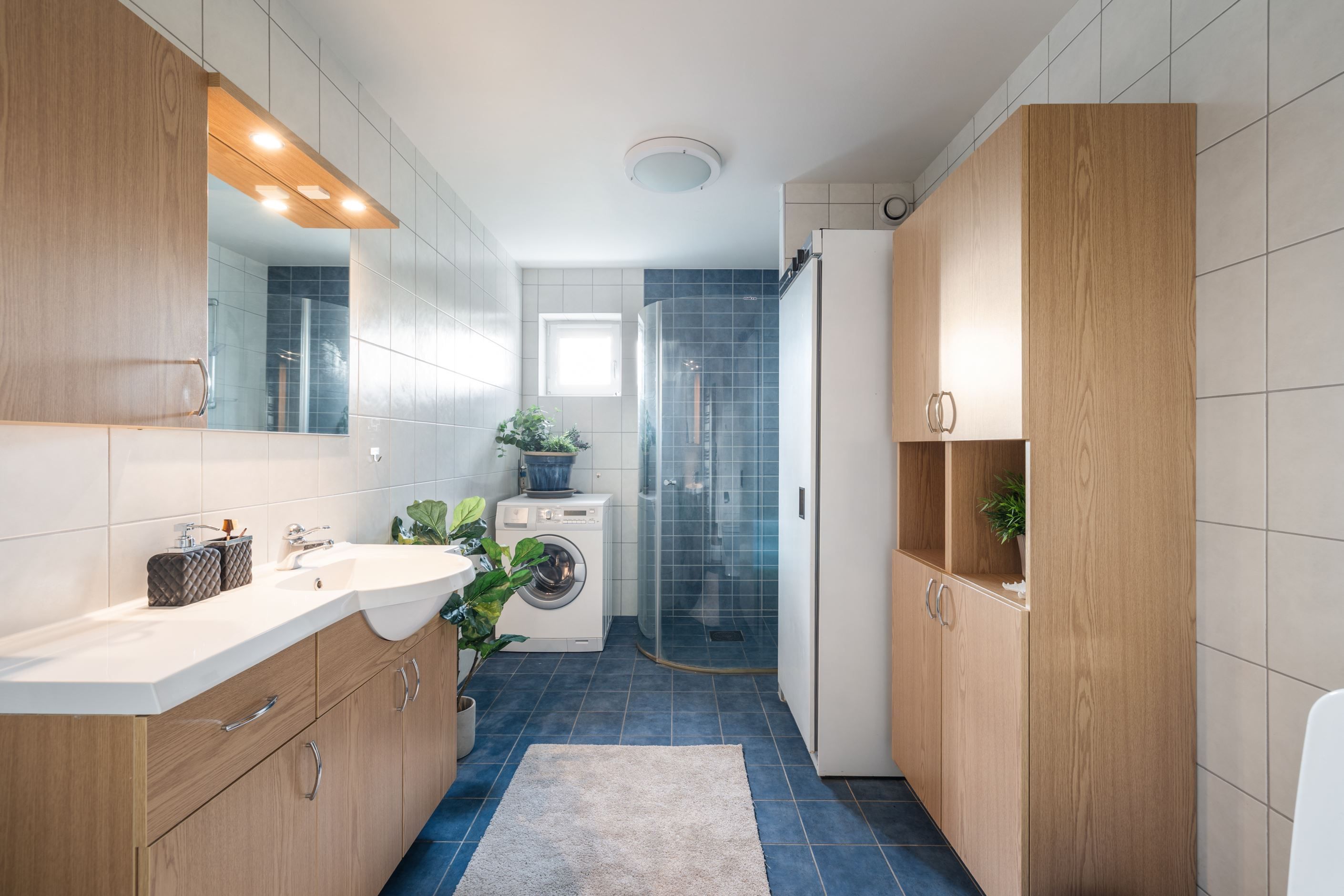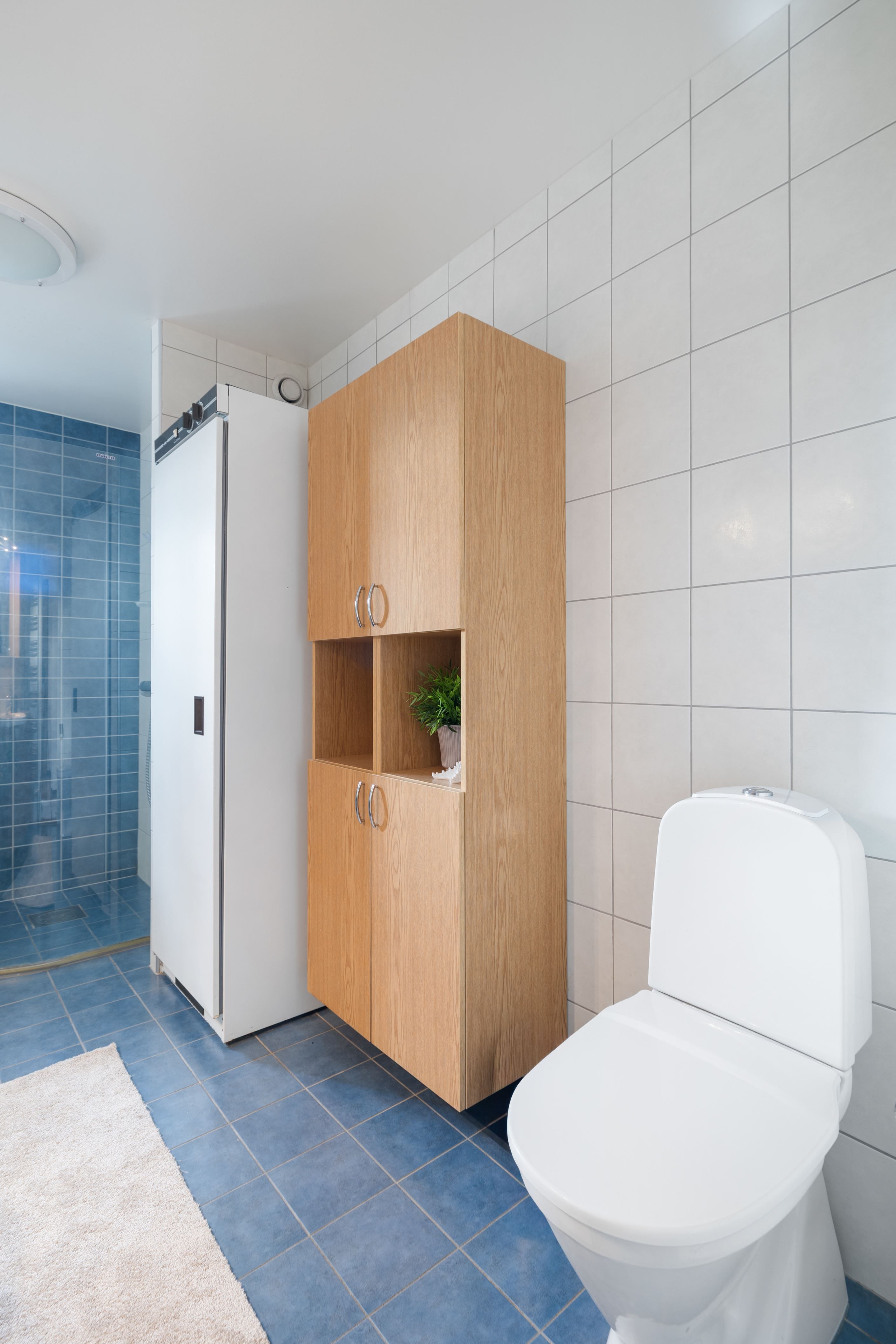 Vidare finns ett rymligt och rofyllt sovrum med gott om plats för både dubbelsäng och förvaring. I anslutning till hallen finns även en praktisk klädkammare och ett förråd, vilket ger goda förvaringsmöjligheter och en smidig vardag. Det helkaklade badrummet erbjuder tvättmaskin, torkskåp och generösa ytor – en trivsam och funktionell del av hemmet.