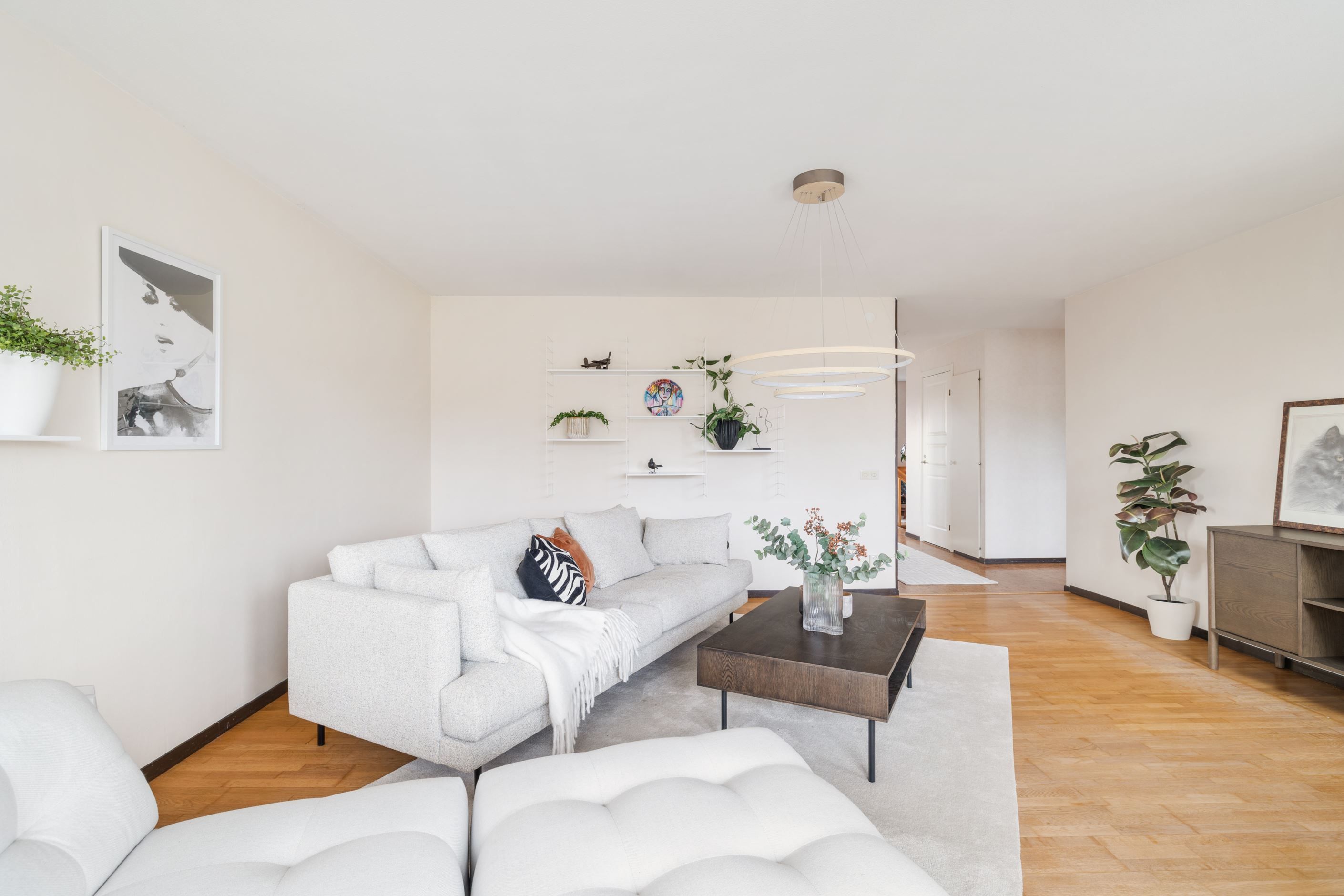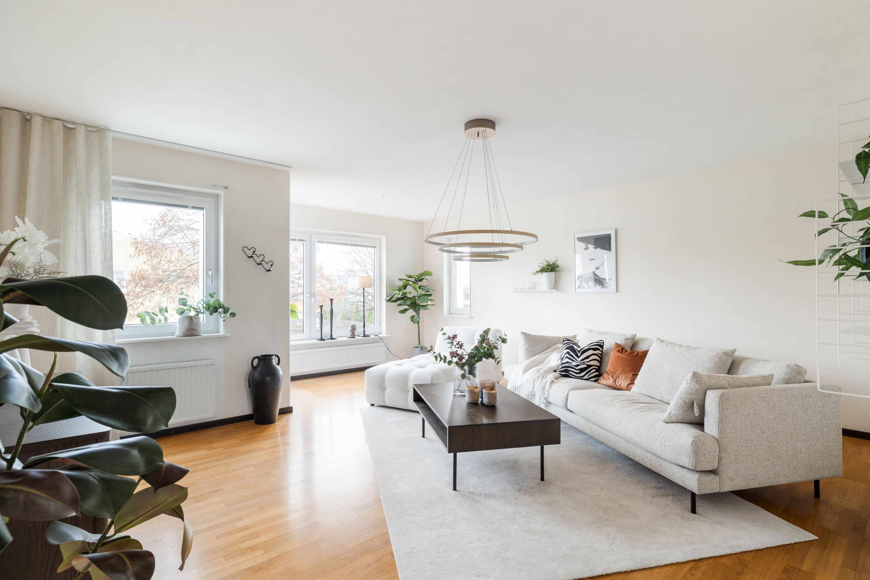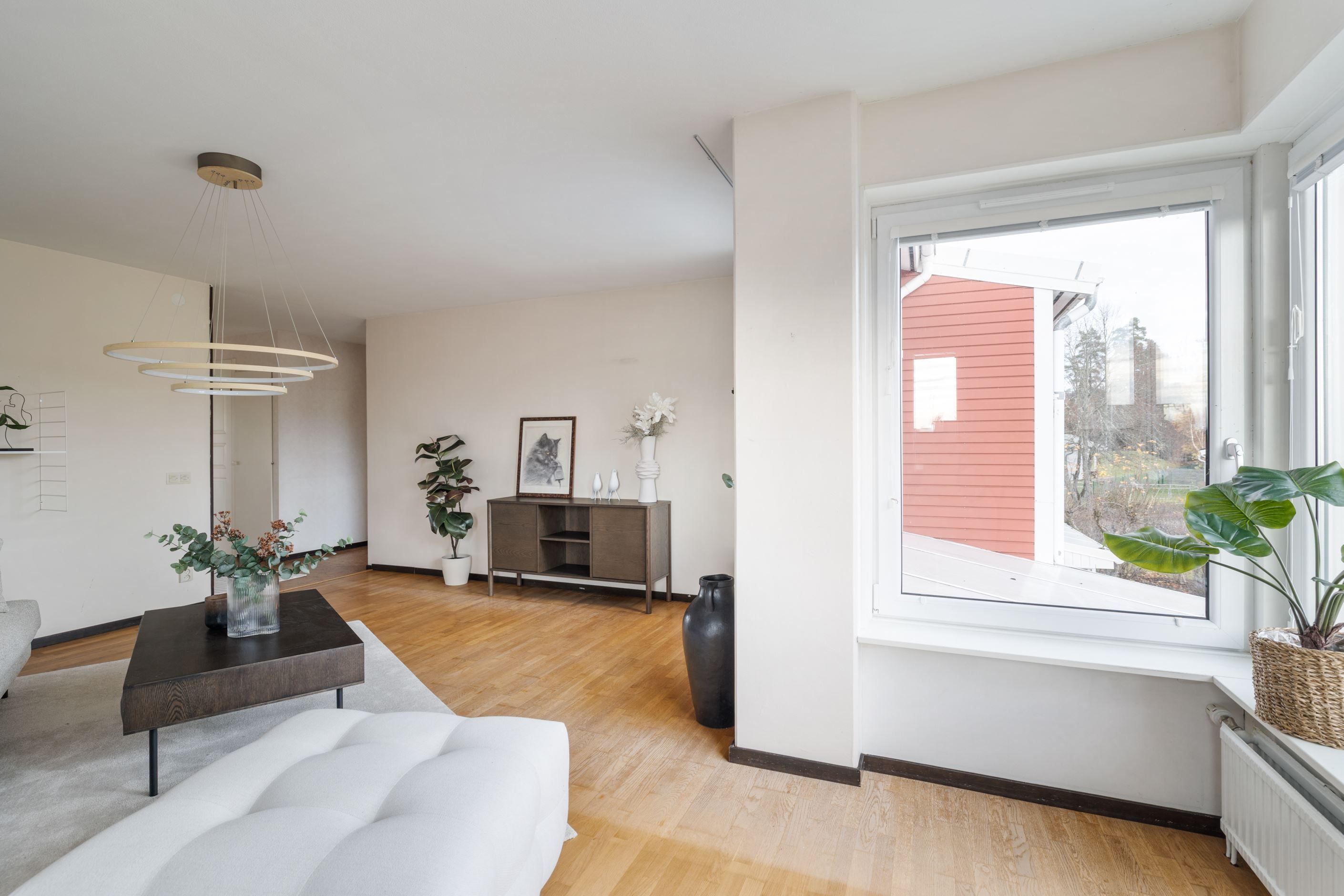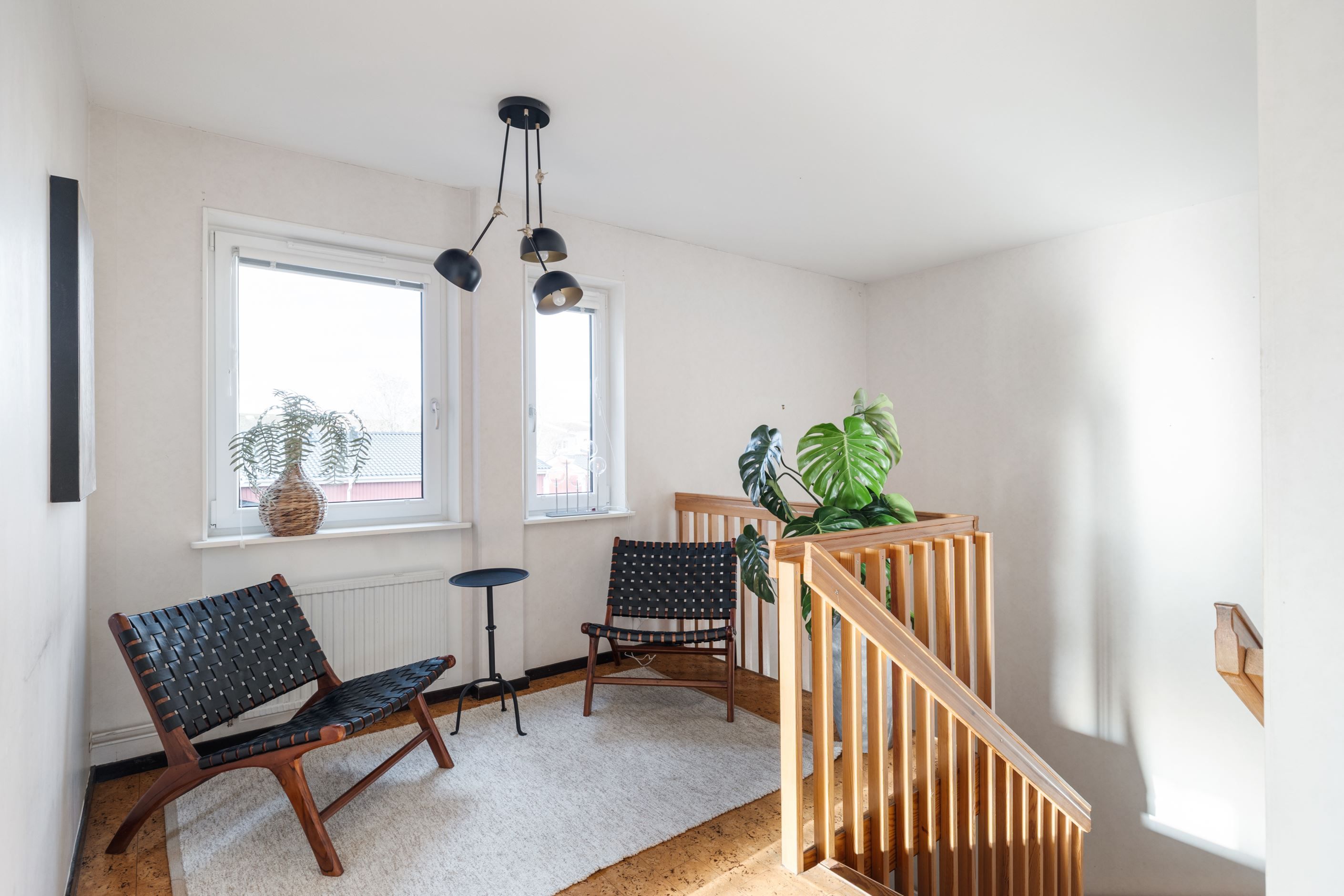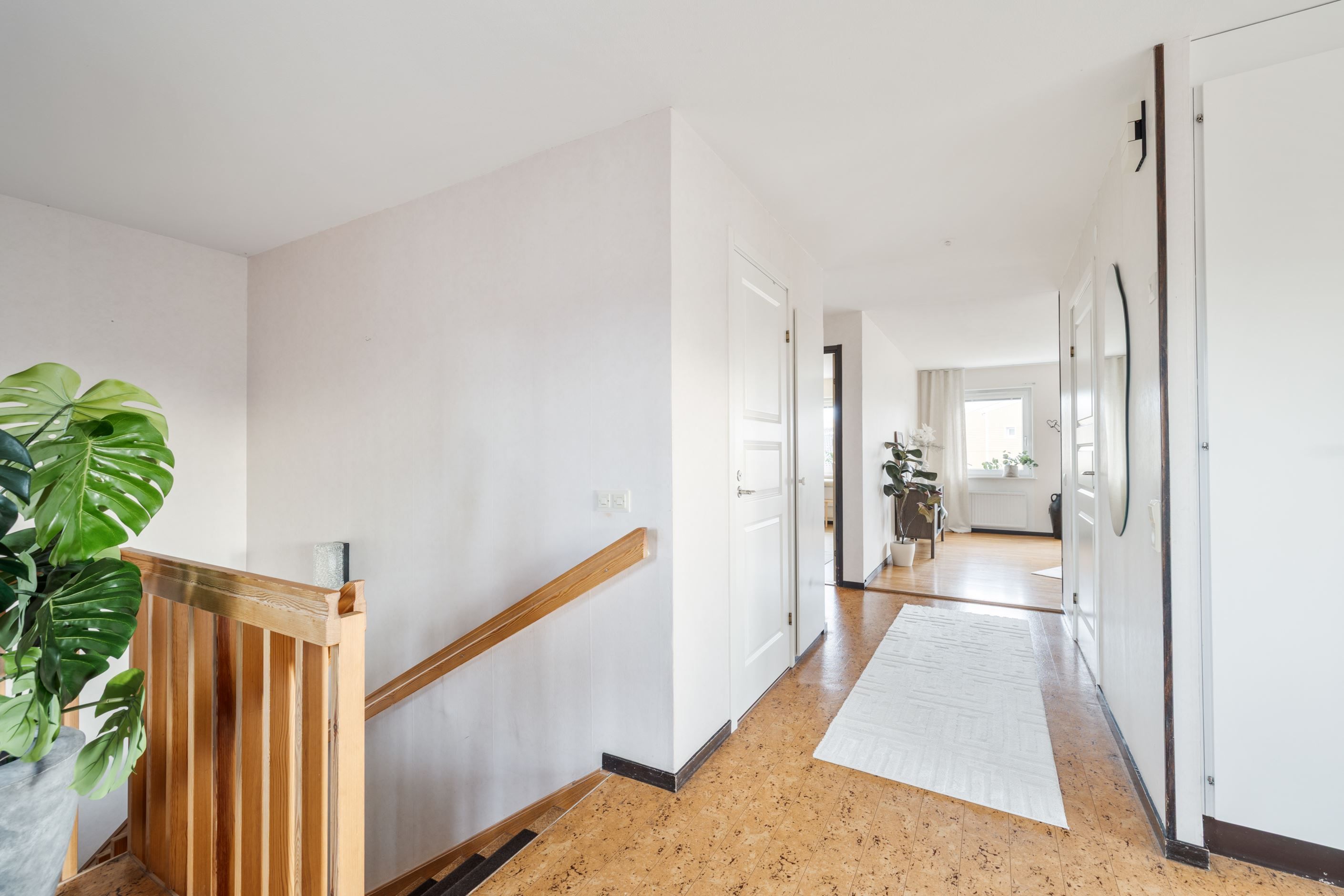När du kliver upp för trappan från hallen möts du av en inbjudande hall med plats för en mysig läshörna eller praktisk förvaring. Härifrån öppnar bostaden upp mot köket och ett stort, ljust vardagsrum med generösa fönsterpartier som låter ljuset flöda in. I vardagsrummet finns gott om plats för både soffgrupp och läshörna – en naturlig samlingsplats för familj och vänner.