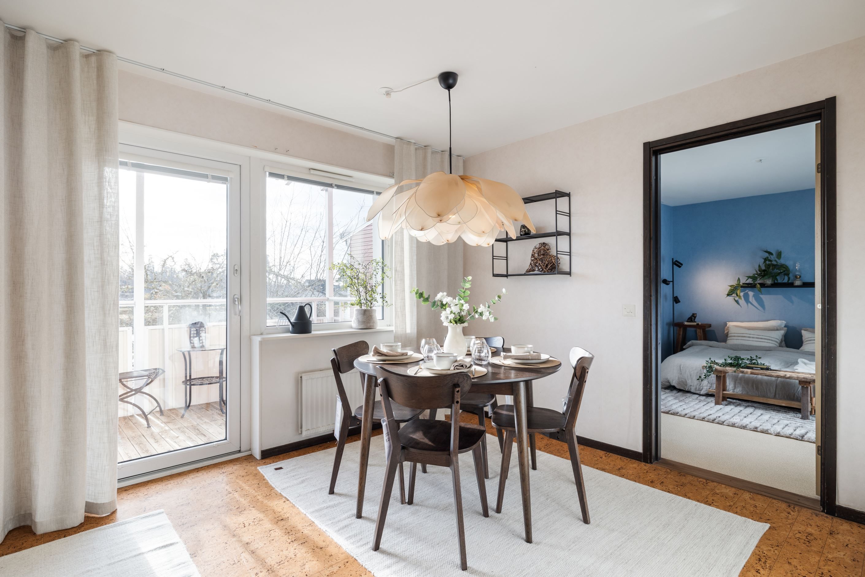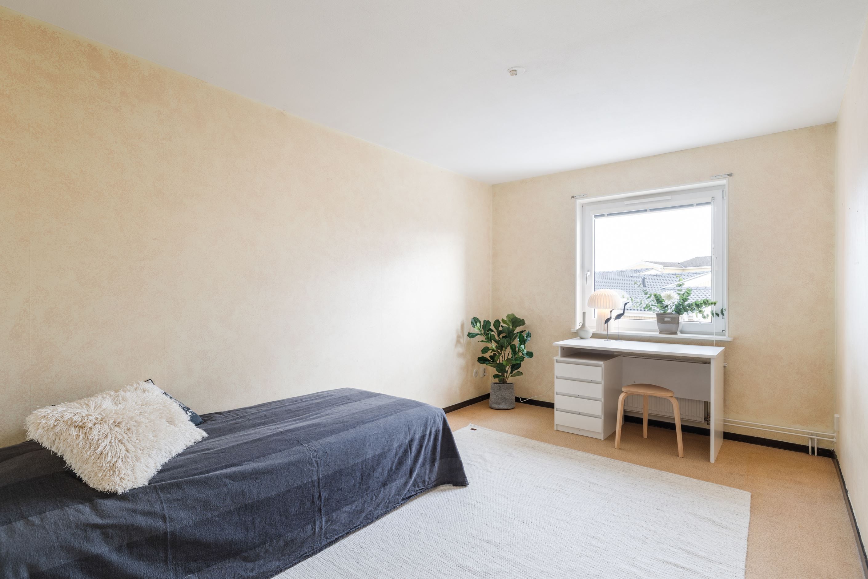 Från köket når du den mysiga balkongen i soligt läge, där du kan njuta av solen under stora delar av dagen. Rummet innanför köket har gott om plats för en dubbelsäng och används idag som sovrum. Det är ett trivsamt och flexibelt utrymme som även kan fungera som kontor eller hobbyrum – perfekt för att anpassa efter familjens behov.