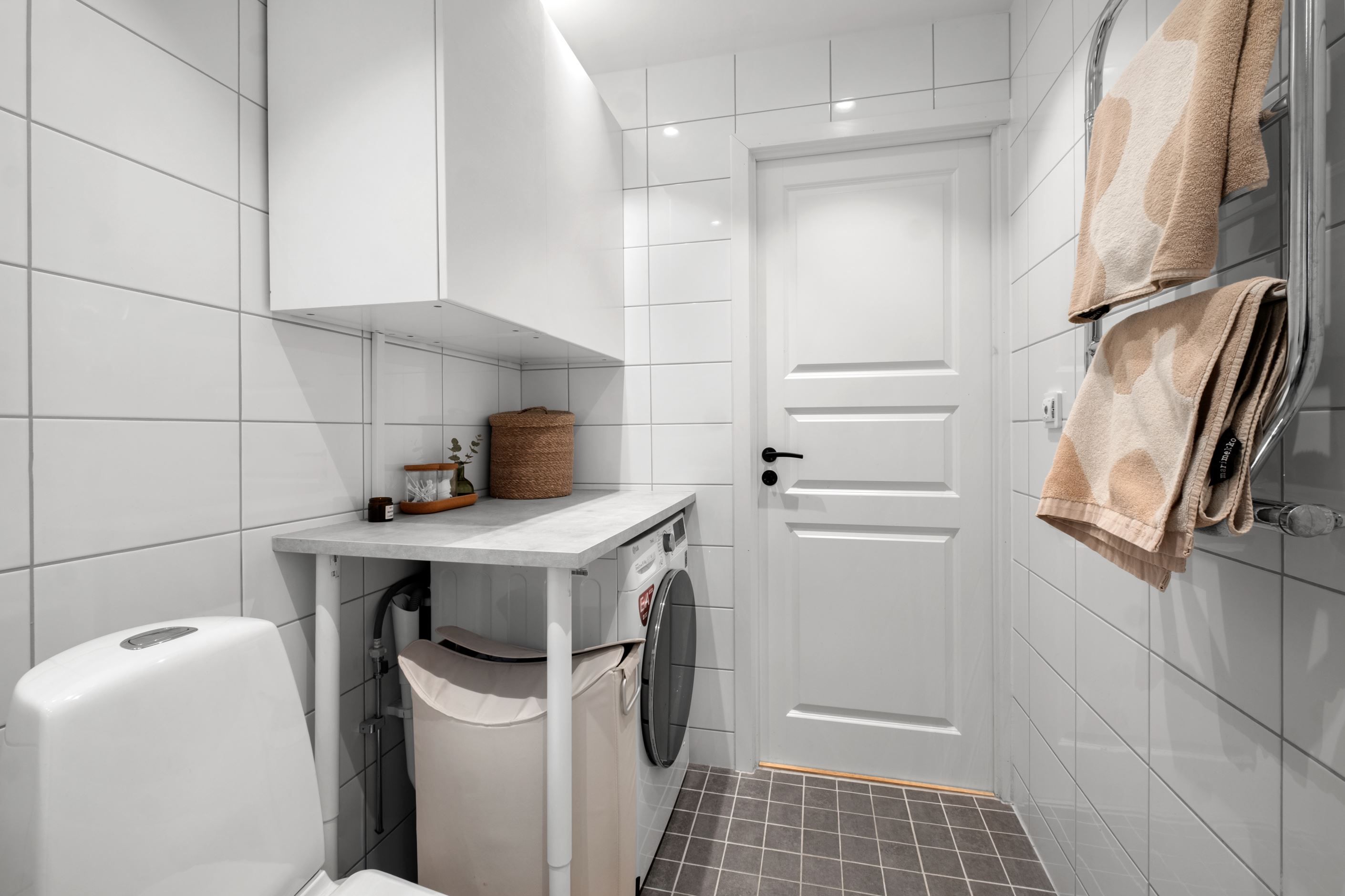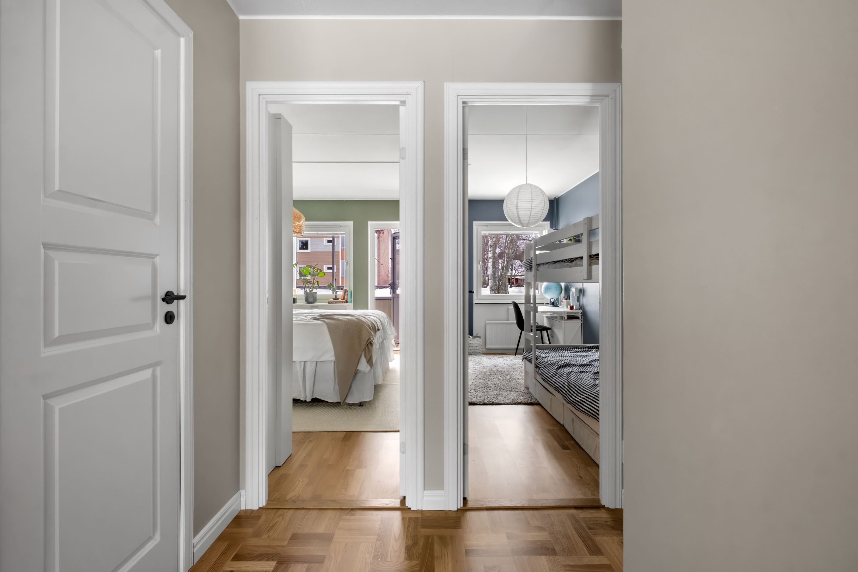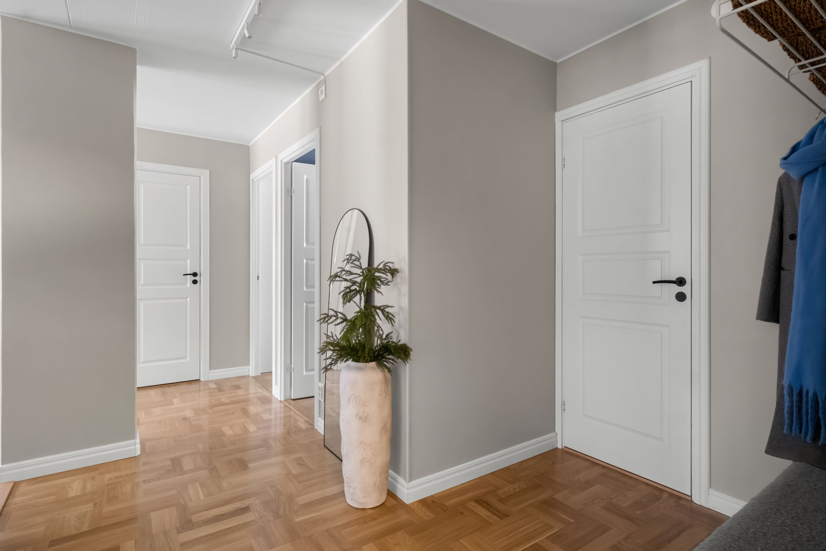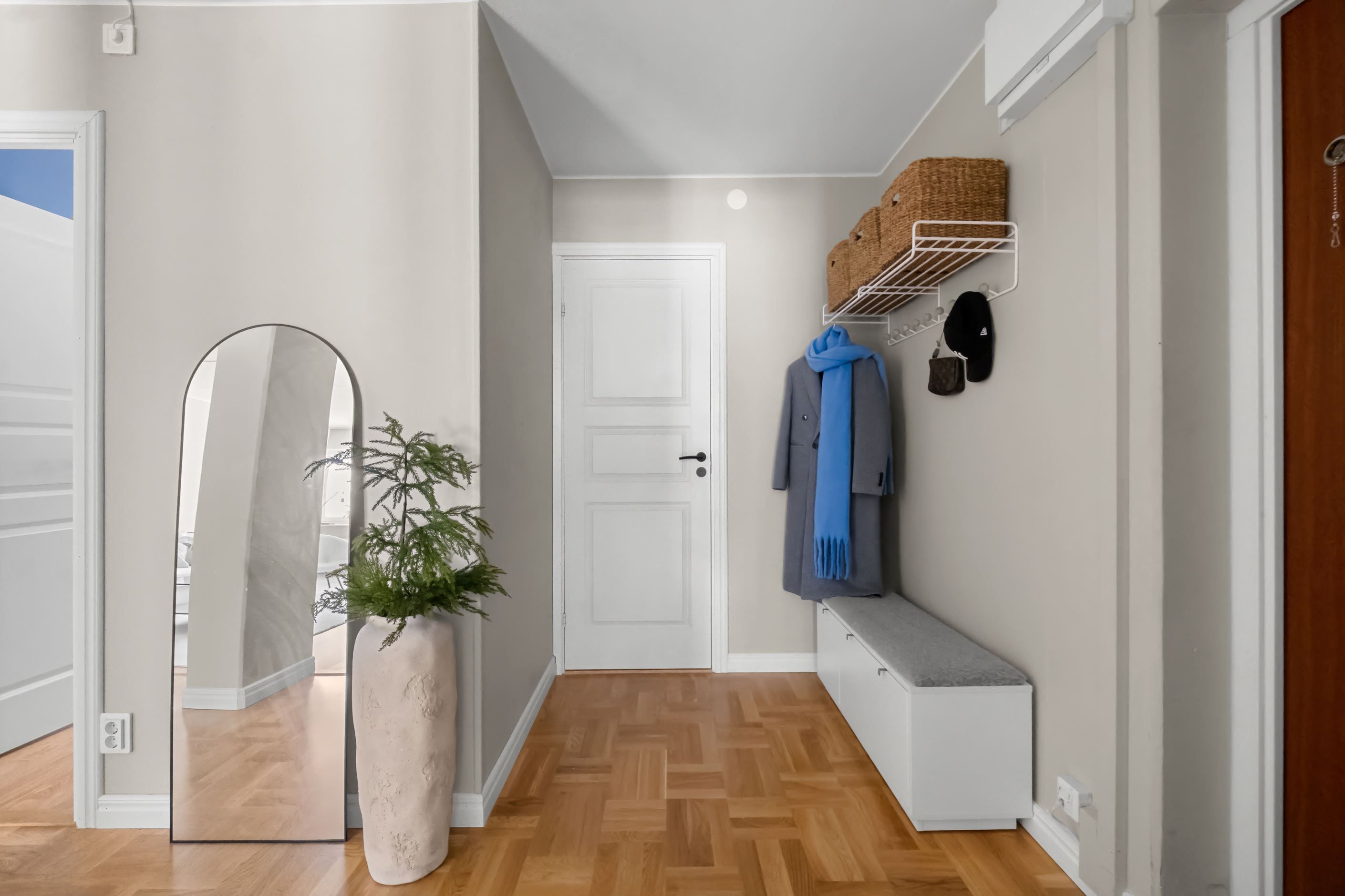 Redan i den rymliga hallen finns garderob och plats för avhängning. Via den inre hallen nås en praktisk walk-in-closet som ger extra förvaring och ordning i vardagen. Lägenheten har även ett tillhörande förråd.