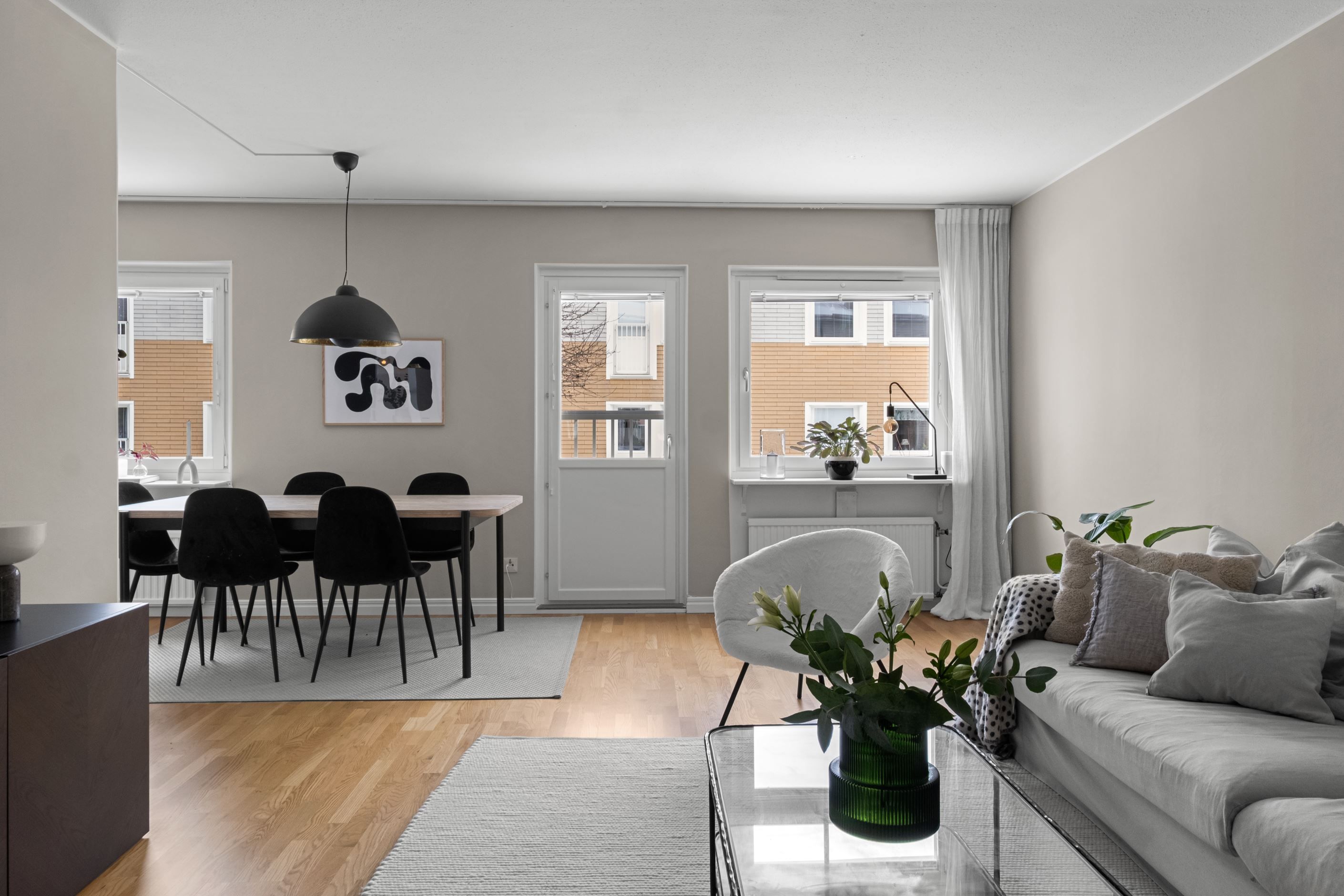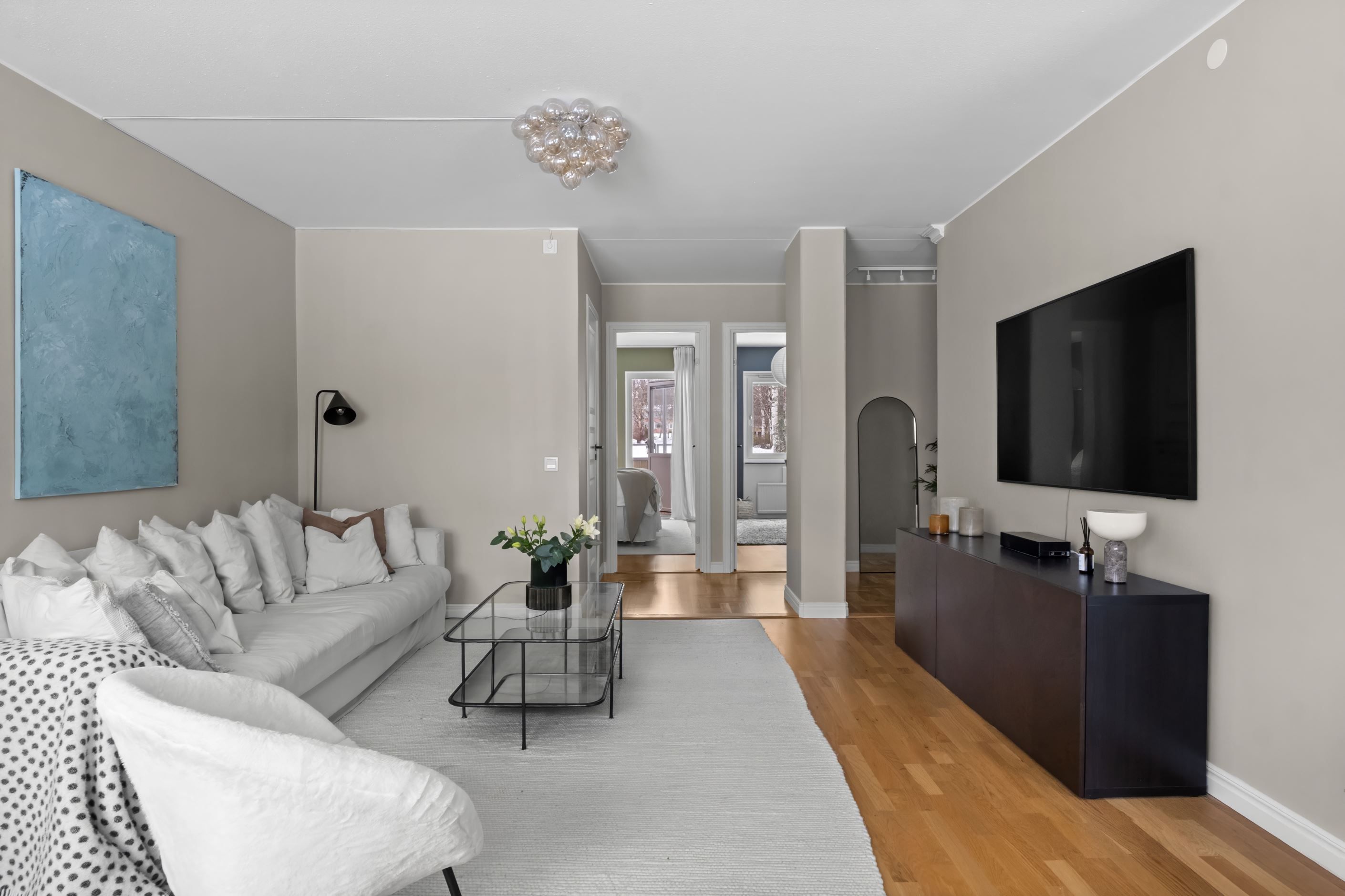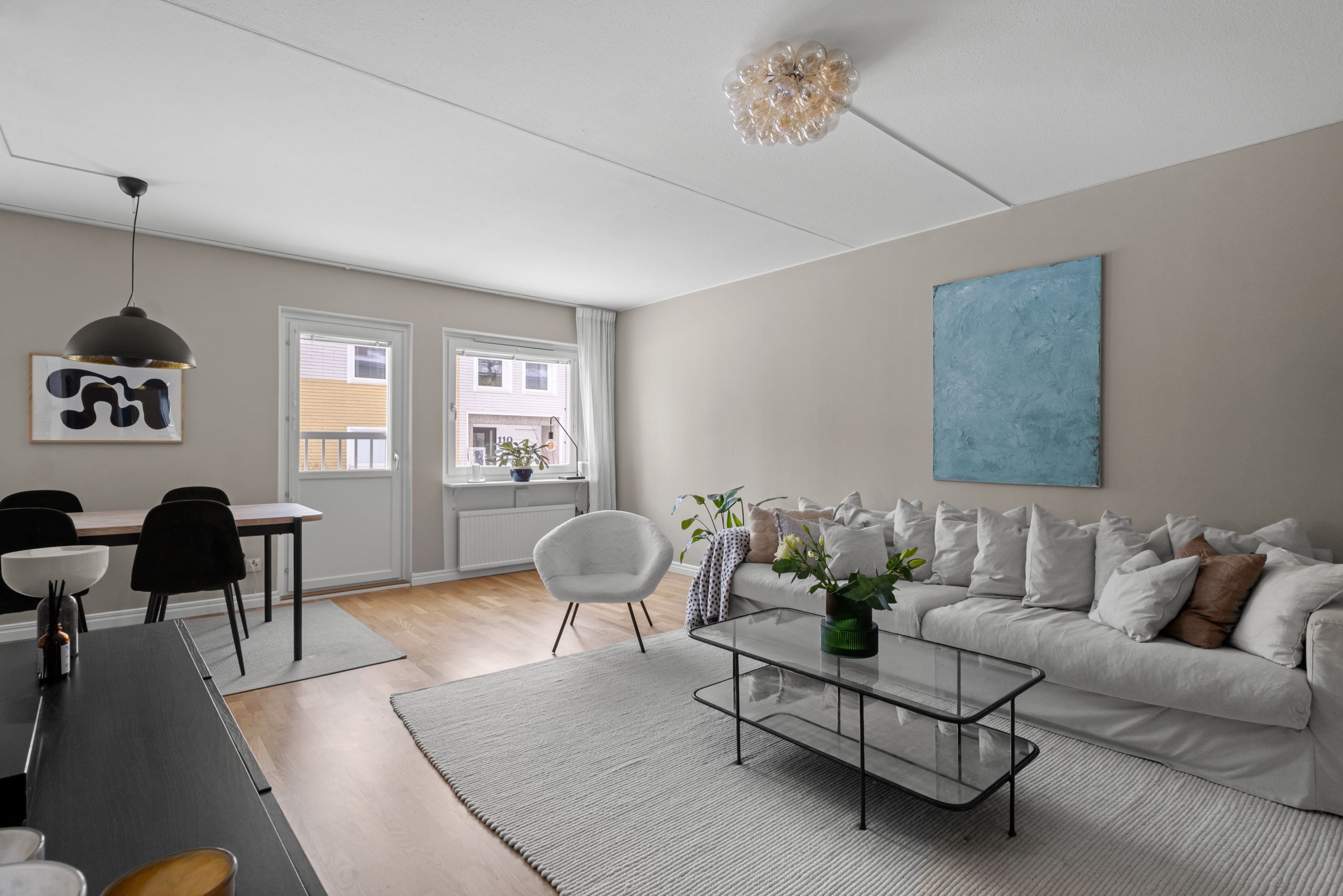 Det stora vardagsrummet har öppen planlösning mot kök och rymmer enkelt både soffgrupp och tv-möblemang. Generösa fönster samt fransk balkong ger ett härligt ljusinsläpp och skapar en trivsam atmosfär. Det nya, eleganta köket är utrustat med moderna vitvaror och har plats för matbord vid fönster.