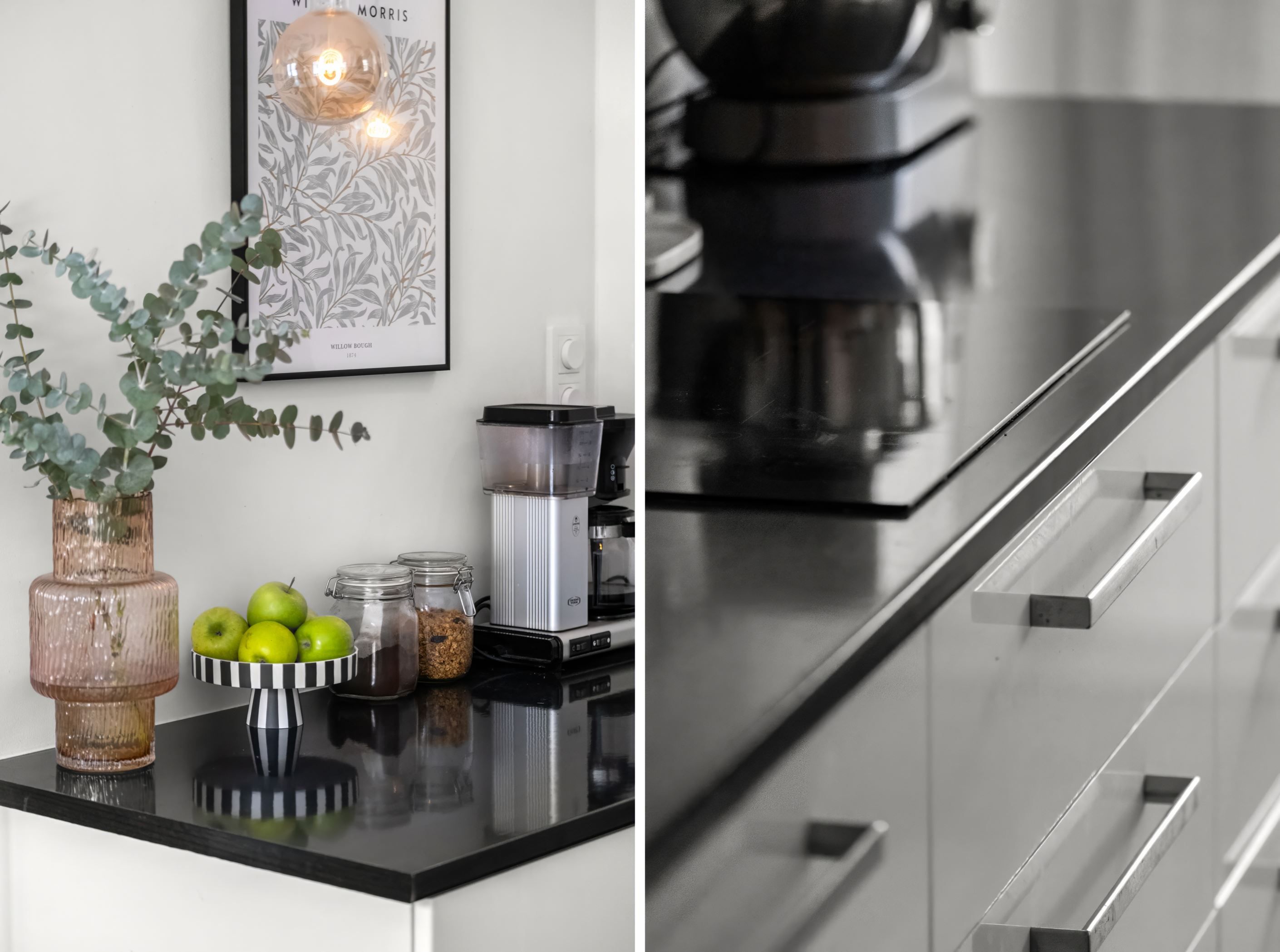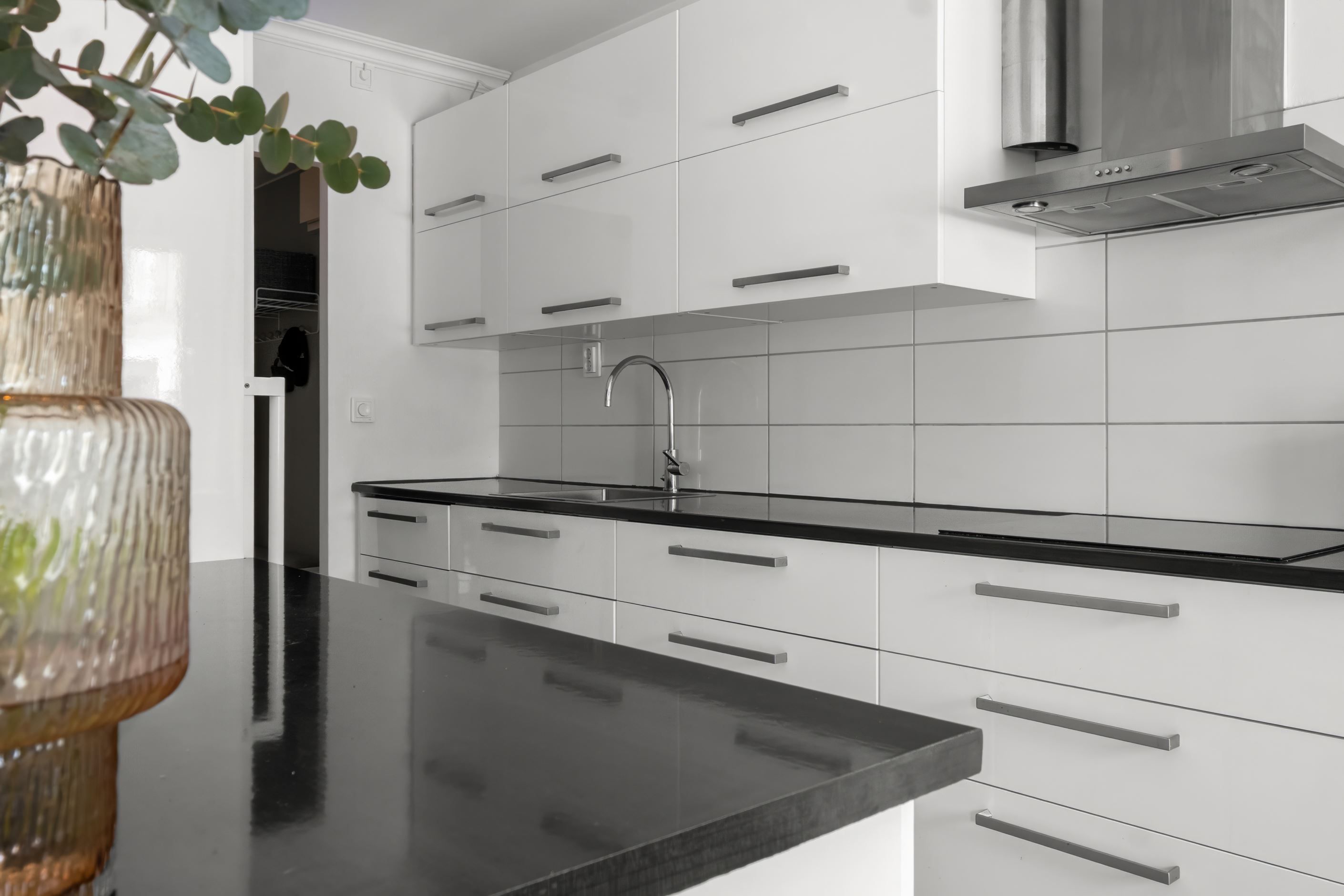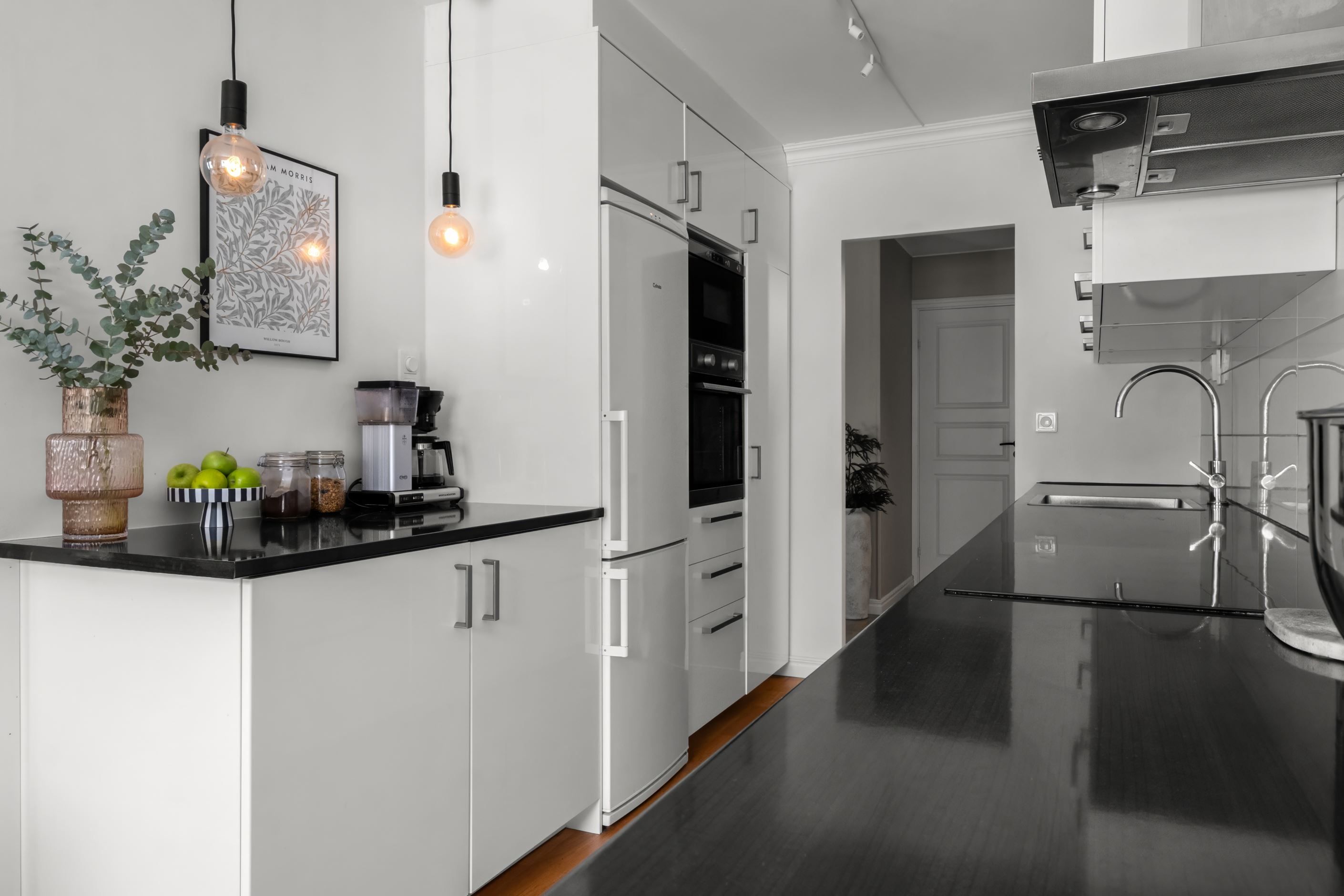 Det stora vardagsrummet har öppen planlösning mot kök och rymmer enkelt både soffgrupp och tv-möblemang. Generösa fönster samt fransk balkong ger ett härligt ljusinsläpp och skapar en trivsam atmosfär. Det nya, eleganta köket är utrustat med moderna vitvaror och har plats för matbord vid fönster.