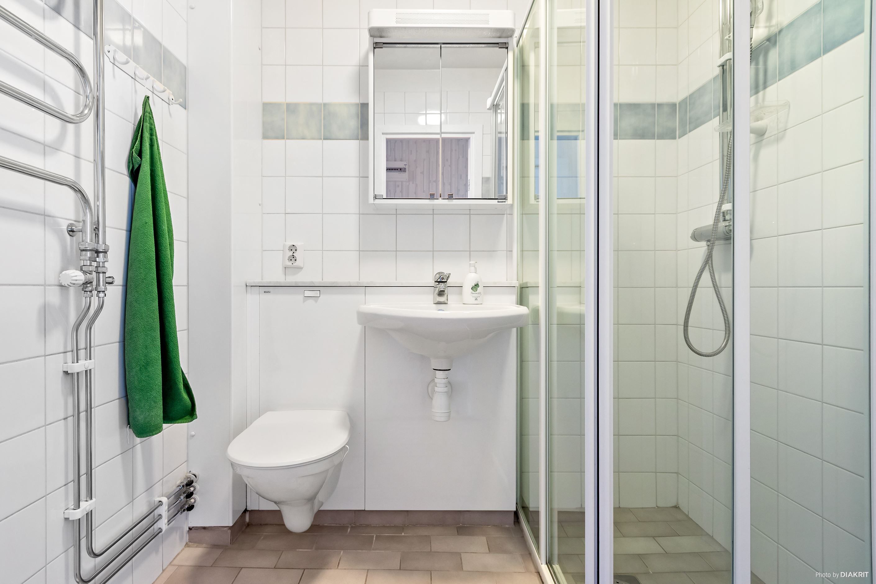 Helkaklat badrum renoverat i samband med föreningens stambyte. Badrummet är utrustat med duschhörna, vägghängd toalett, handdukstork, handfat med avlastningshylla i marmor och spegel med belysning, samt förberett för tvättmaskin.