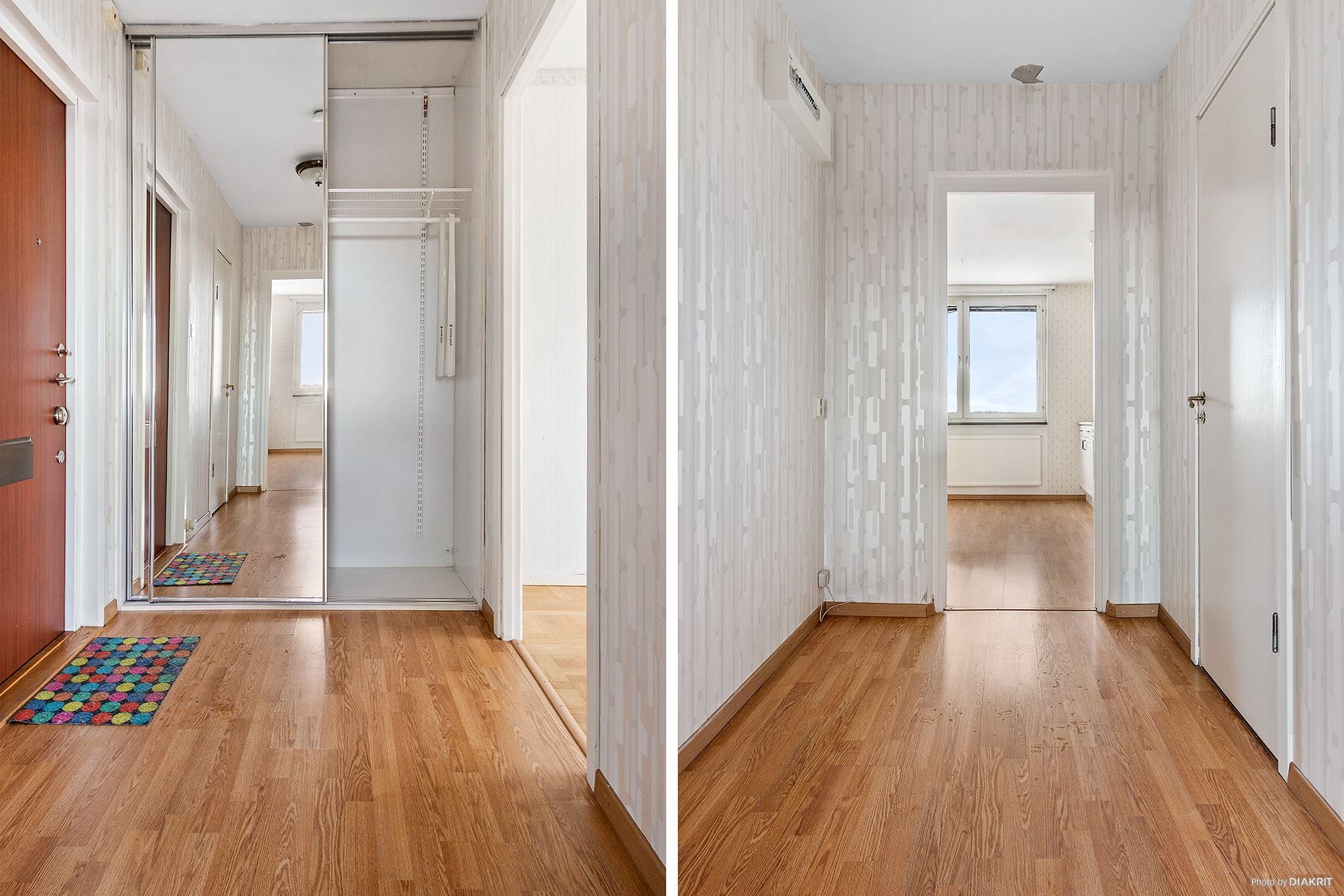Praktisk hall med plats för avhängning i skjutdörrsgarderob och plats för möblemang.