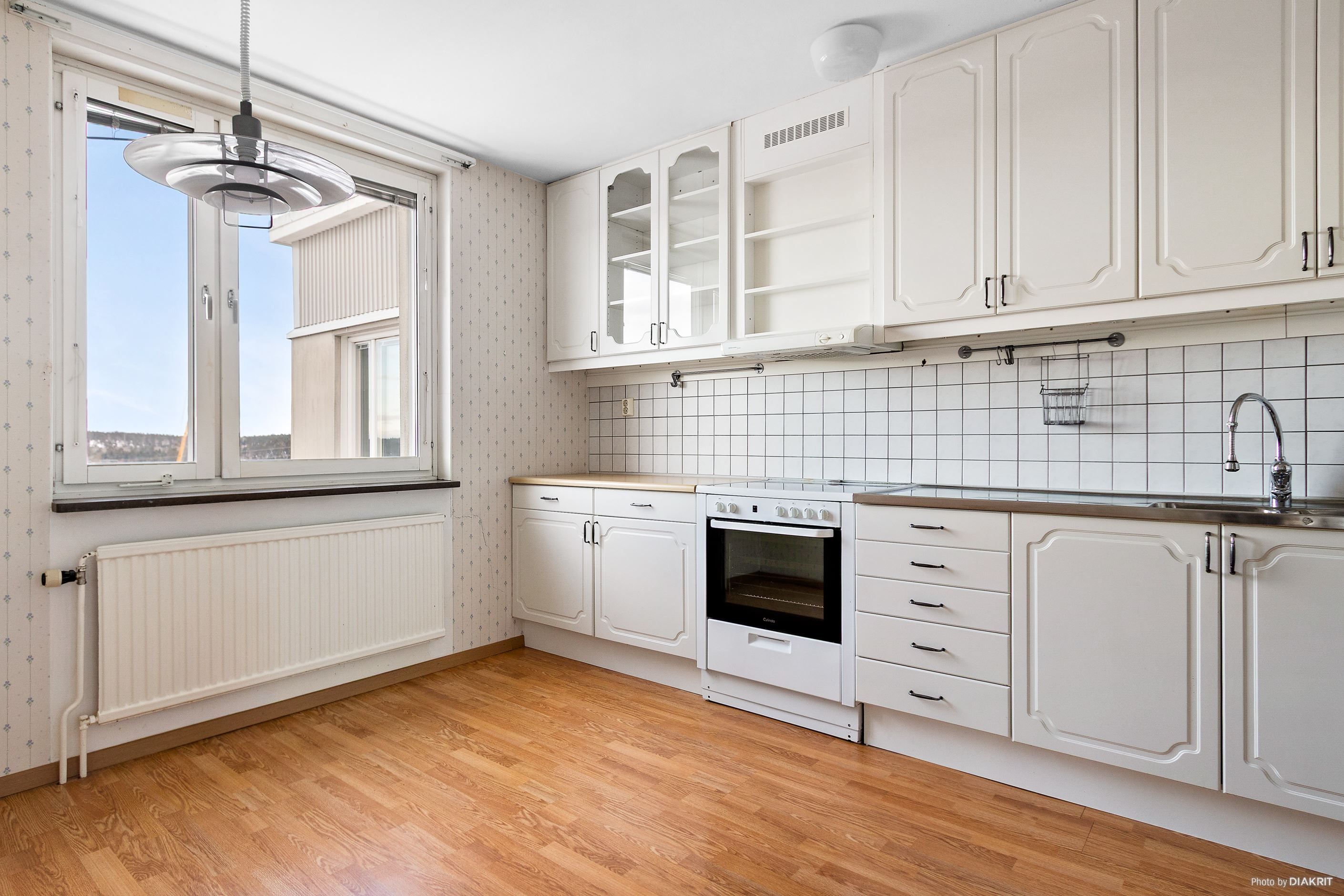 Kök med plats för matplats vid fönster. Köket har gott om förvaringsmöjligheter och bra arbetsyta.