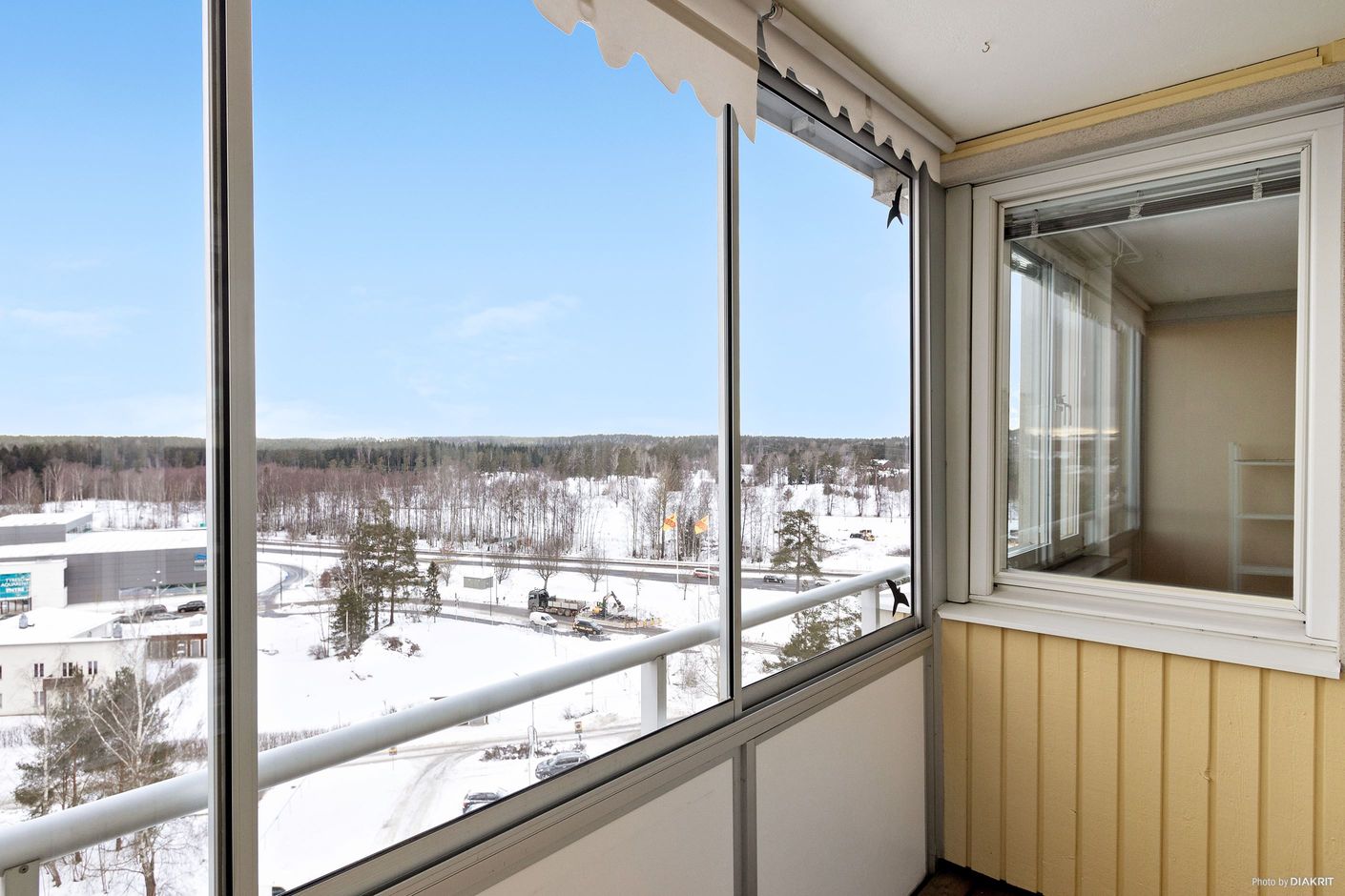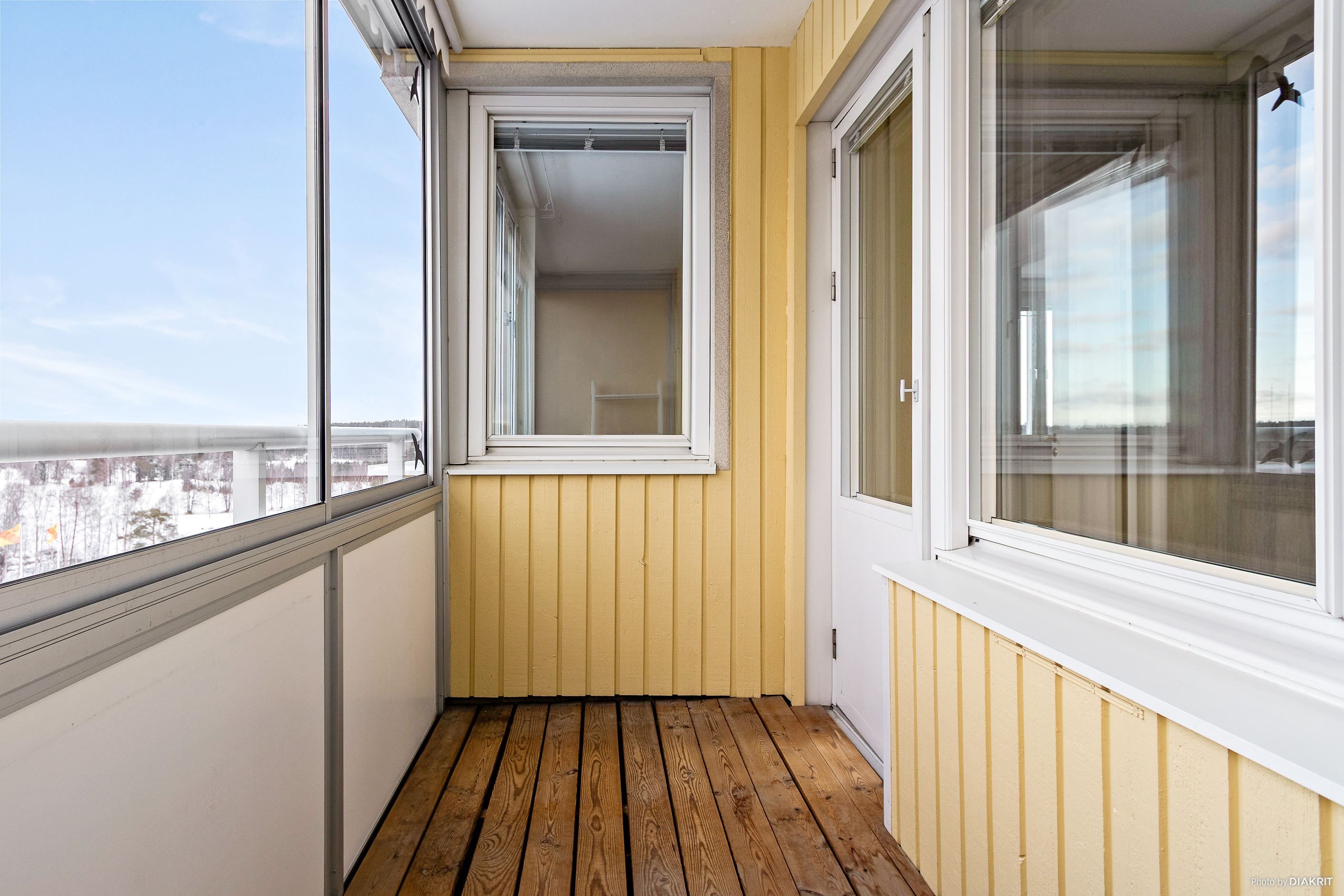 Rymlig inglasad balkong i öppet och insynsfritt söderläge med milsvid utsikt och gott om plats för balkongmöbler.