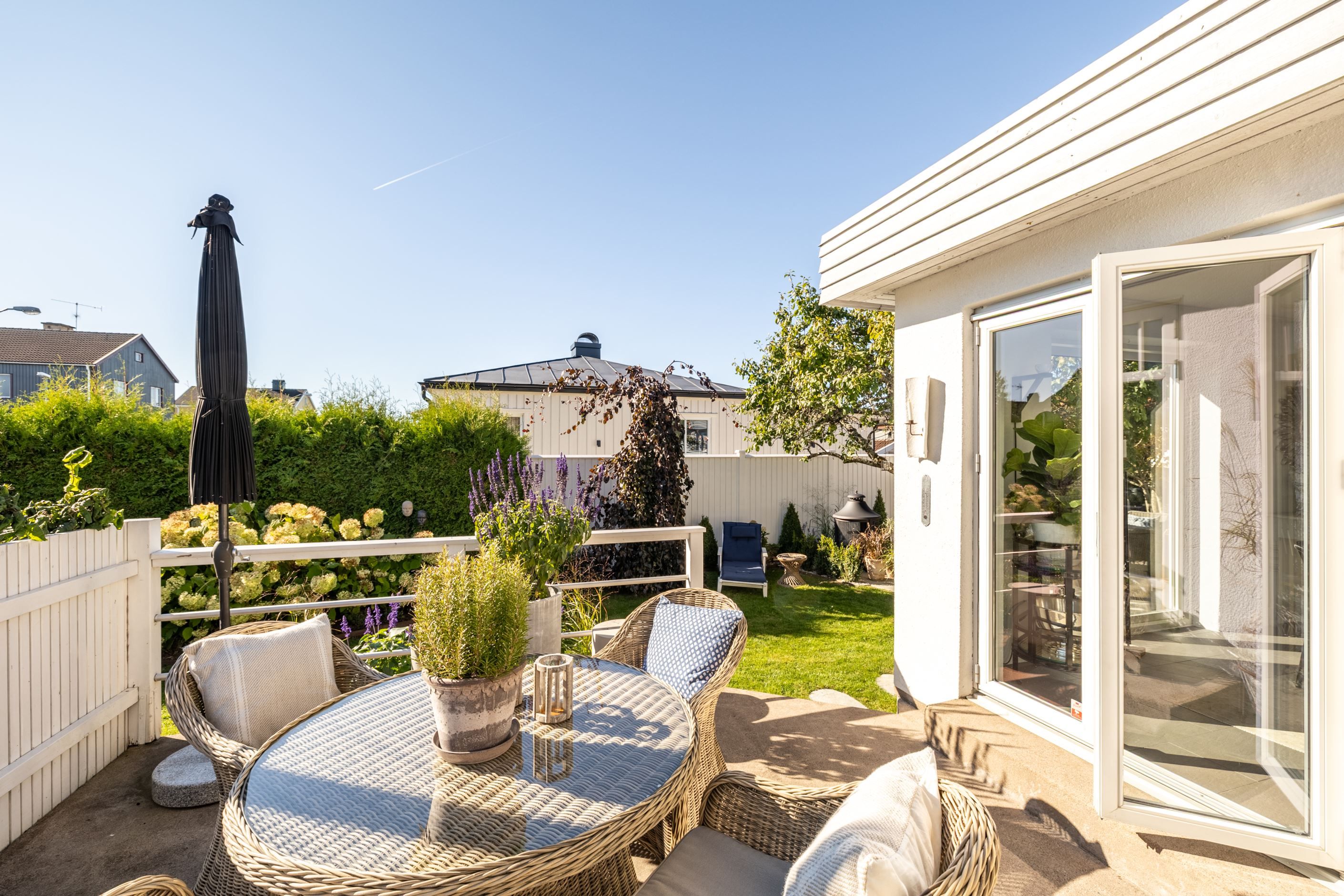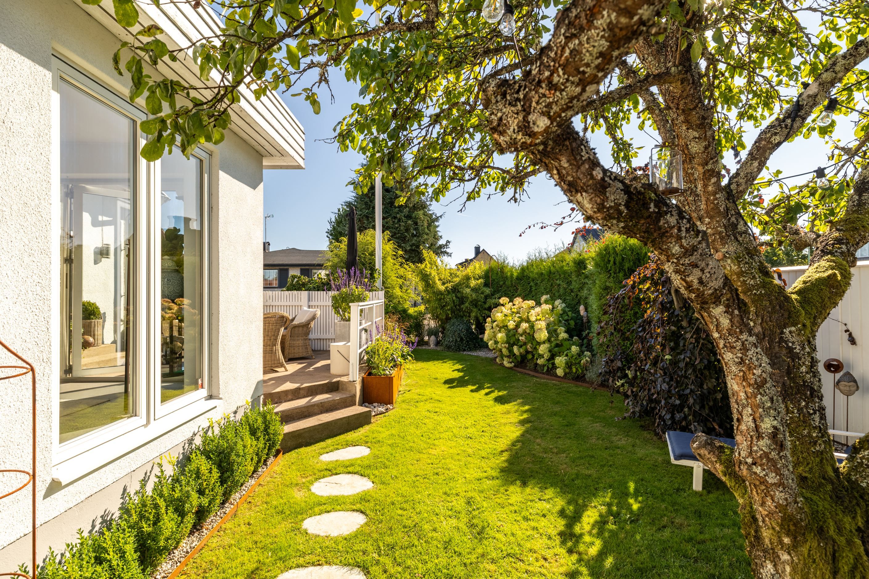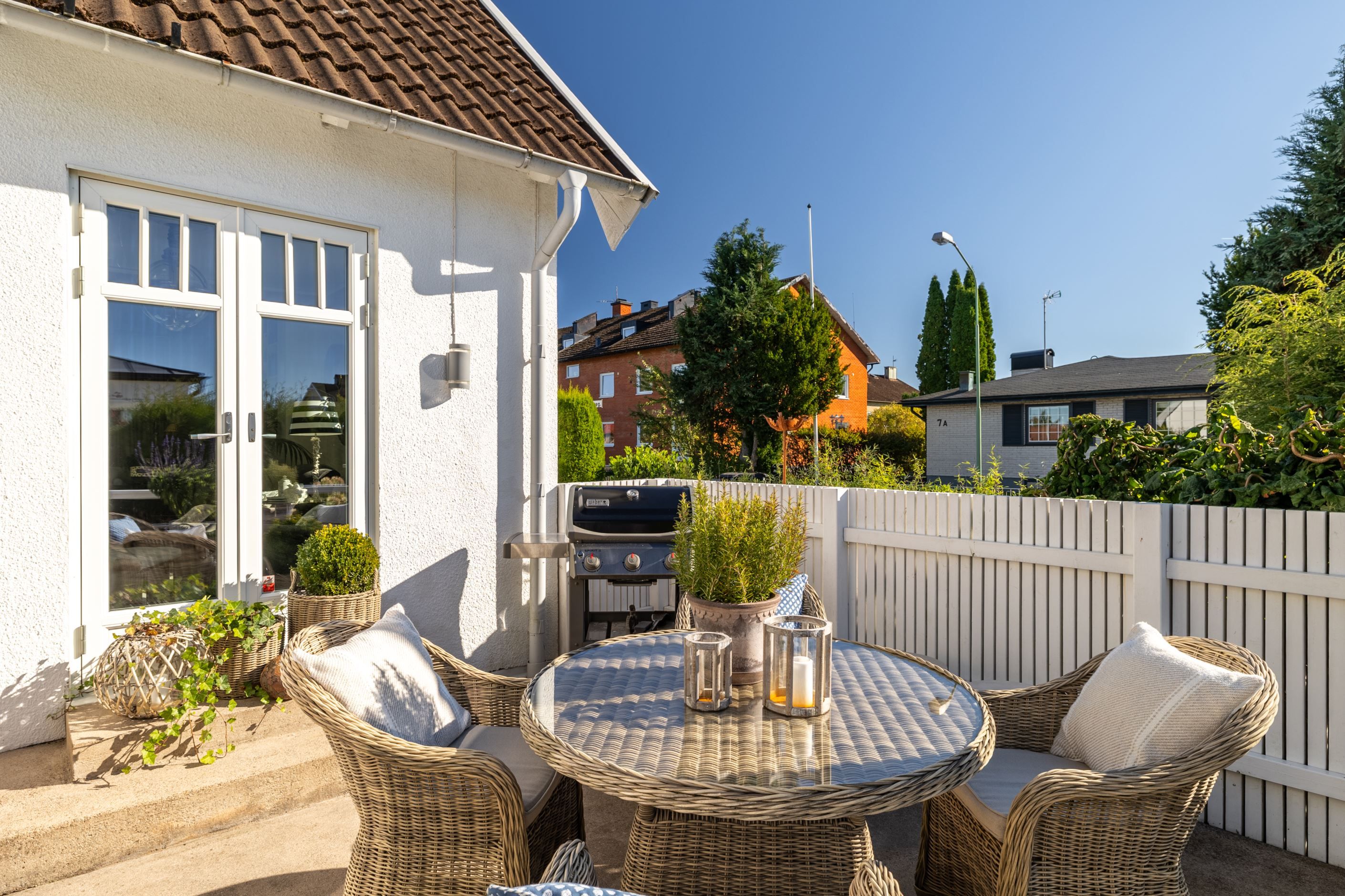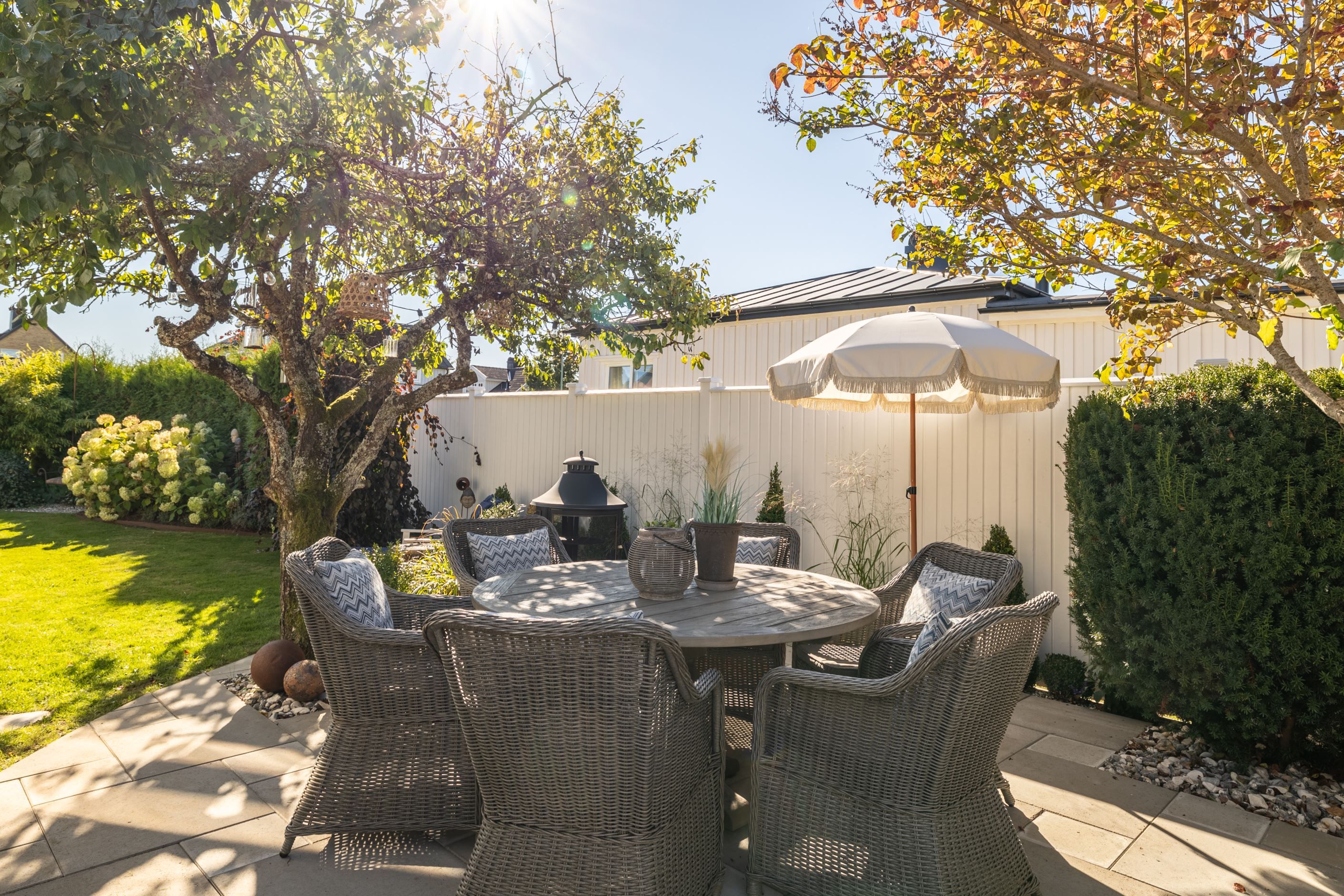 Välkommen till ett hem som verkligen har allt – både insida och utsida. Utvändigt möts du av en lummig och omsorgsfullt planerad trädgård med flera uteplatser där du kan följa solen från morgon till kväll. Här finns plats för både stilla stunder och härliga sammankomster – njut av frukost i morgonsolen eller bjud in till grillkväll med vänner i den grönskande oasen.