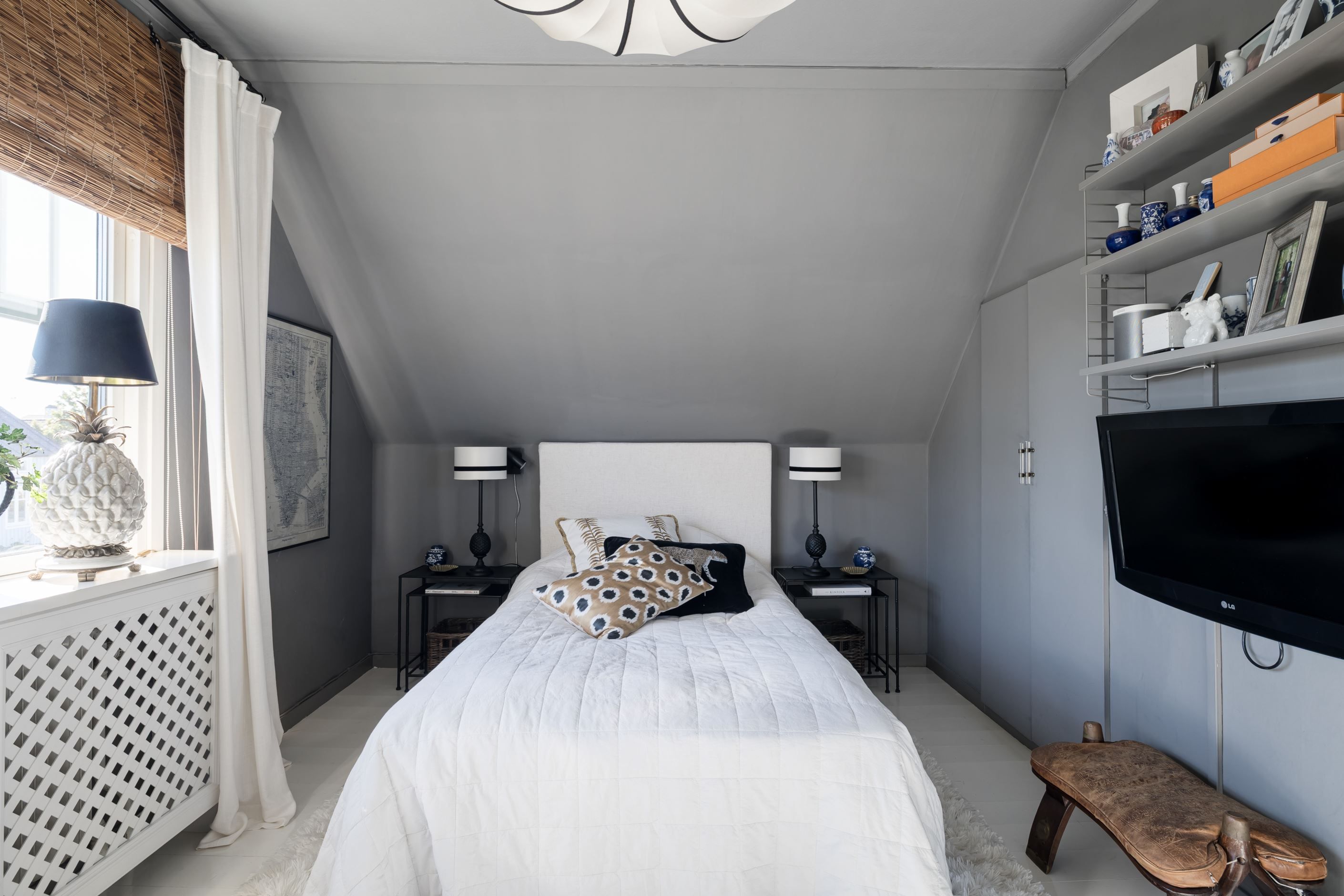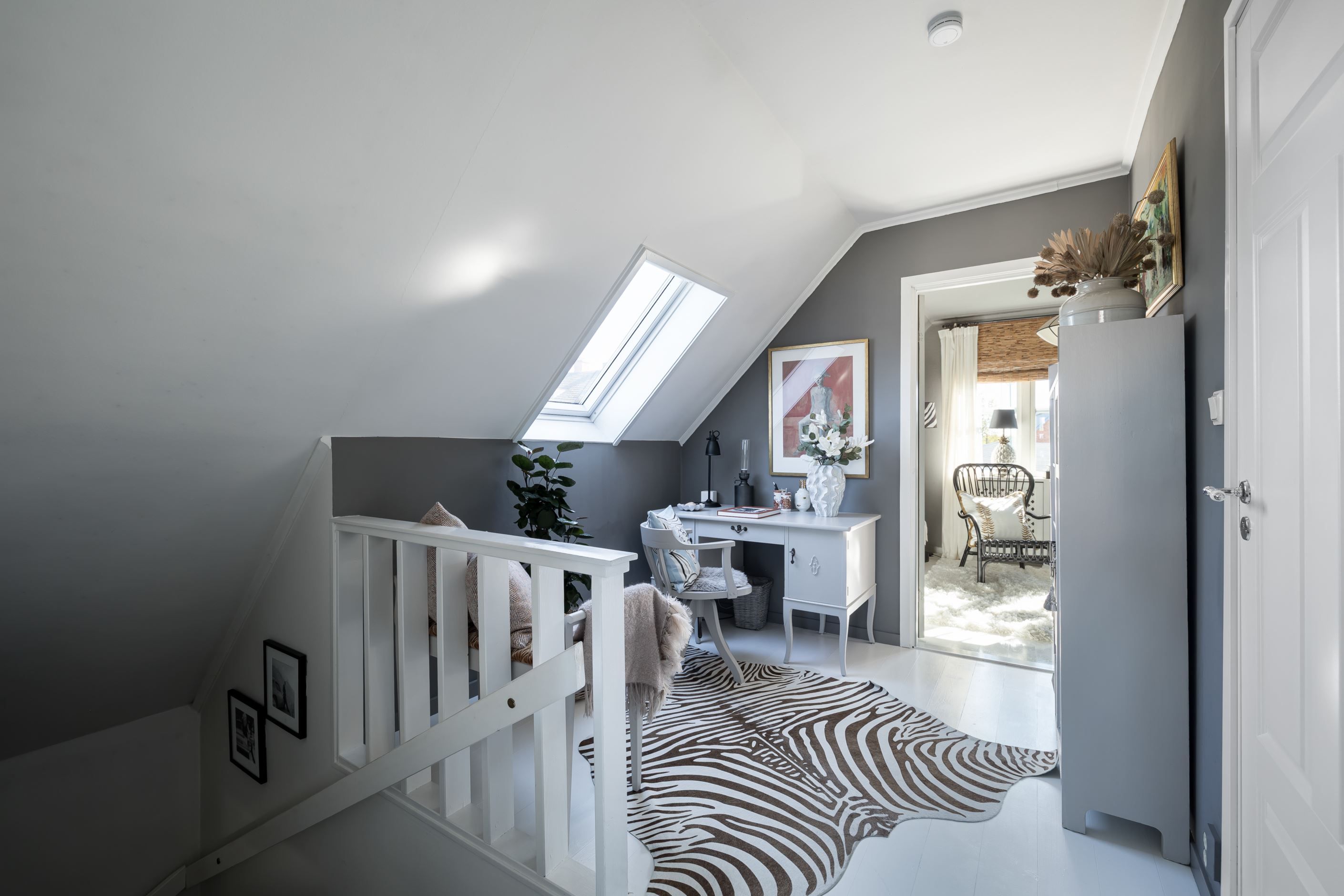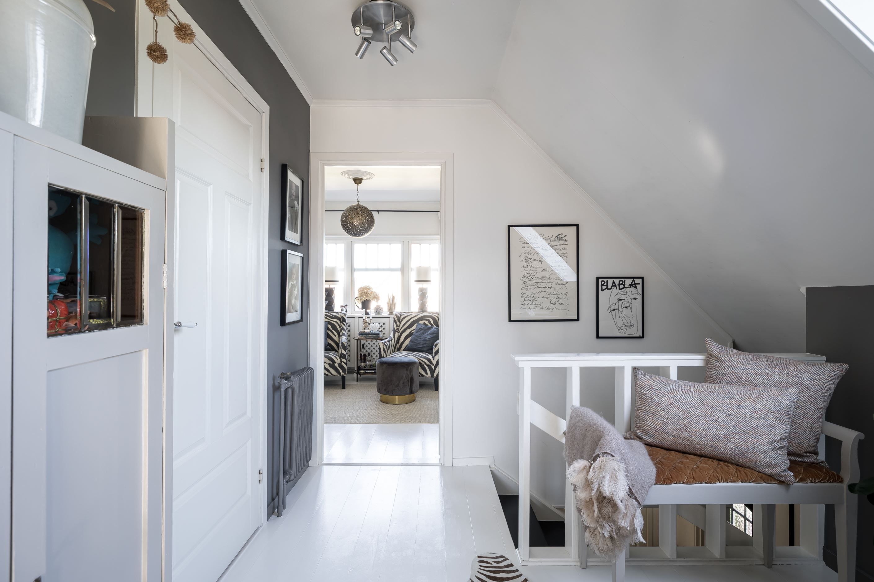 En trappa upp finns två rymliga sovrum samt ett stilfullt badrum med dusch.