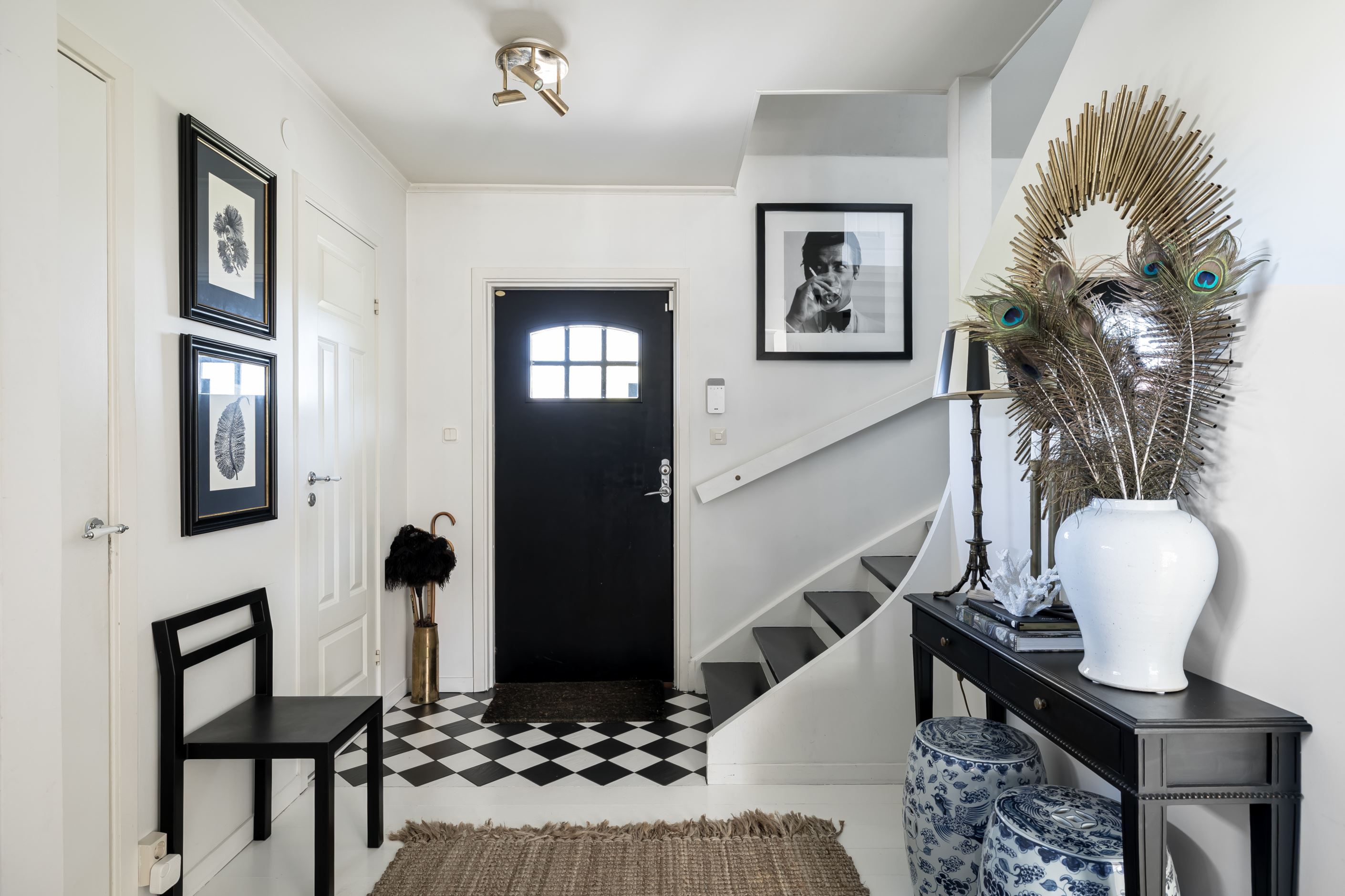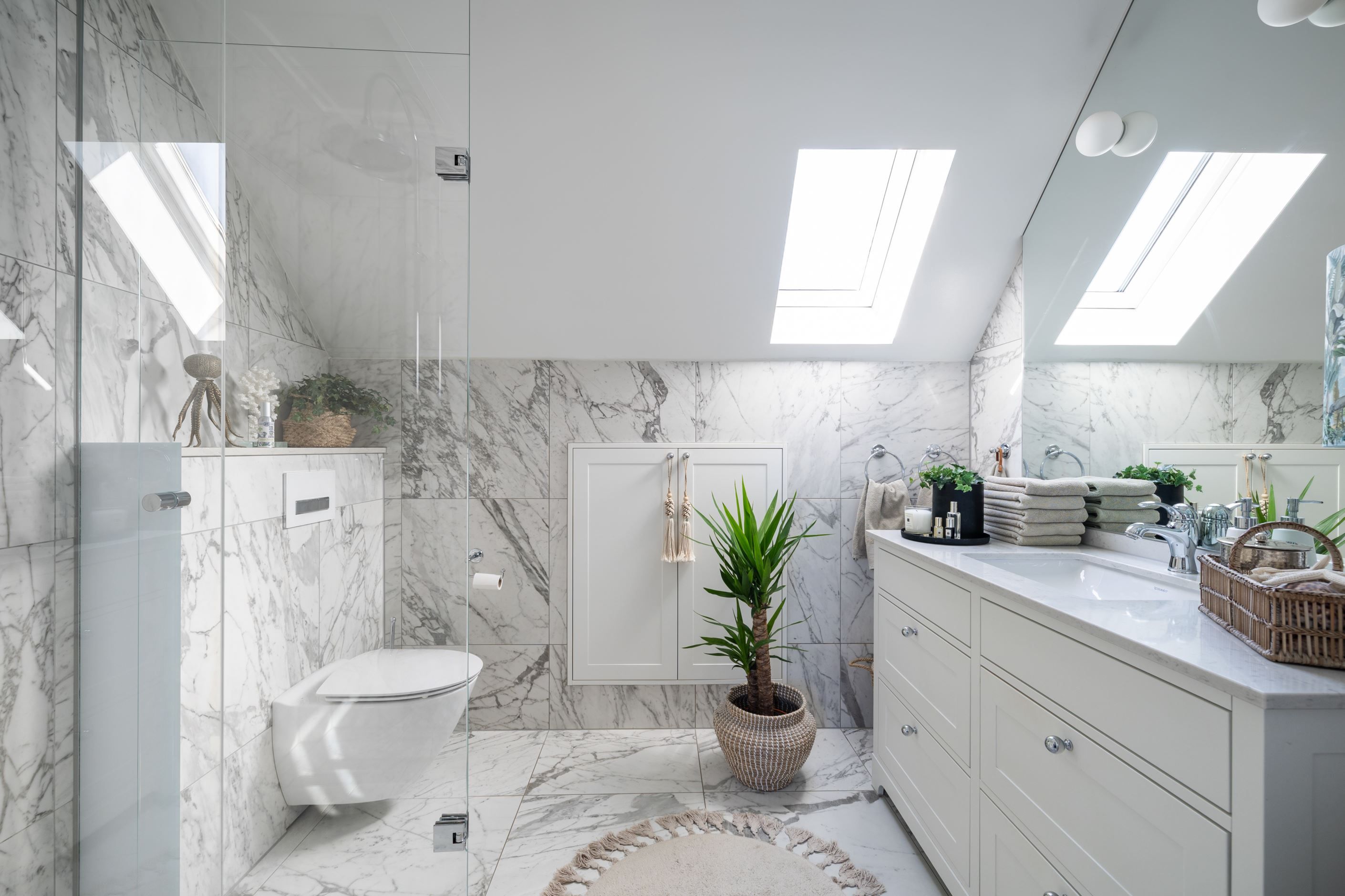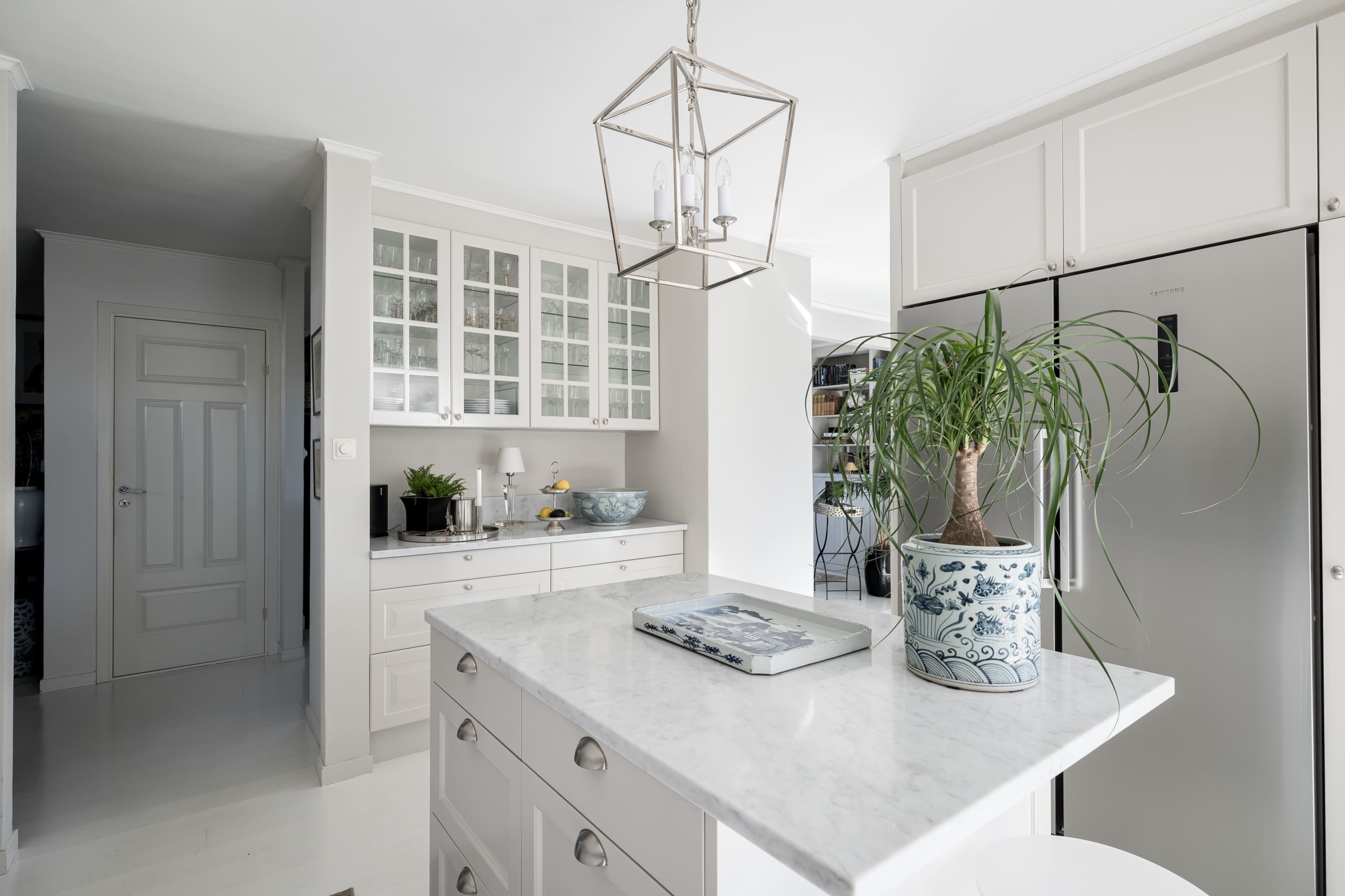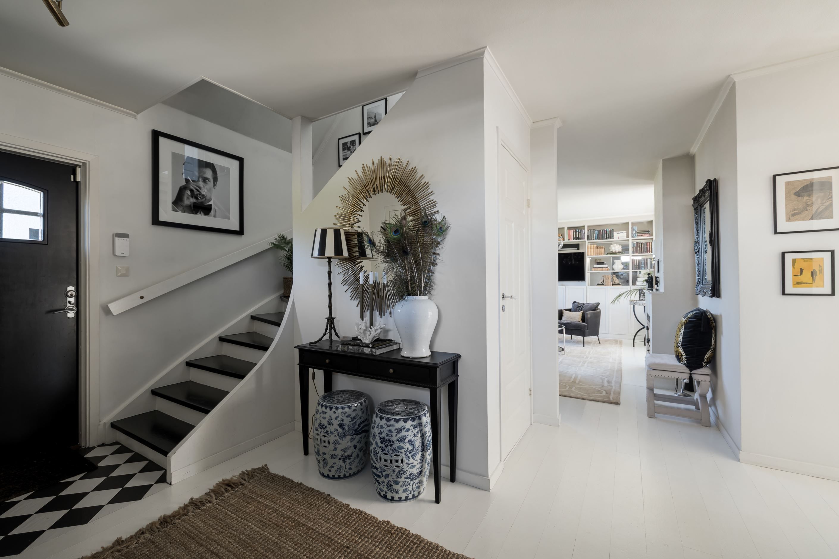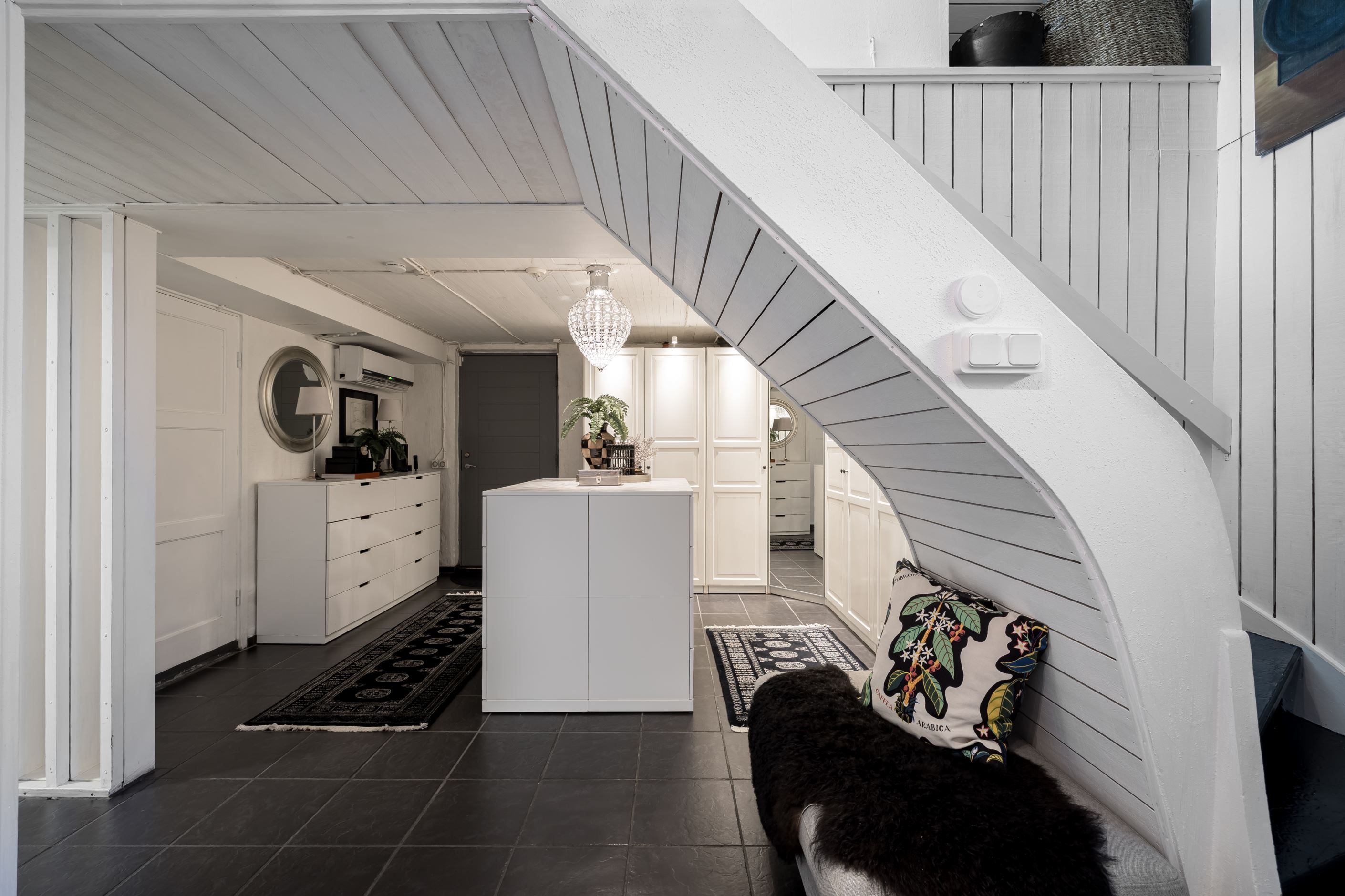 På entréplan välkomnas du av en hall med goda förvaringsmöjligheter. Här finns också ett underbart kök med bänkskivor i exklusiv marmor, en elegant öppning mot vardagsrummet och ett matrum med stora glaspartier som suddar ut gränsen mellan ute och inne. Vardagsrummet har dessutom både en platsbyggd bokhylla och en stämningsfull kamin som skapar värme och karaktär. Från detta plan når du också ett sovrum och en WC.