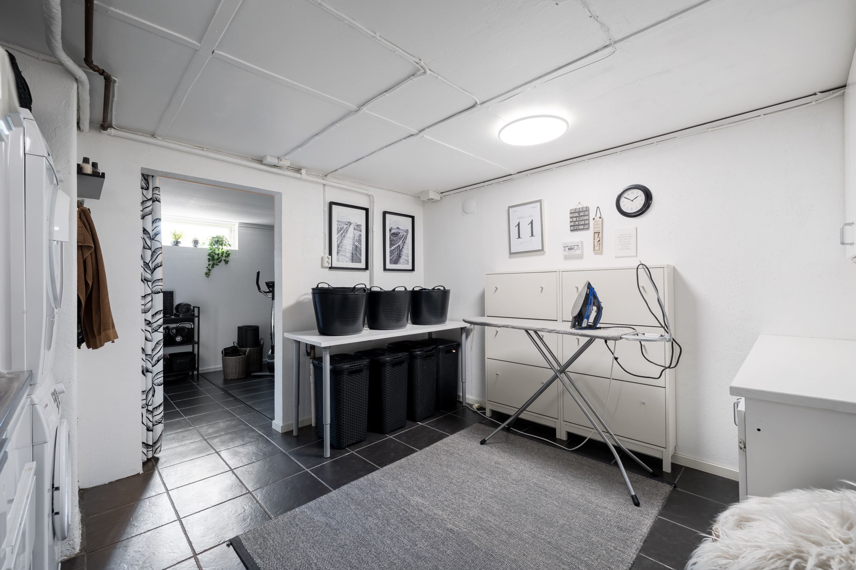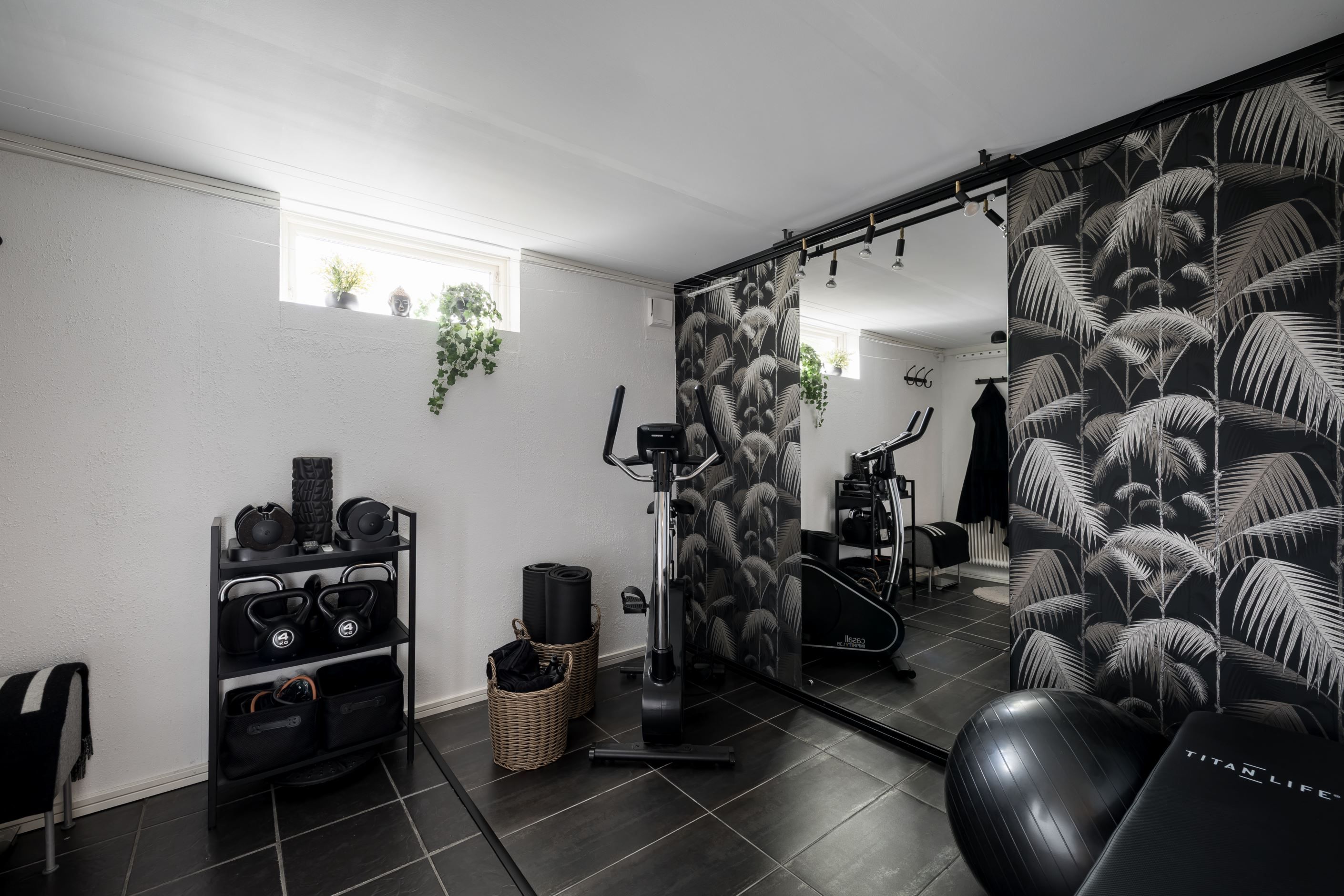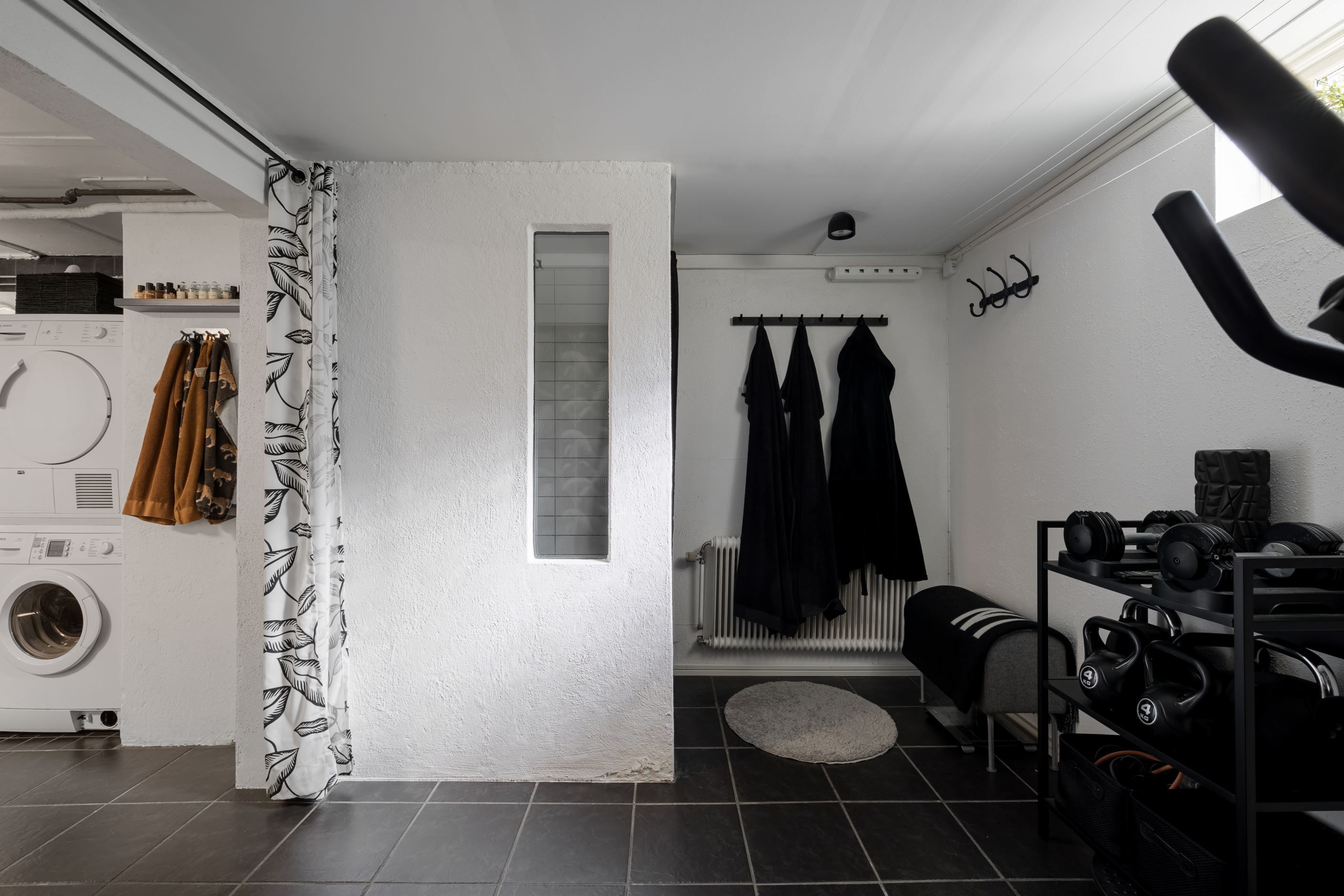 I den inredda källaren väntar ännu mer livskvalitet – ett dressingroom med gott om garderober, ett gästrum, ett gym med egen duschdel samt en tvättstuga. Här finns även förråd och direkt uppgång till garaget.