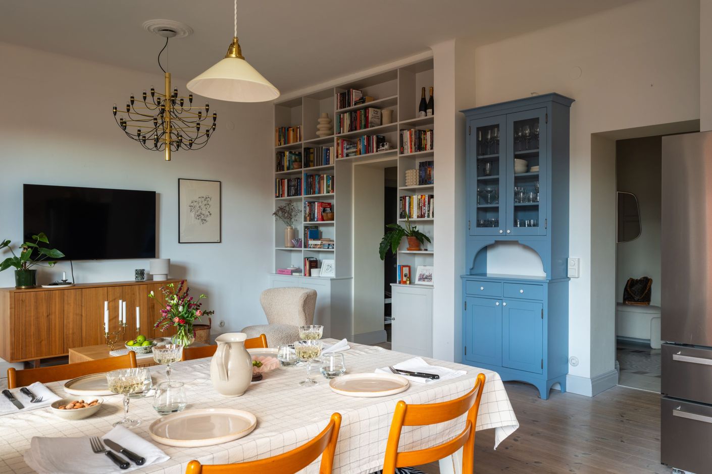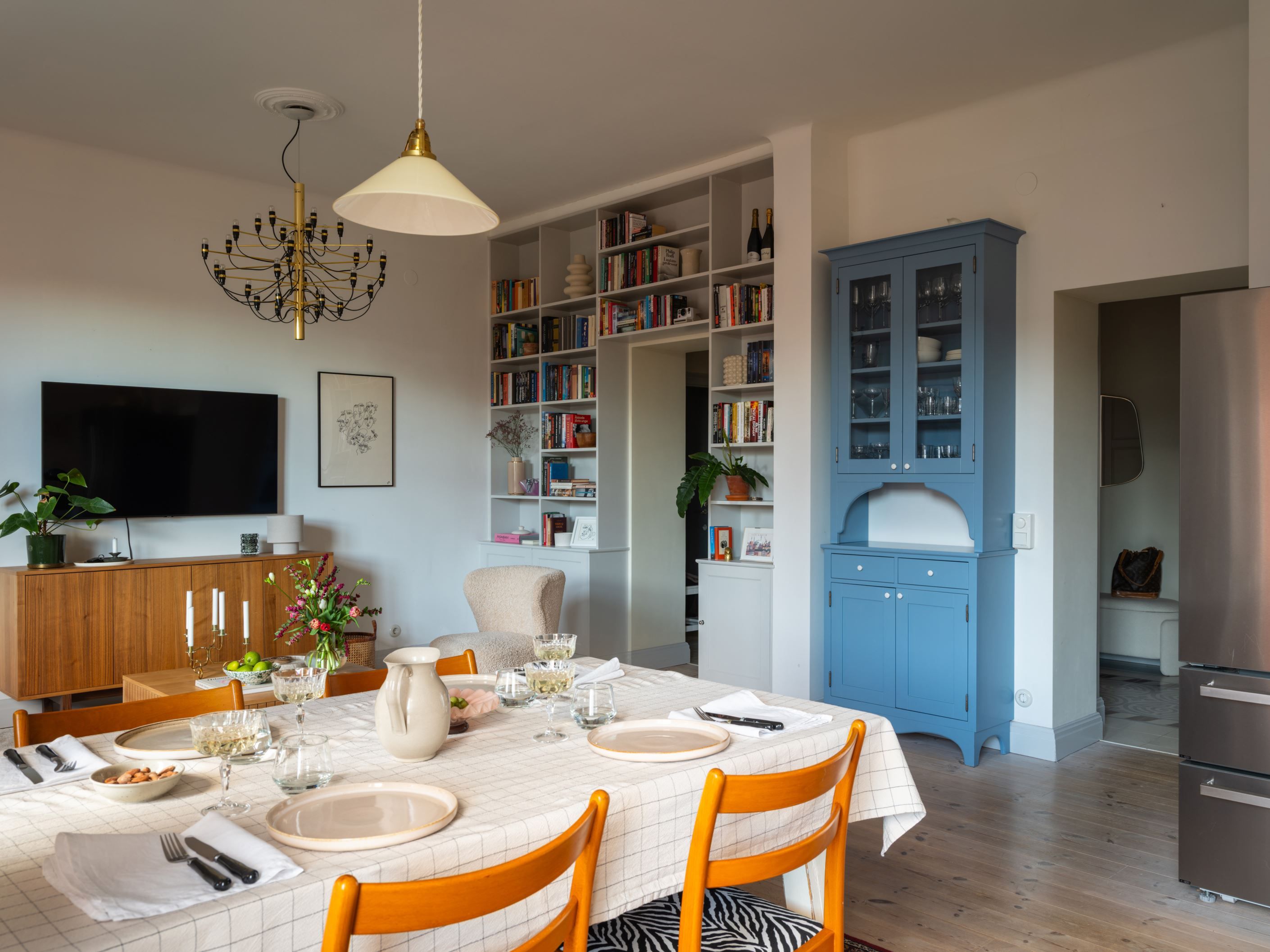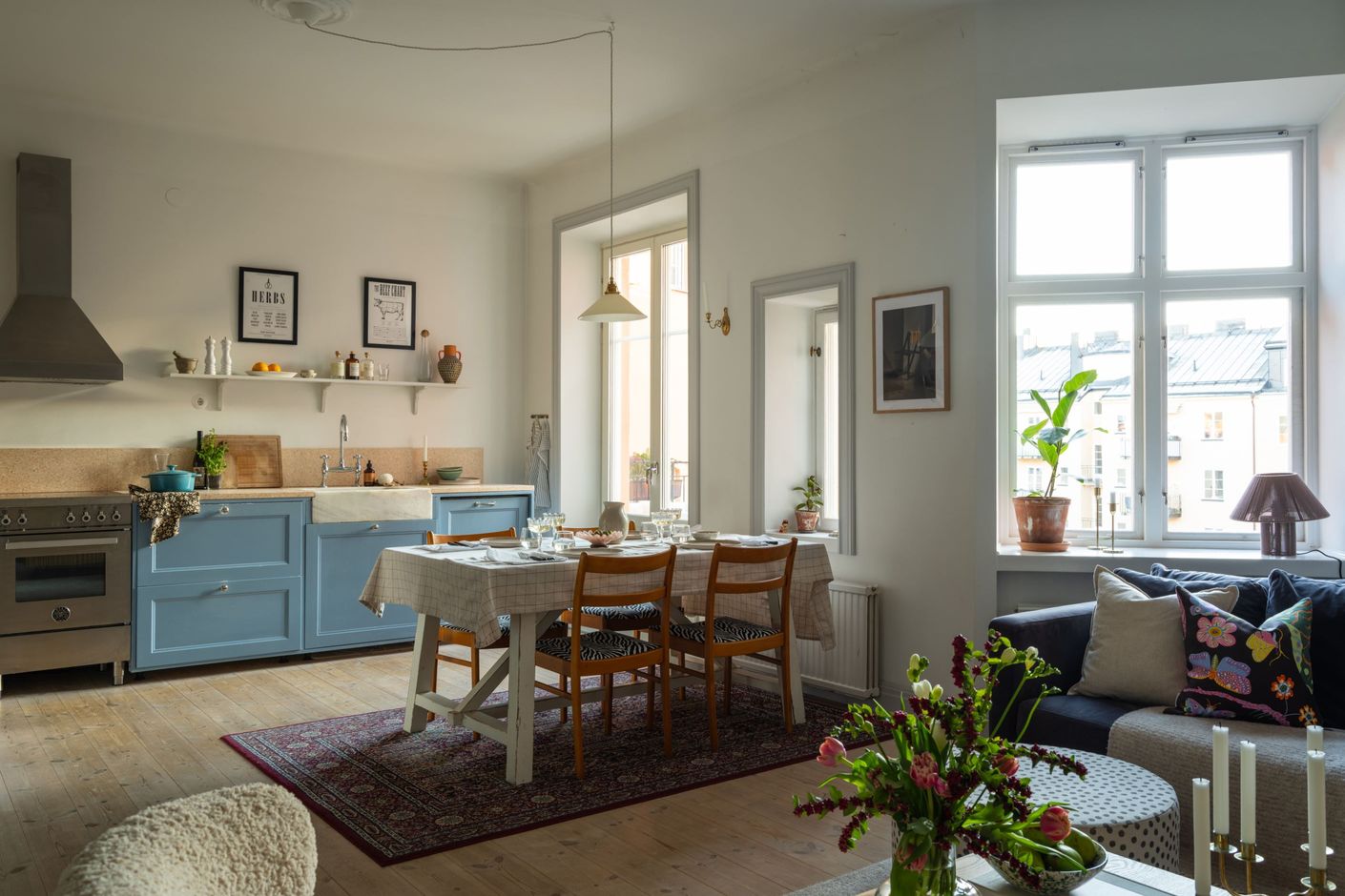 Ett underbart boende på högt läge med utsikt över stadens taklandskap, torn och tinnar samt en balkong som vetter mot den lugna gården. Bostaden är belägen på fjärde våningen i ett ståtligt hus från nationalromantikens tid, fyllt av historia och karaktär. Planlösningen är väl genomtänkt – kök och vardagsrum ligger i öppen anslutning åt ena hållet, medan de två sovrummen placerats åt det andra, separerade av en rymlig hall som skapar både lugn och avskildhet.