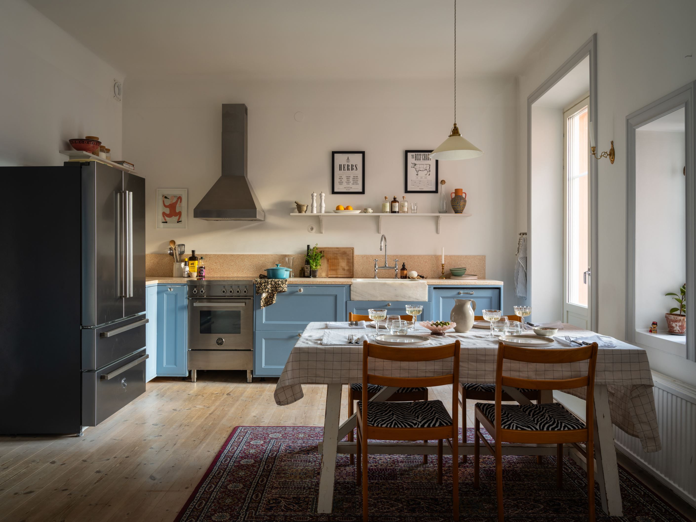 Ljuset flödar in genom vackra fönster med unika detaljer som framhäver husets charm. Hela lägenheten har nyligen renoverats med ny köks- och badrumsinredning, och väggarna pryds av harmoniska färger målade med miljövänlig färg. Materialvalen är omsorgsfullt gjorda för att bevara och lyfta fram byggnadens ursprungliga själ.