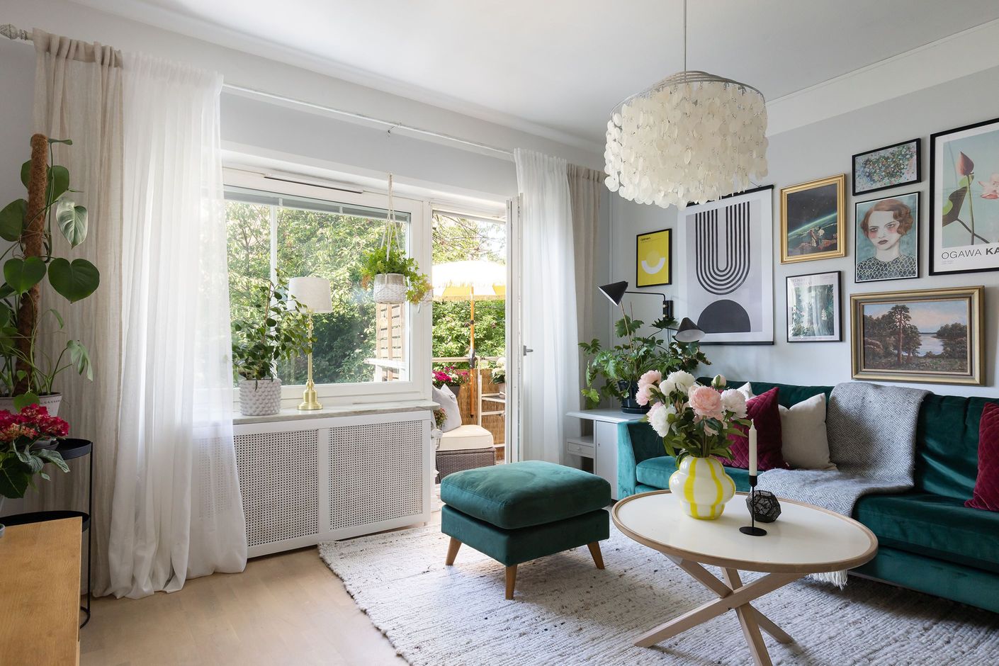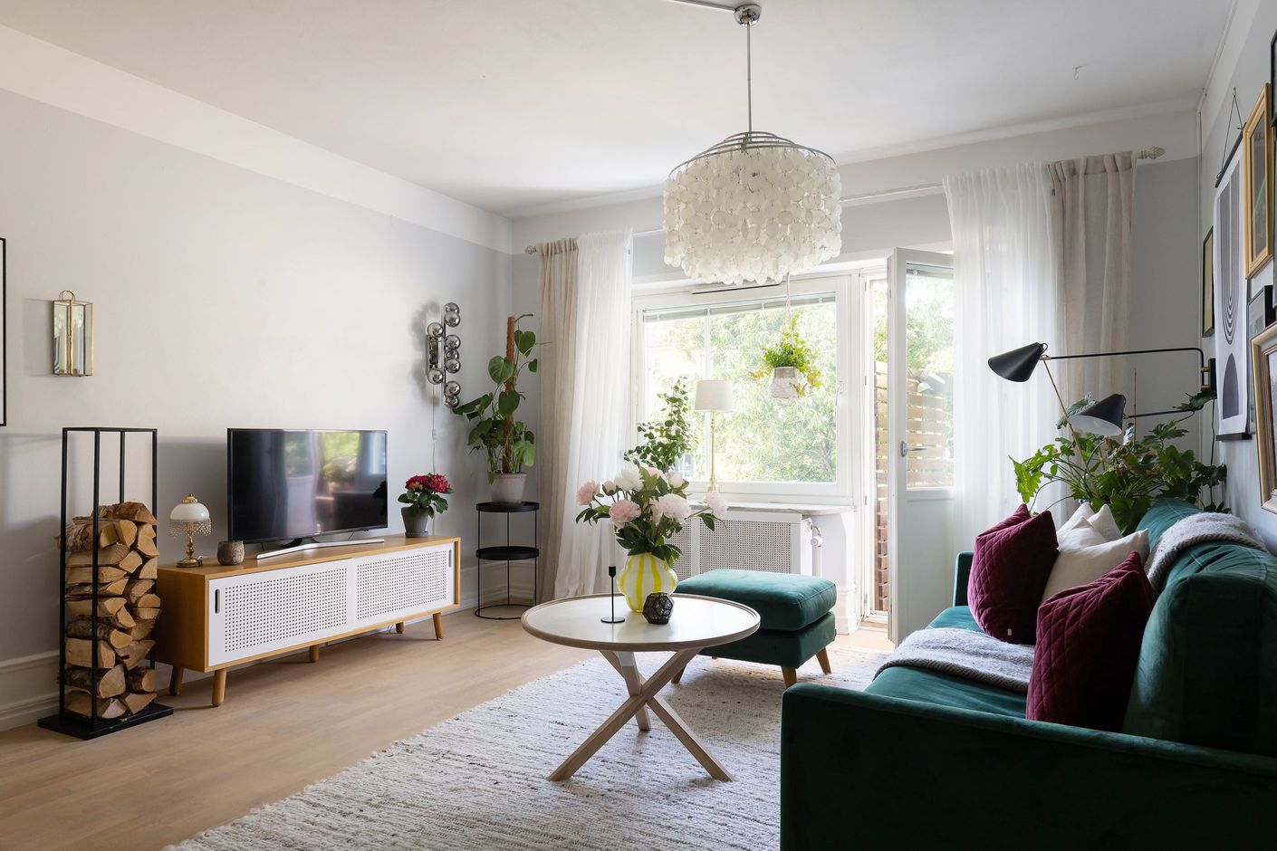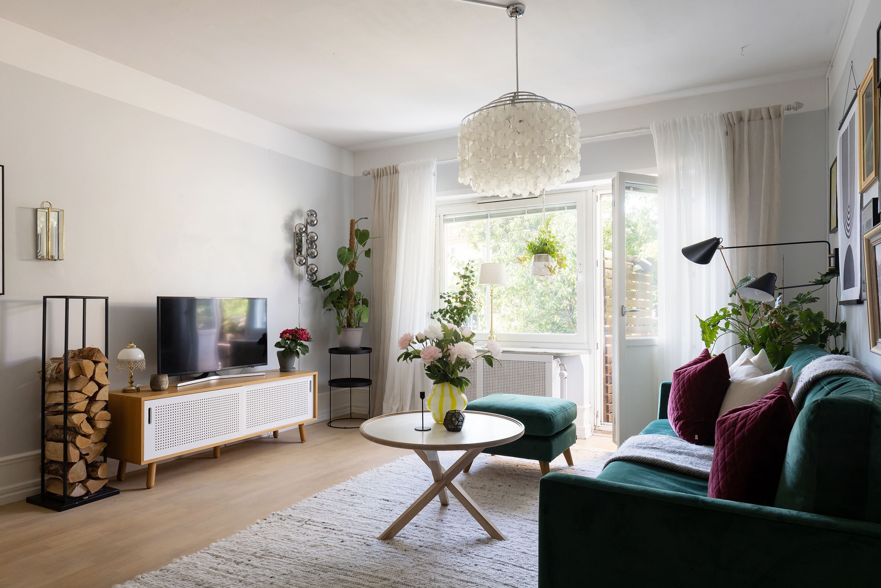 Vardagsrummet är rymligt och bjuder in till möblering med soffa, fåtölj och soffbord samt media-möbel men här finns även yta för matplats eller ytterligare möblemang allt efter egen smak och behov. I vardagsrummet finner man en murad öppen spis som både blir en trivsam inredningsdetalj och skänker mysig värme under årets kallare månader. Ett stort fönster och glasinfattad balkongdörr låter rikligt med naturligt ljus flöda fritt genom rummet. Vardagsrummet är även berikat med fina detaljer som trägolv, höga golvsocklar och vackra fönsterbänkar som berikar rummets attribut. Från vardagsrummet når man den möblerbara balkongen i sydväst med sol hela dagen och mot lummig grönska. Balkongen blir en naturlig förlängning av vardagsrummet under årets lite varmare månader.