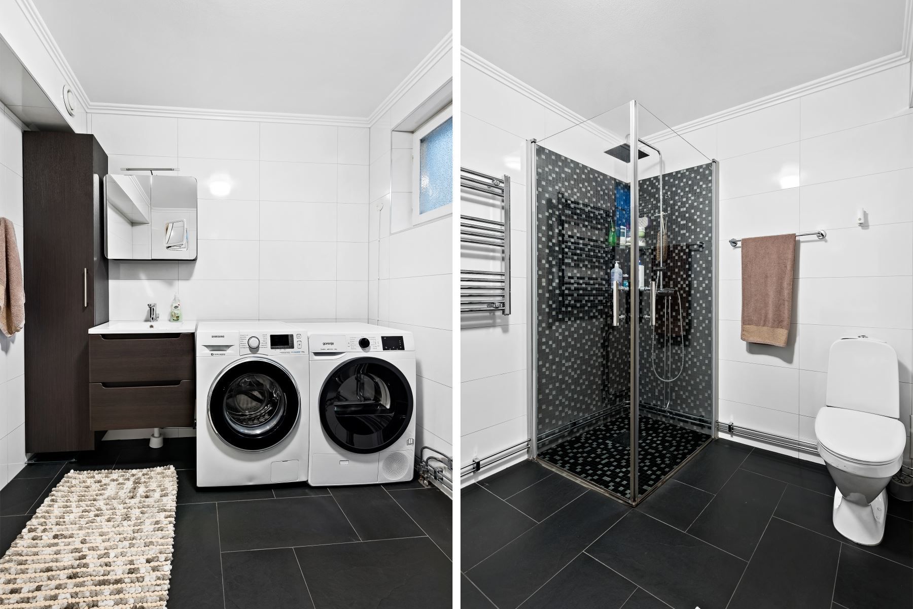 - Gigantiskt helkaklat badrum med vädringsfönster, dusch, duschväggar, toalett, spegelskåp, handfat, kommod, torktumlare och tvättmaskin.