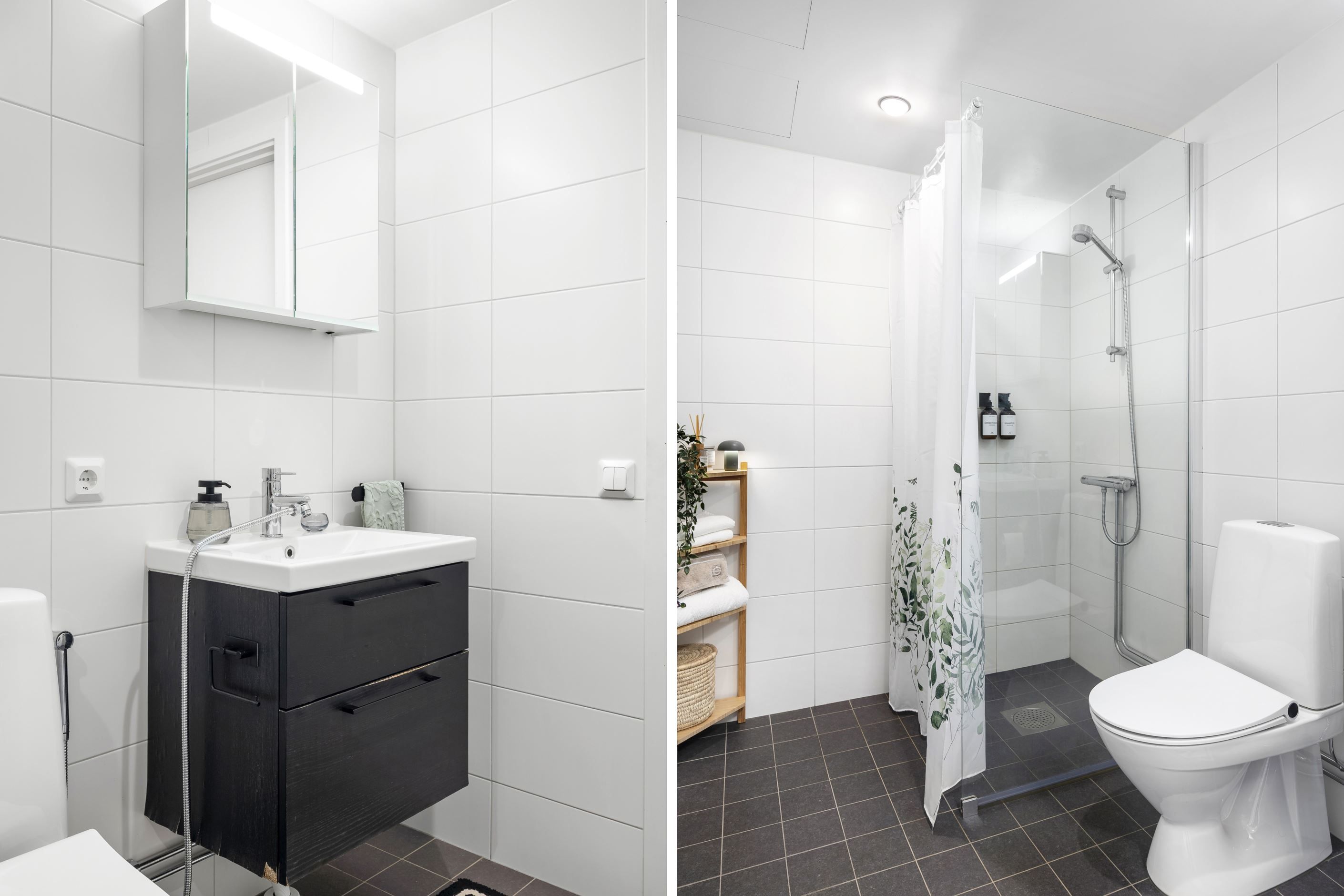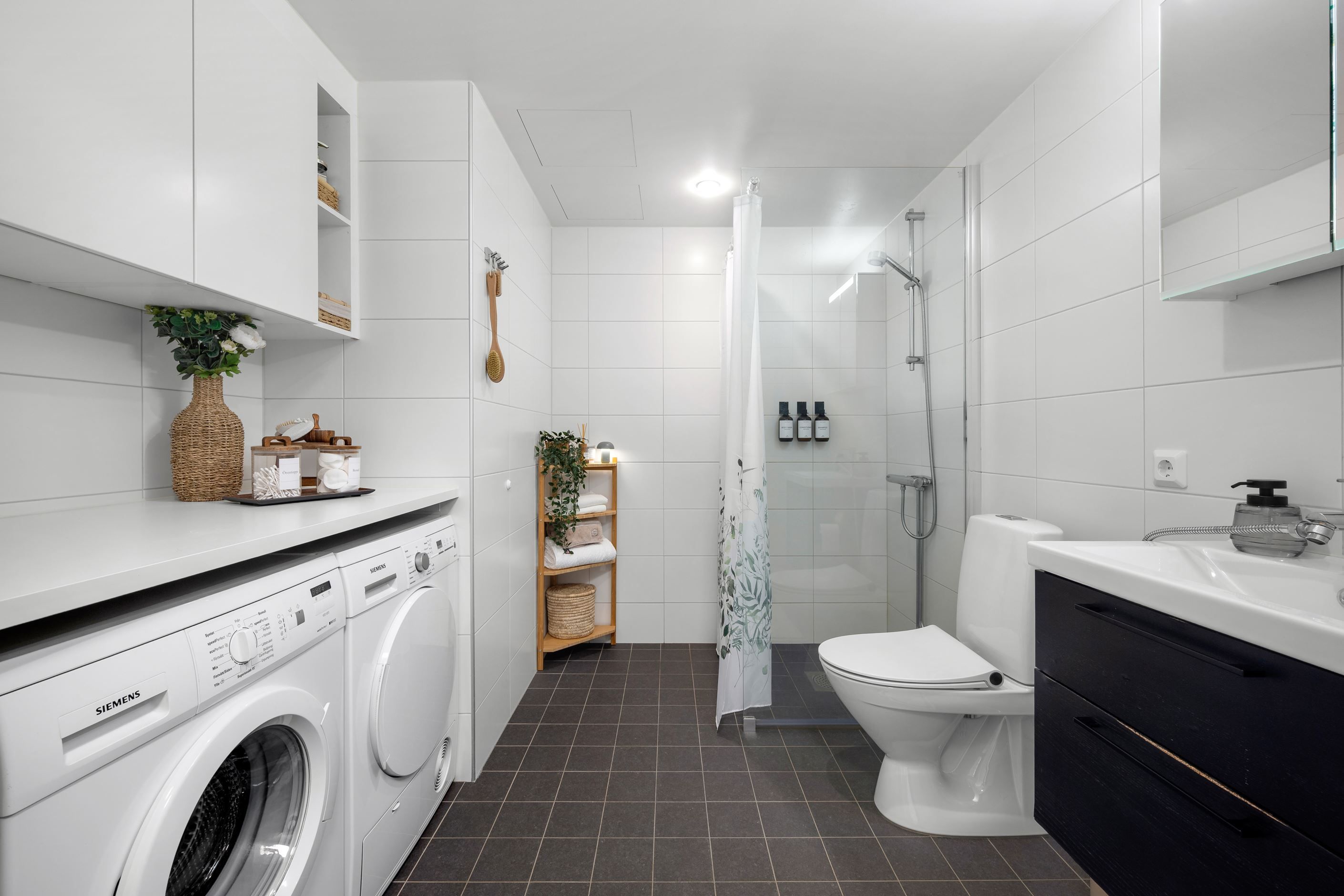 Badrummet är rymligt och fräscht, utrustat med både tvättmaskin och torktumlare från Siemens. Hallen är välkomnande med goda förvaringsmöjligheter. Sovrummet är rofyllt med plats för större säng och praktisk förvaring bakom skjutdörrar.