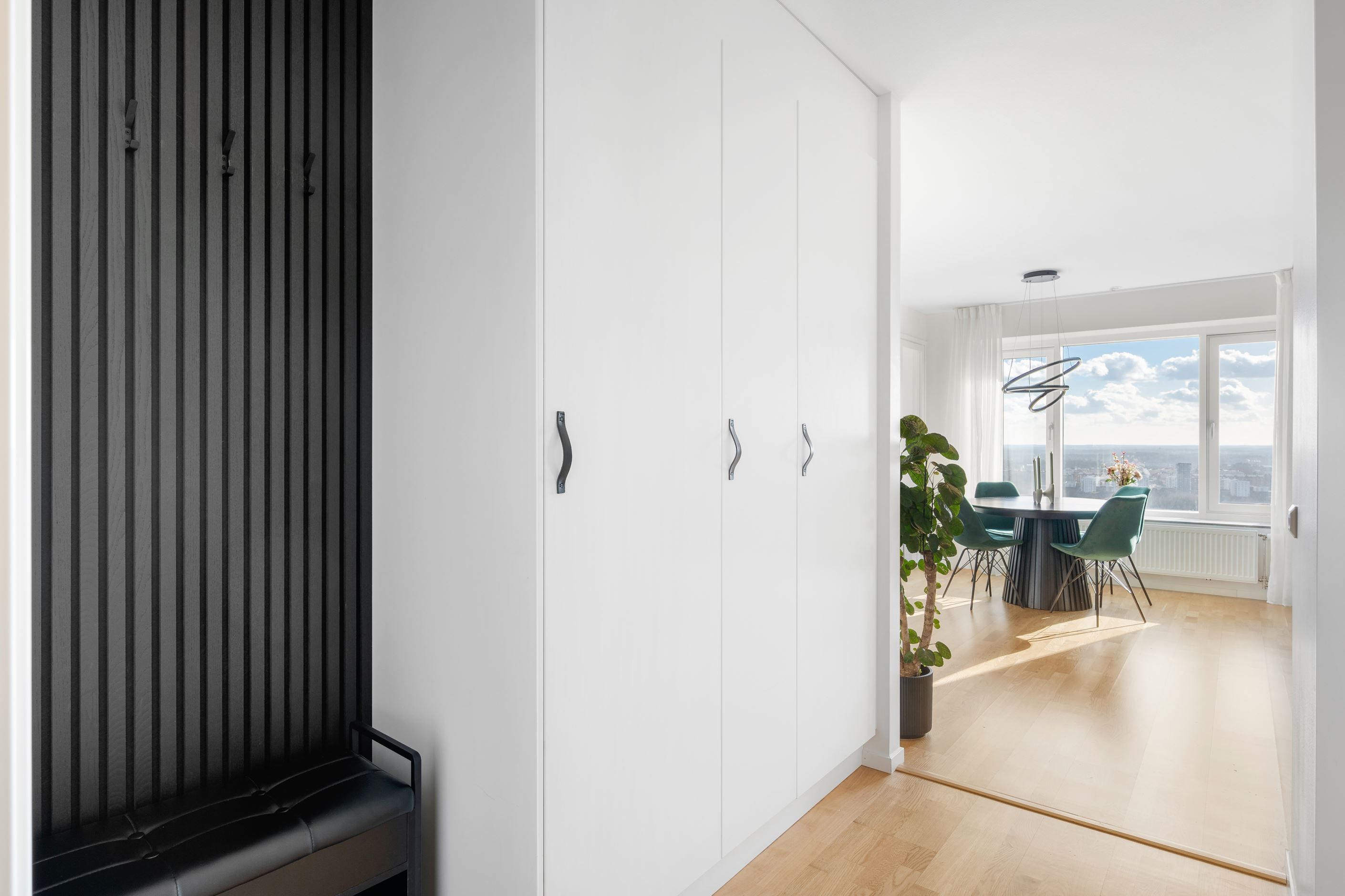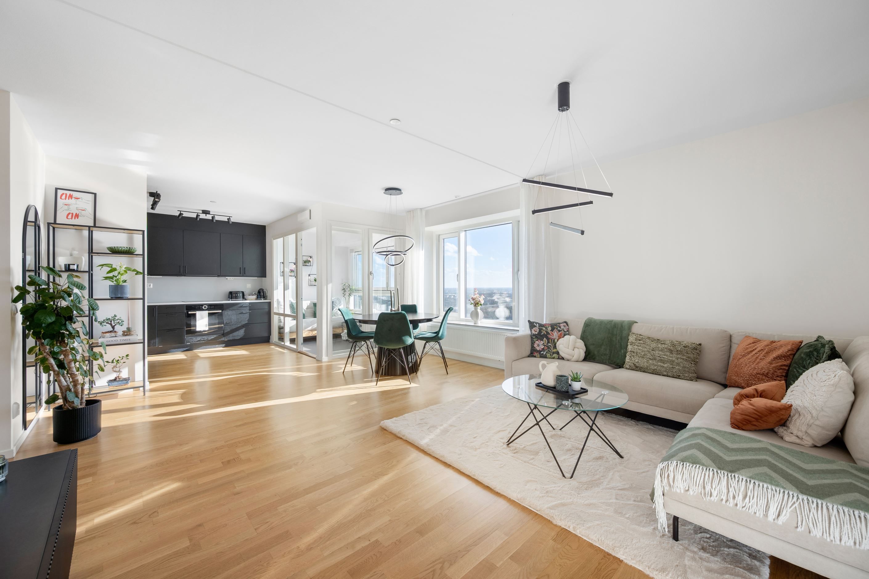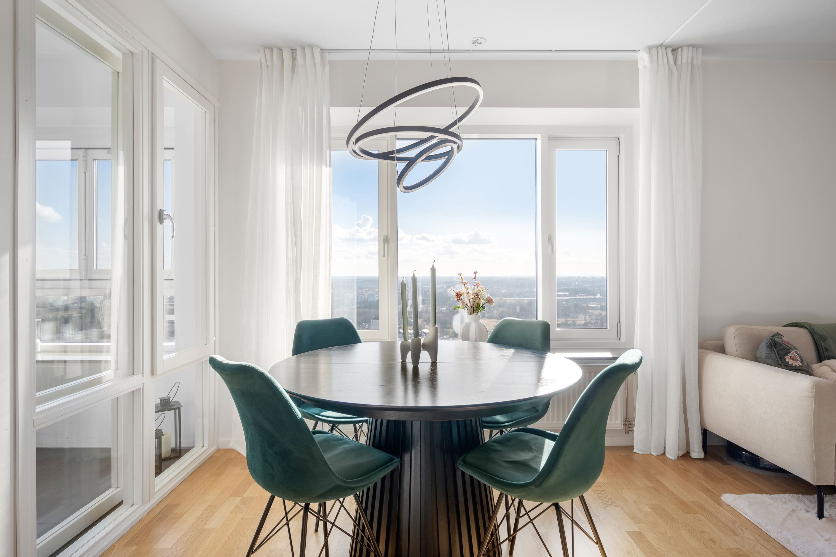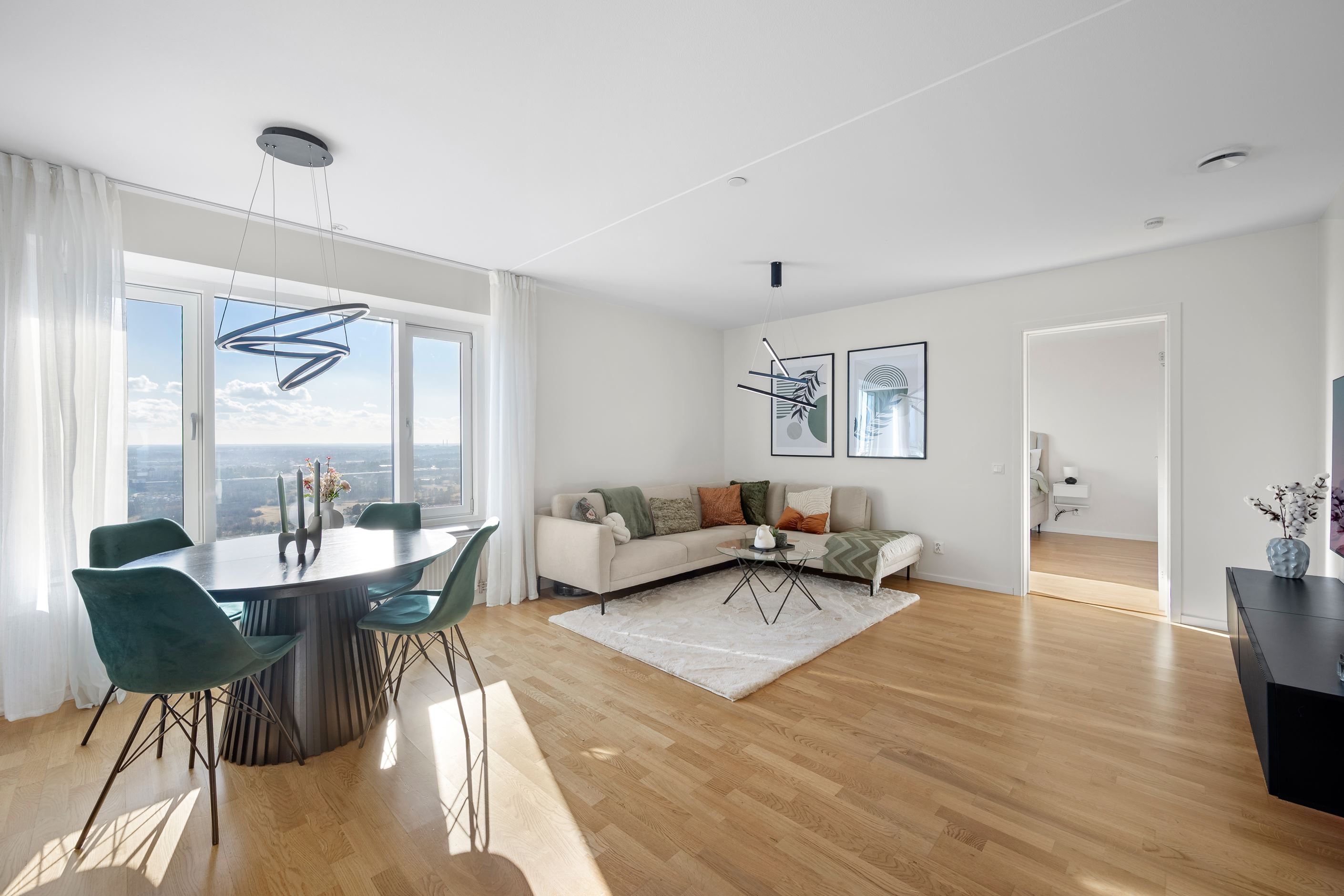 Här bor du högt upp på våning 32 i eftertraktat söderläge med en fantastisk utsikt över Stockholm och ett generöst ljusinsläpp året om. Bostaden är ljus och modern med social planlösning och genomtänkta materialval. Stora fönsterpartier förstärker känslan av rymd och tillsammans med parkettgolv skapas en stilren och trivsam helhet.