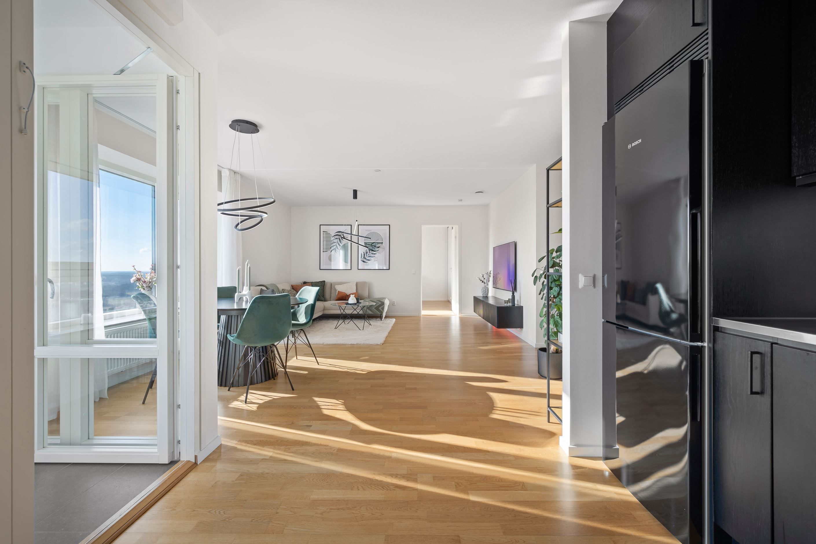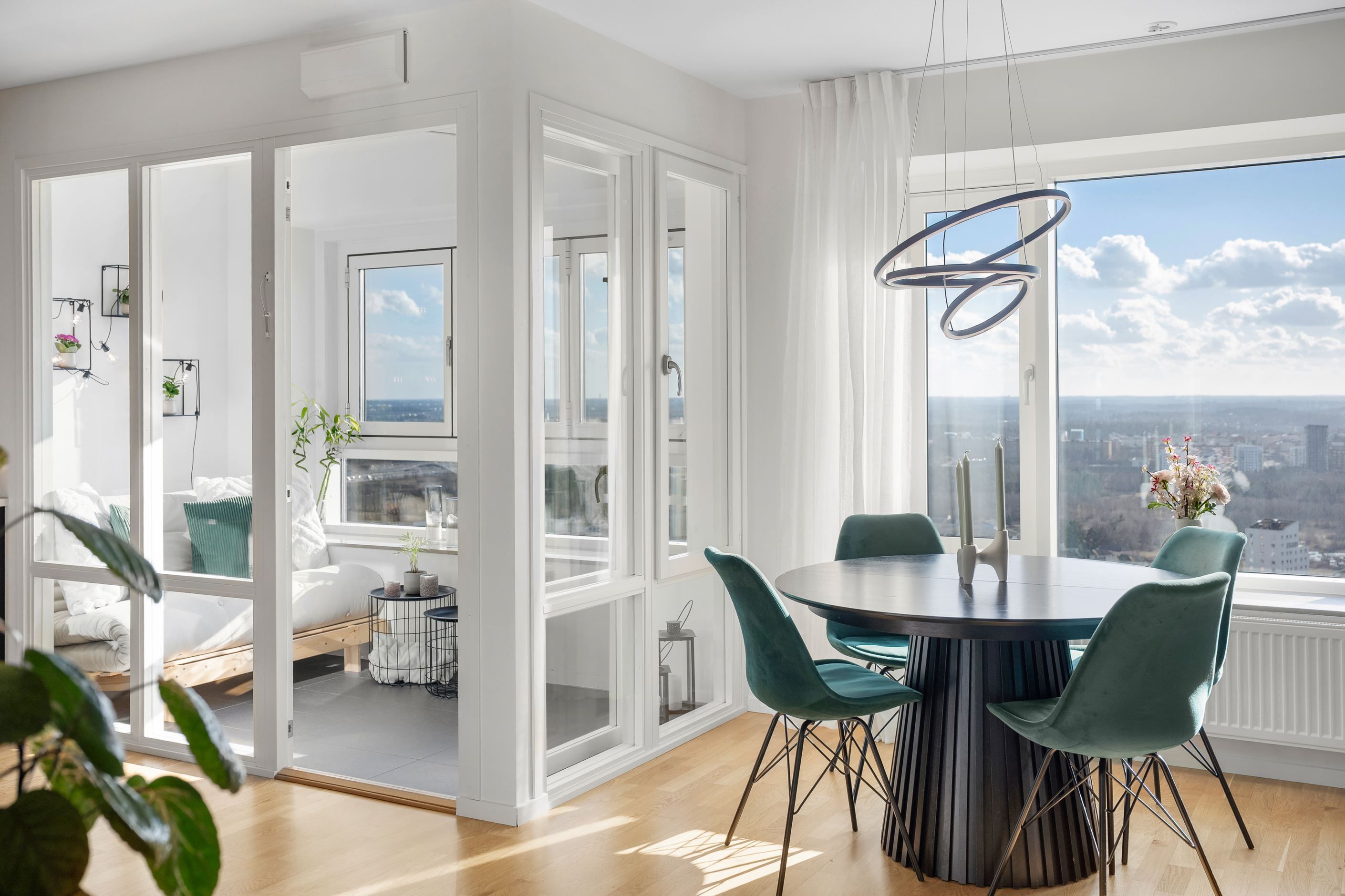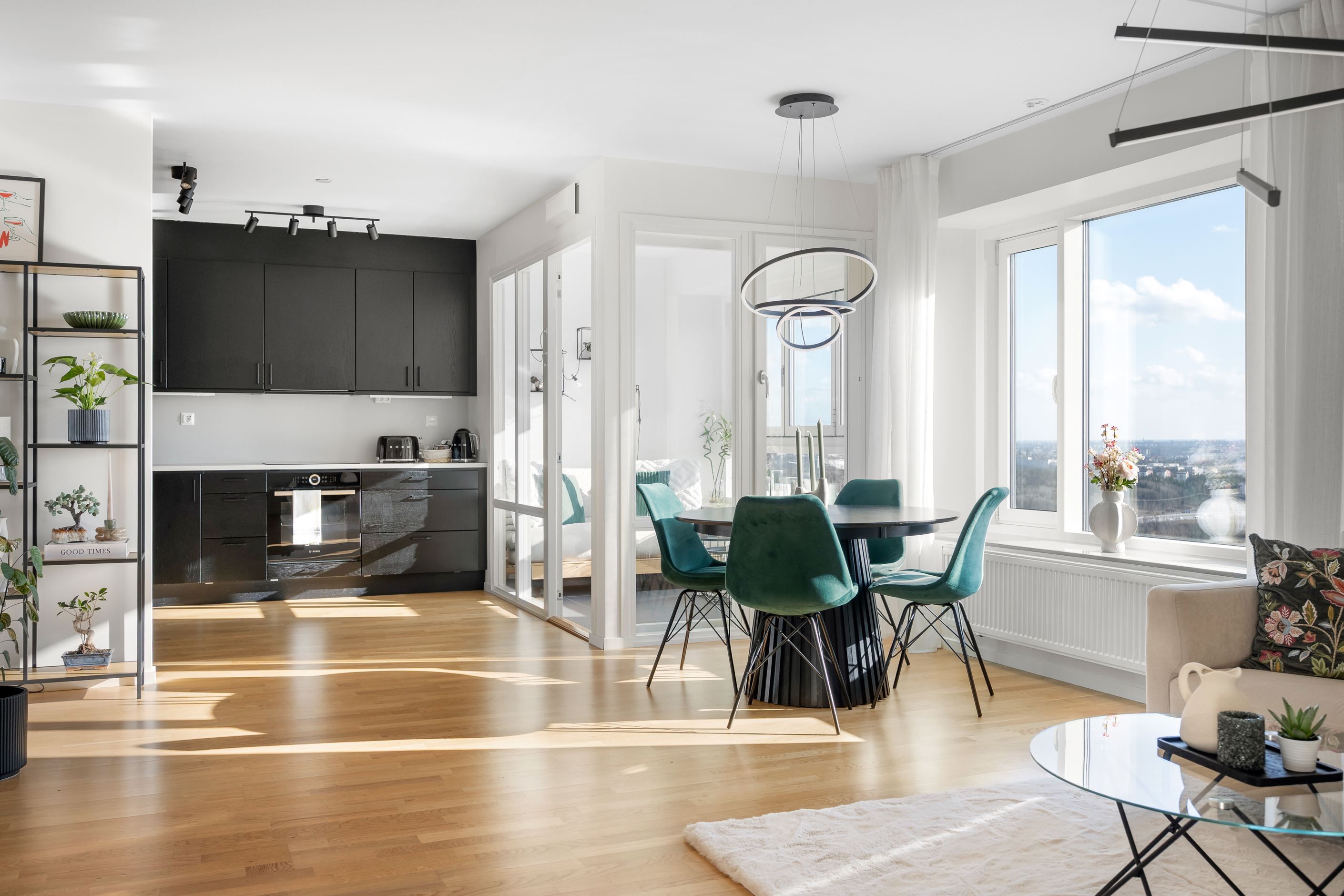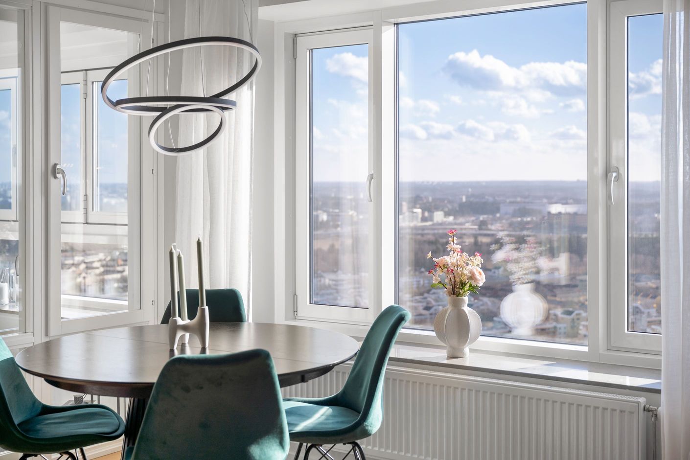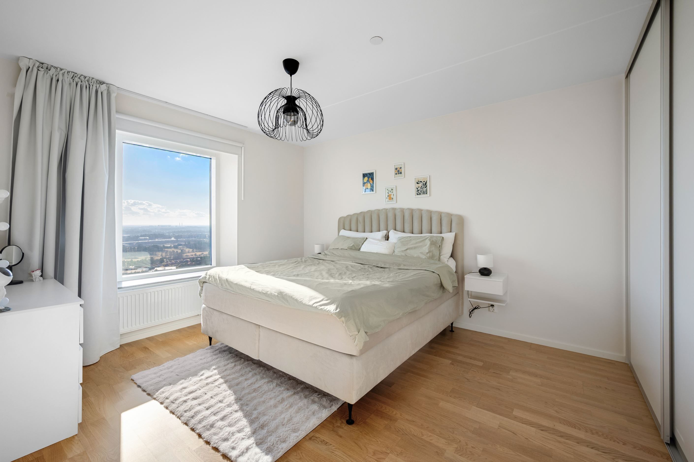 Här bor du högt upp på våning 32 i eftertraktat söderläge med en fantastisk utsikt över Stockholm och ett generöst ljusinsläpp året om. Bostaden är ljus och modern med social planlösning och genomtänkta materialval. Stora fönsterpartier förstärker känslan av rymd och tillsammans med parkettgolv skapas en stilren och trivsam helhet.