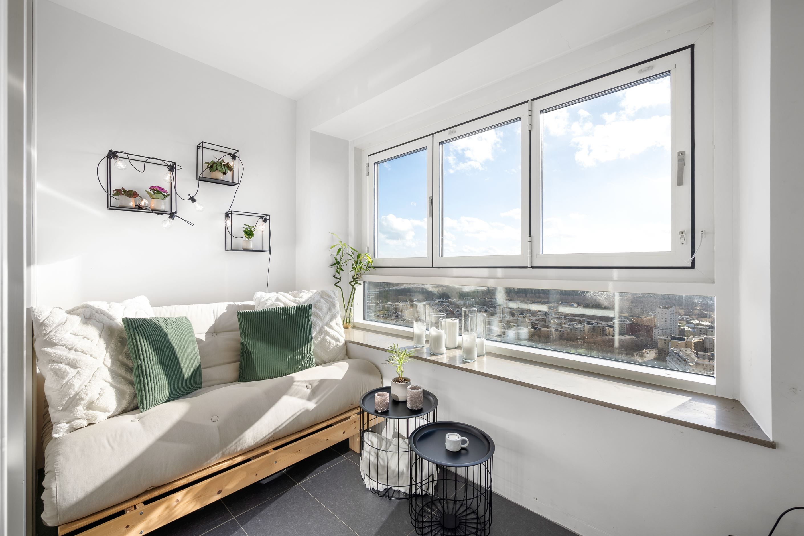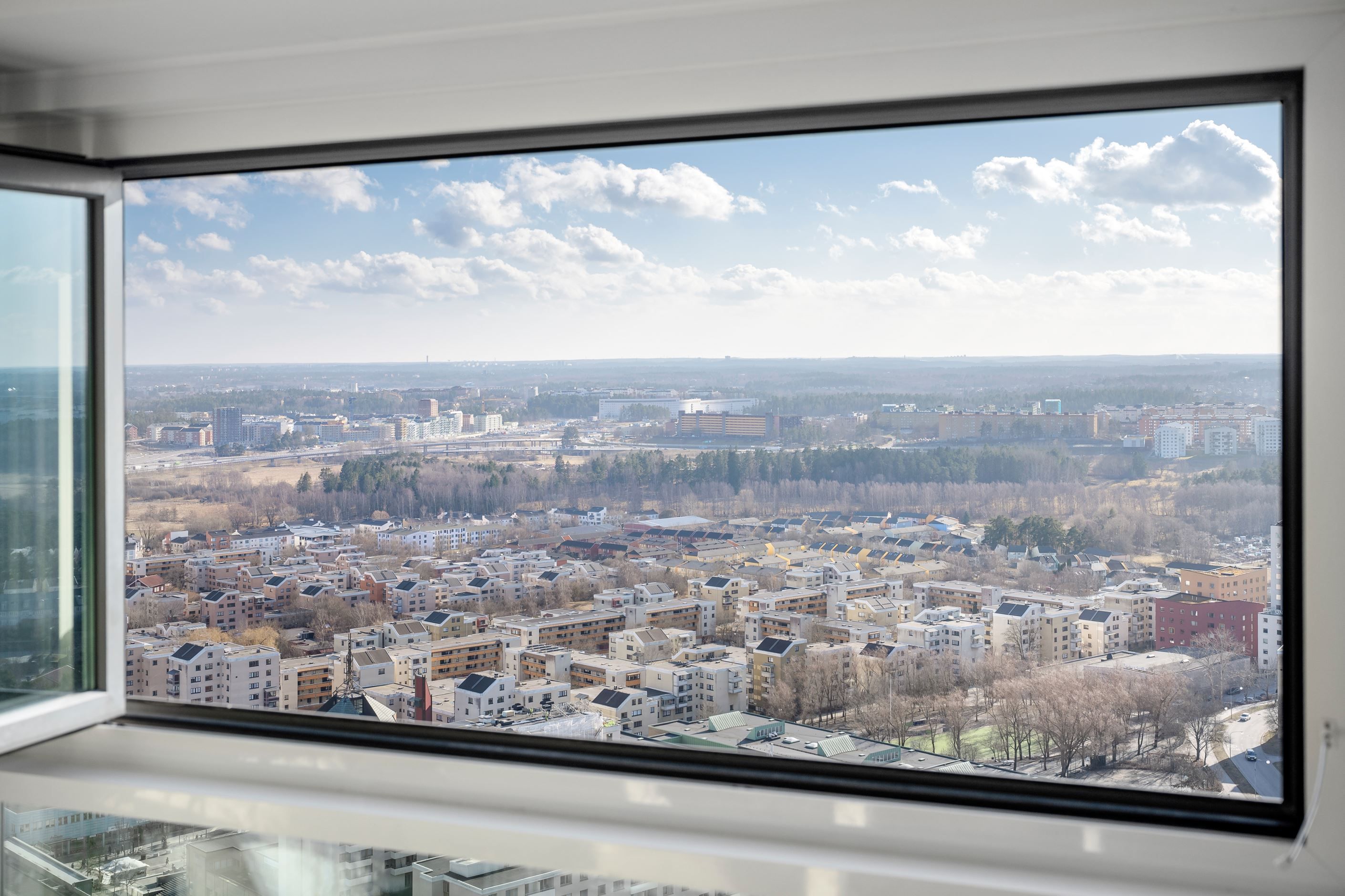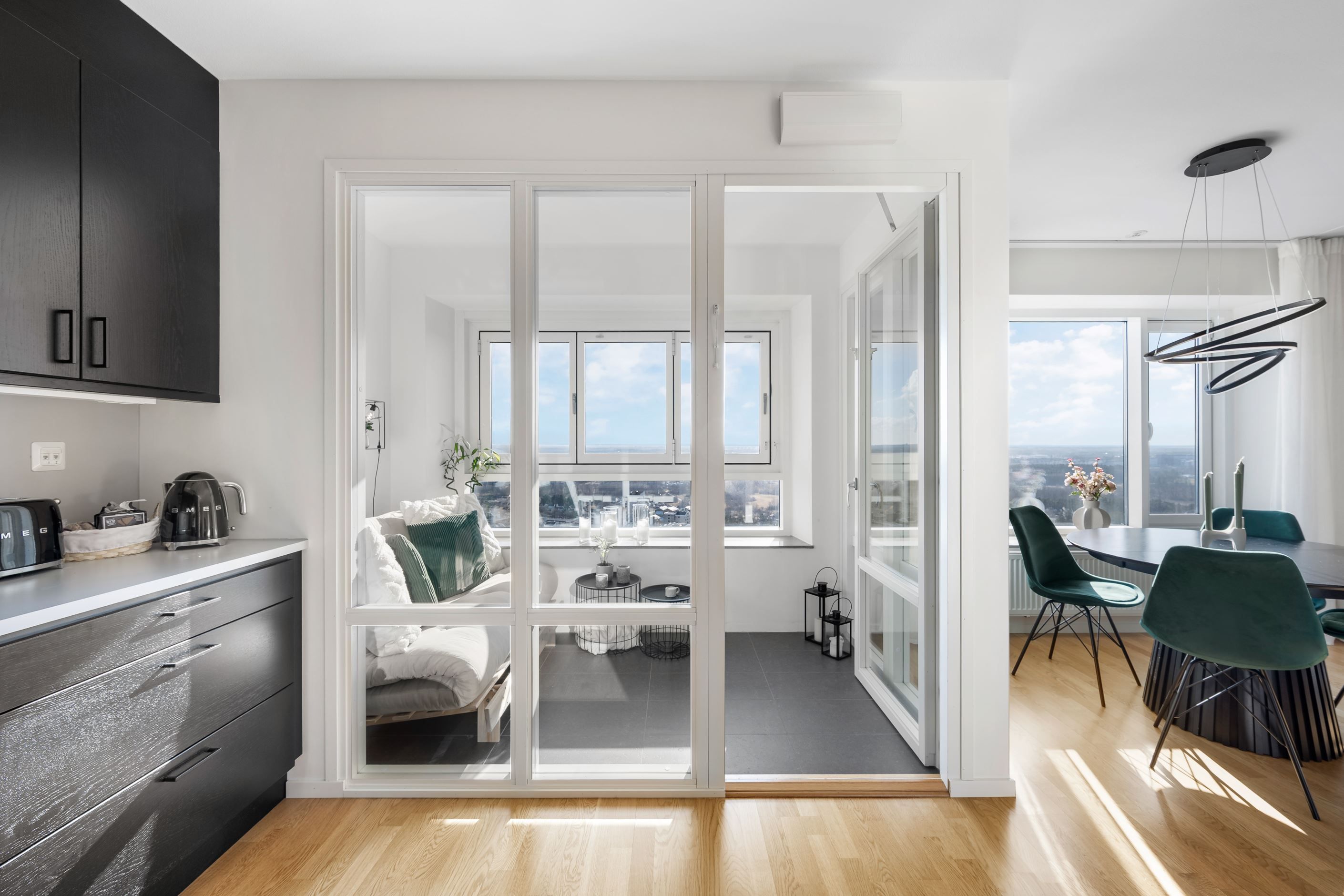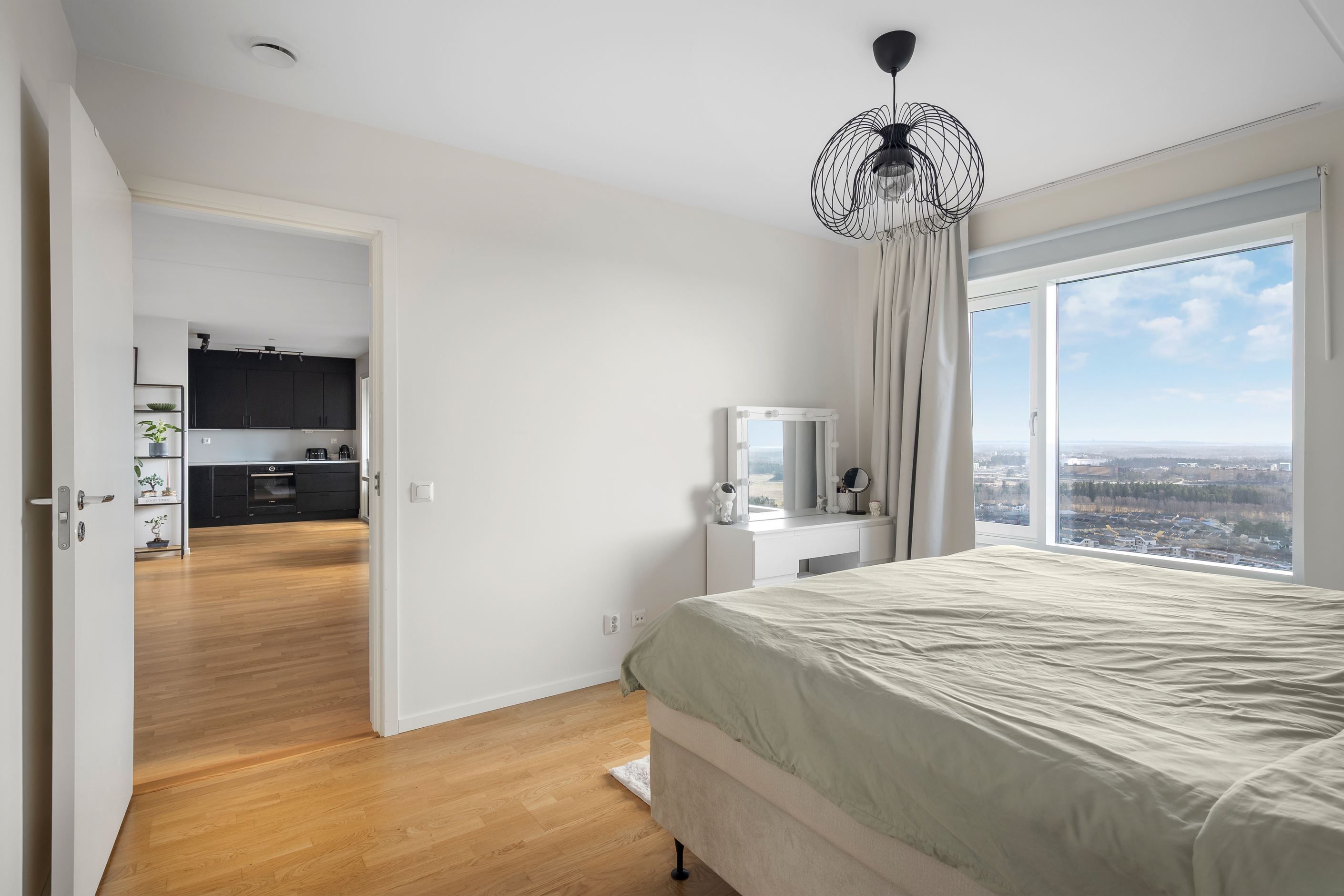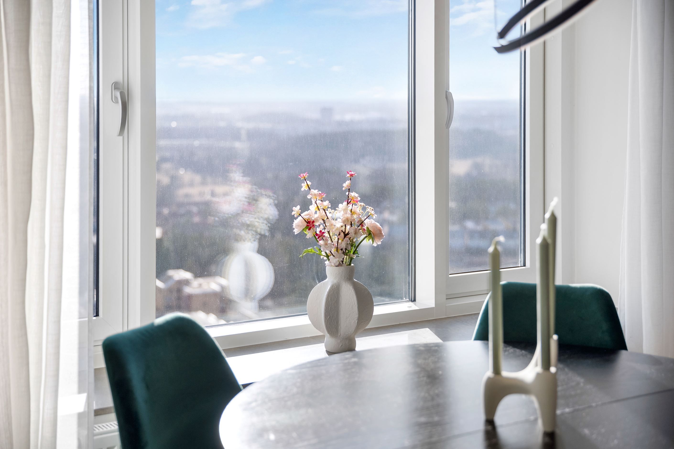 Här bor du högt upp på våning 32 i eftertraktat söderläge med en fantastisk utsikt över Stockholm och ett generöst ljusinsläpp året om. Bostaden är ljus och modern med social planlösning och genomtänkta materialval. Stora fönsterpartier förstärker känslan av rymd och tillsammans med parkettgolv skapas en stilren och trivsam helhet.