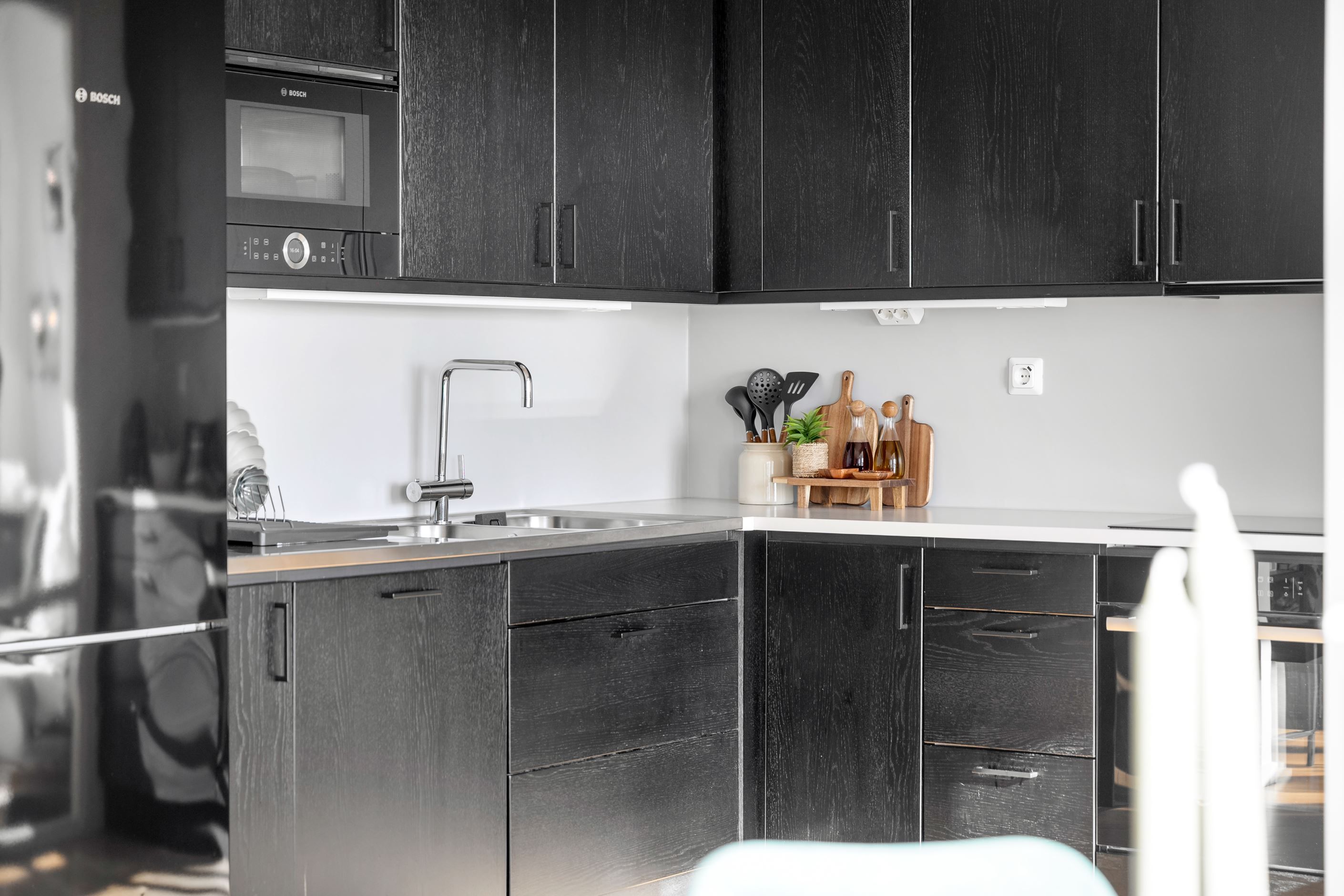 Det stilrena köket från Vedum är fullt utrustat med vitvaror från Siemens och ligger i öppen planlösning mot vardagsrummet. Perfekt för både vardag och umgänge, med gott om plats för både matgrupp och soffdel.