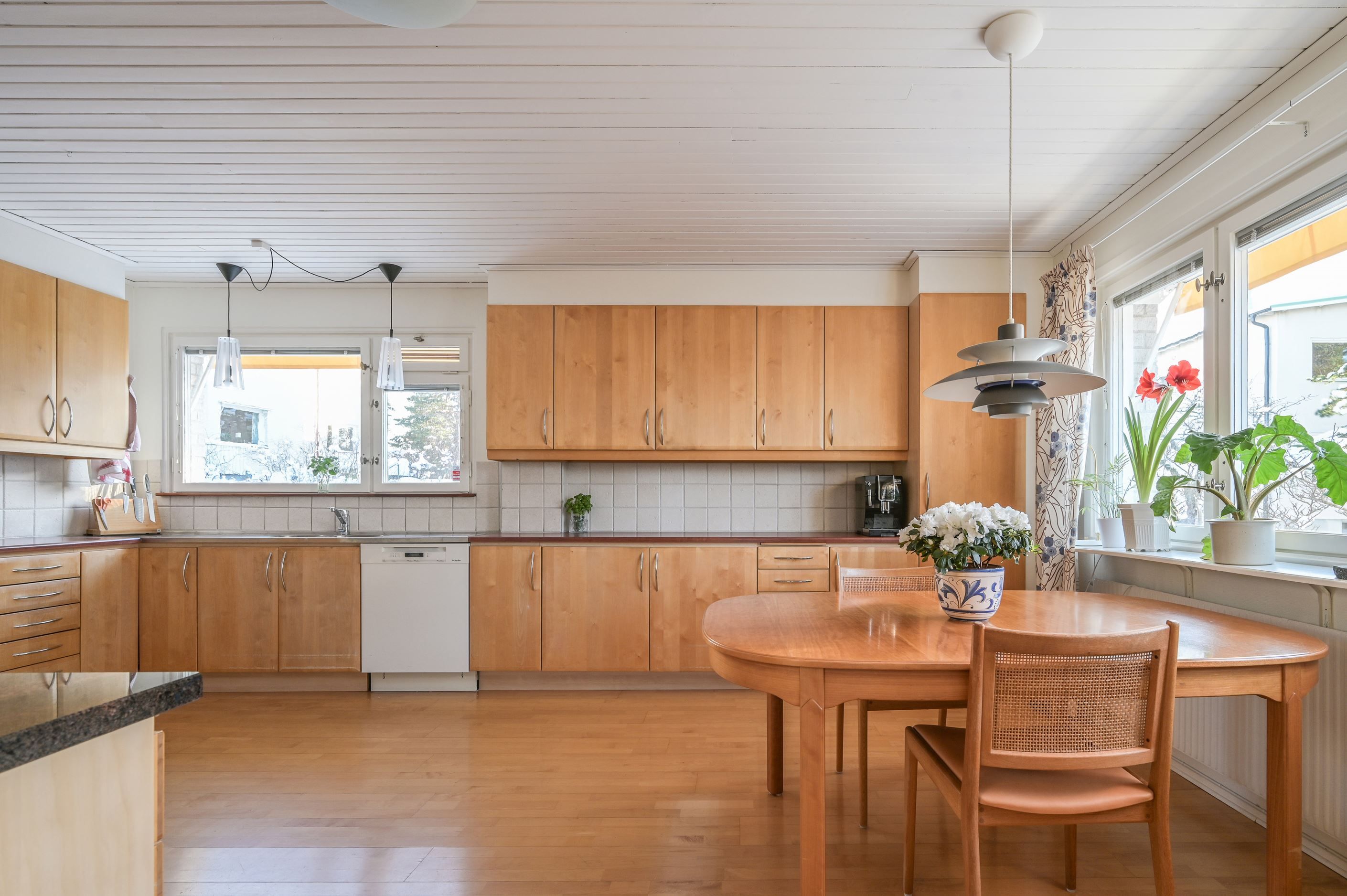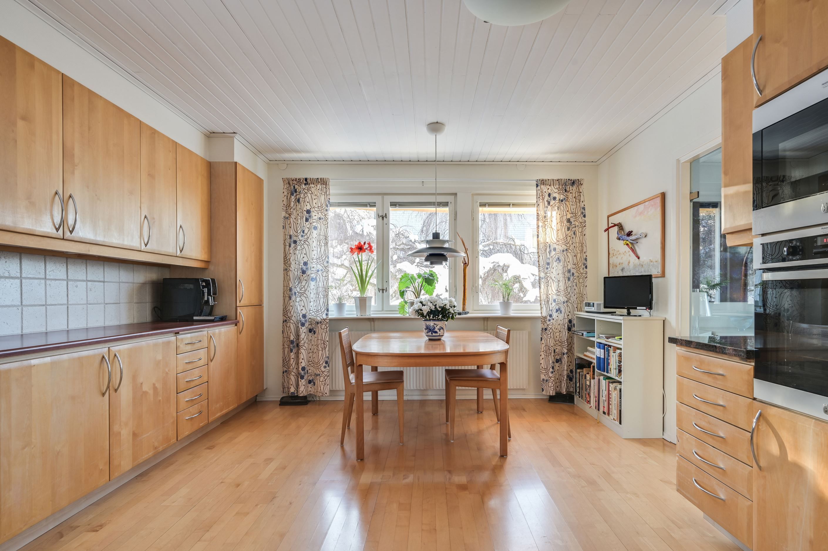 Stort VARDAGSRUM/SÄLLSKAPSDEL med integrerad MATSAL och en nästan heltäckande fönstervägg med välvt burspråk mot trädgården och terrassen. Ljuset blir magiskt. Fungerande öppen spis med motsvarande rundning som burspråket. Utgång genom Helglasad dörr till terrassen, som sträcker sig längs fasaden och har trappa av granit ner till trädgården. Terrassen har 4 vackra pelare. Fjärrmanövrerade markiser och infravärmare skyddar mot sol och förlänger säsongen. Helglasad dörr från matsalen in till köket. KÖKET rymmer stort matbord och har mycket gott om förvaring. Fem fönster i två väderstreck.
