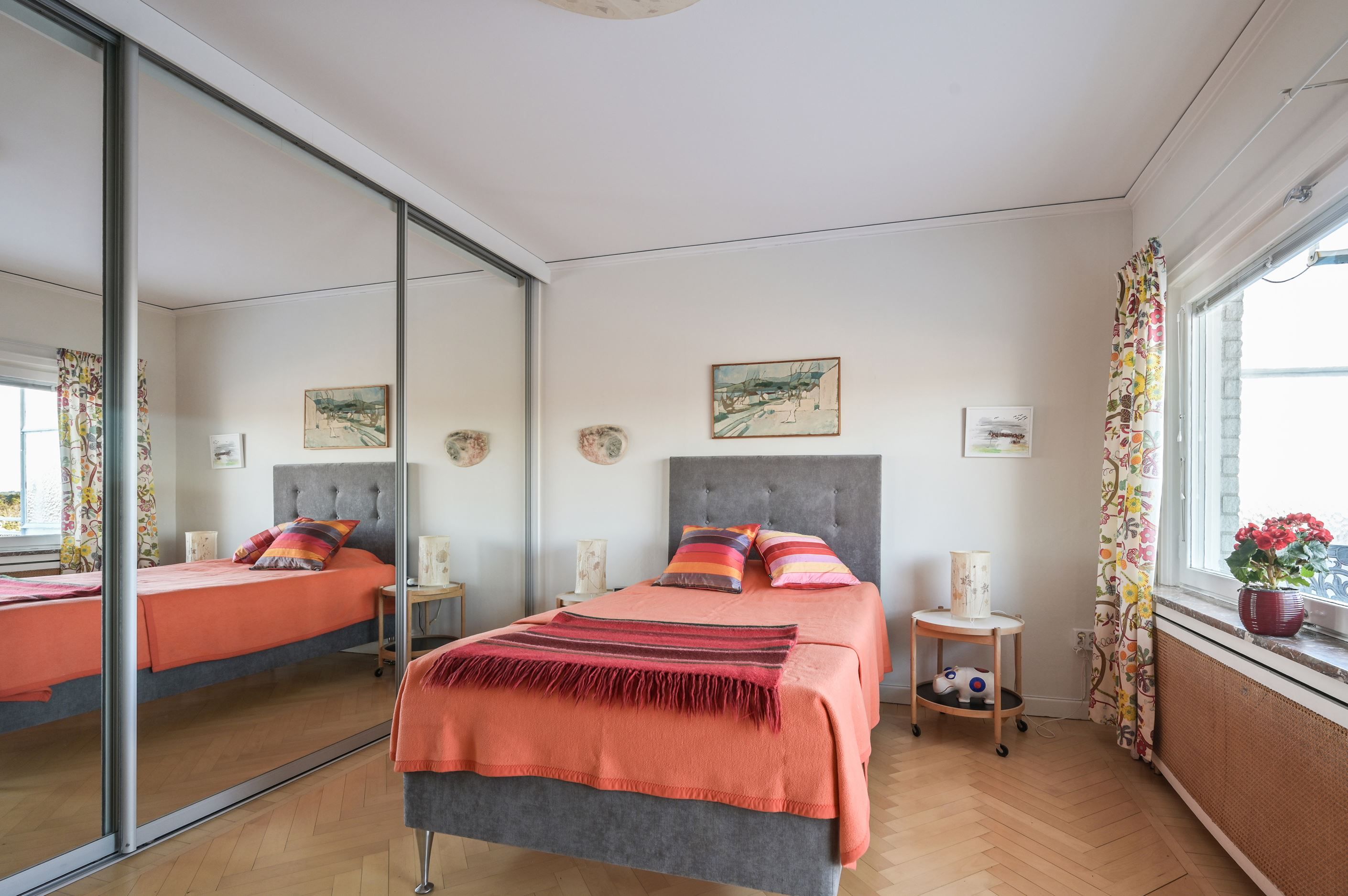 En svängd trappa i ek går upp till övre plan, där det finns 3 rymliga sovrum och ett stort allrum, på originalritningen kallat Herr-rum. Allrummet och det största sovrummet har varsin utgång till altanen, som sträcker sig längs hela fasaden och rymmer både stor sittgrupp och krukor med plantor. Sovrummen har fiskbensparkett av björk och i allrummet är det ekparkett i fiskbensmönster. I allrummet finns öppen spis med samma rundning som på fönstret i burspråket och där finns dörr in till hissen. På altanen finns fjärrmanövrerade markiser och infravärmare. Det finns gott om garderober och förvaring. BADRUMMET har golvvärme och är helkaklat. Har dubbla handfat, WC med spol-och torkfunktion och stor dusch med glasdörr.