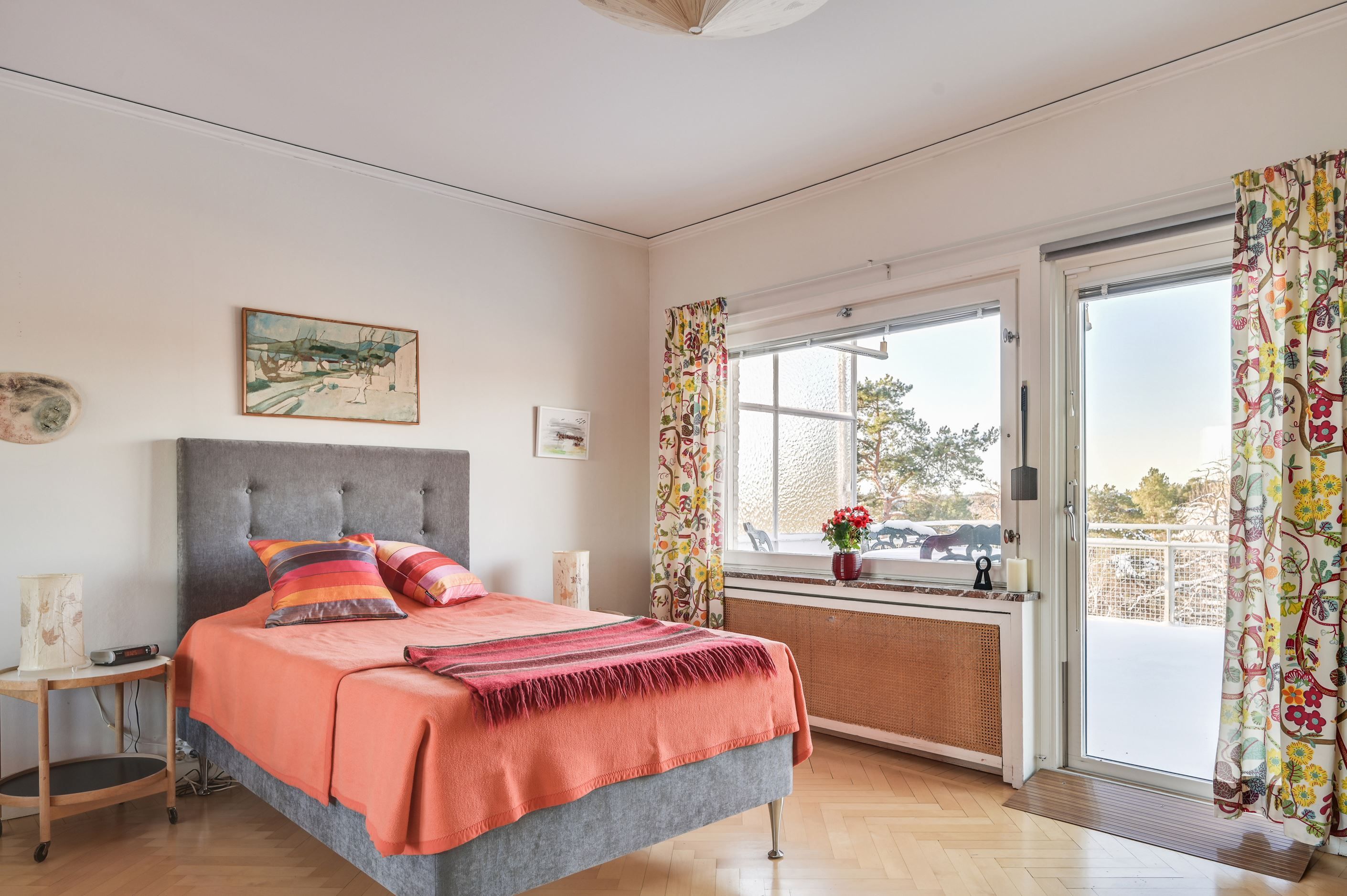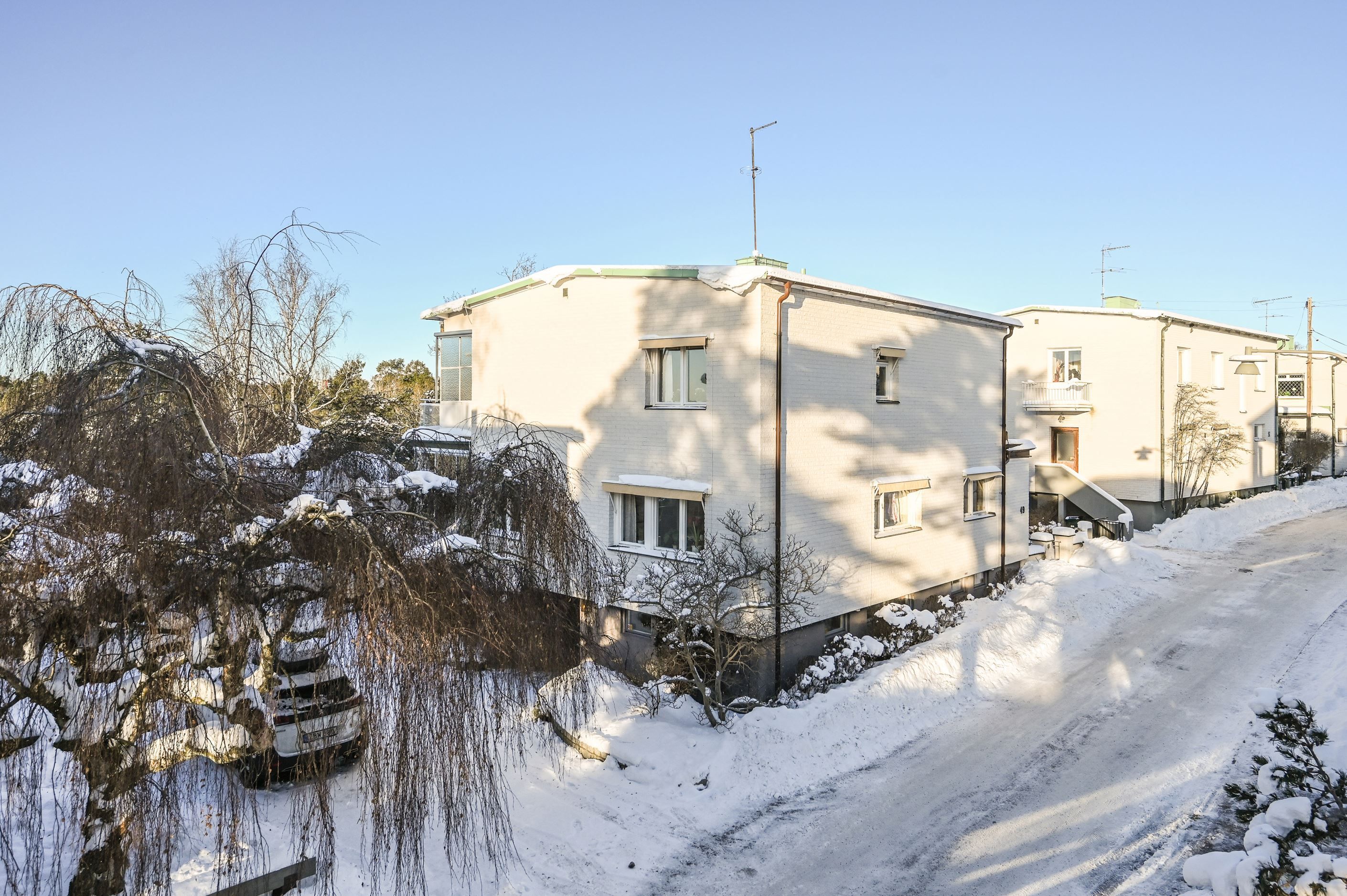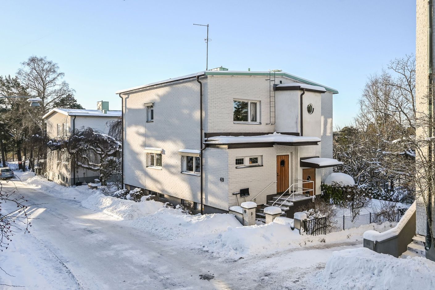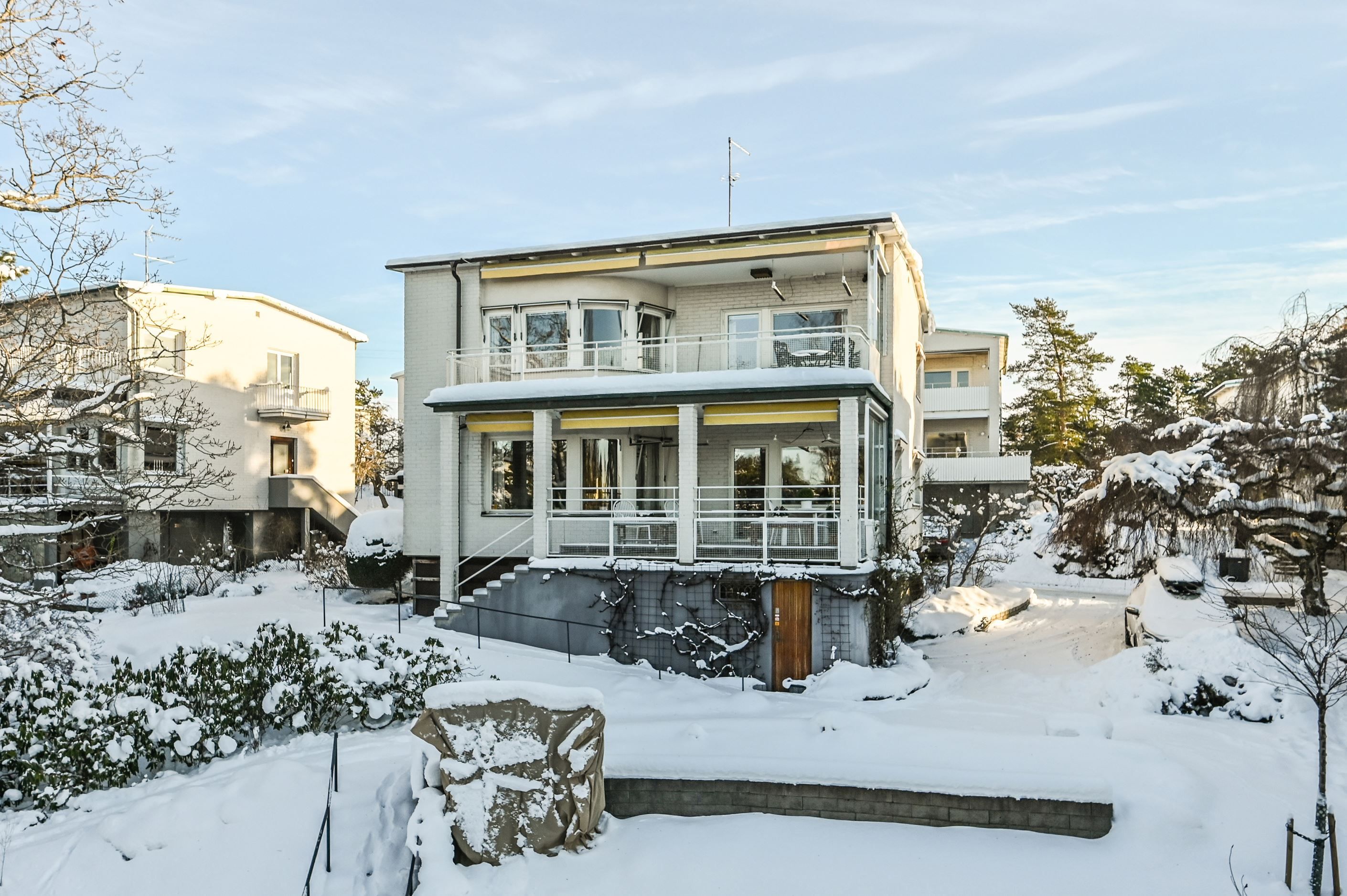 Stort högt beläget omsorgsfullt vårdat funkishus gränsande till allmänning. Högt fritt S/V-läge med Mälarglimt och fri skogsutsikt. Huset är byggt 1938 och en del vackra originaldetaljer finns bevarade. Interiören är luftig med välvda fönsterpartier, vita väggar, vackra parkettgolv och trappor i ek. Trädgården har rabatter med perenner som blommar under hela säsongen, och den är perfekt för barn att busa och leka i. Bärbuskar växer på gränsen mot allmänningen, som sträcker sig ner genom skogen till Blackebergsvägen. På båda våningsplanen finns stora längsgående terrasser med sol hela dagen och från den nedre leder en granittrappa ner till trädgården. Också i den kuperade trädgården finns trappor i granit mellan de olika nivåerna.